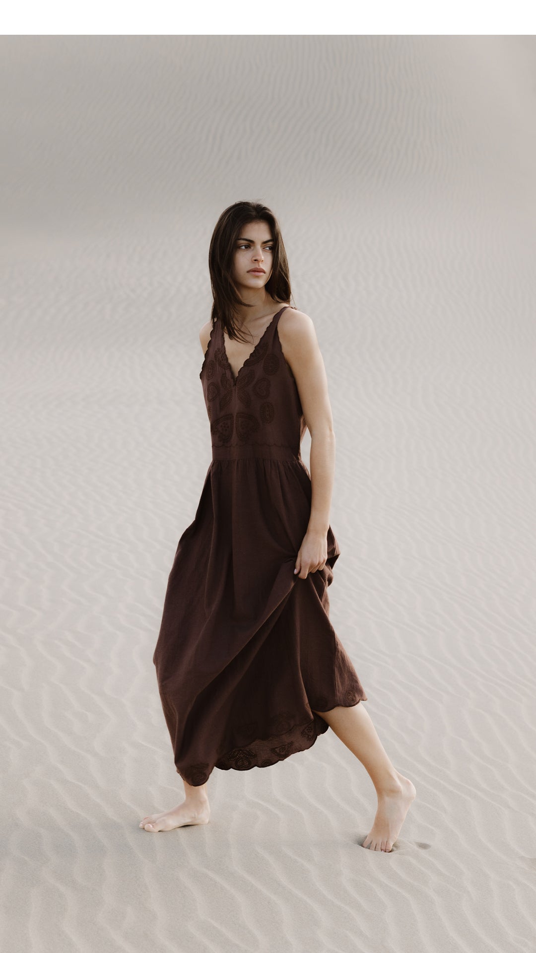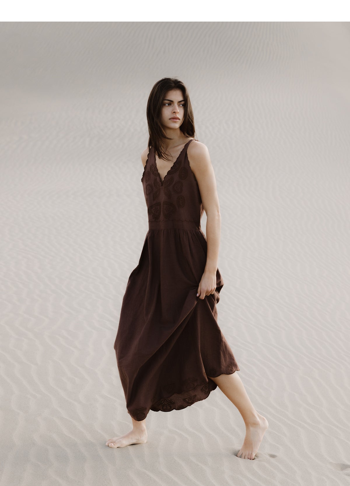 Vestido Bordados Festoneado Marrón
