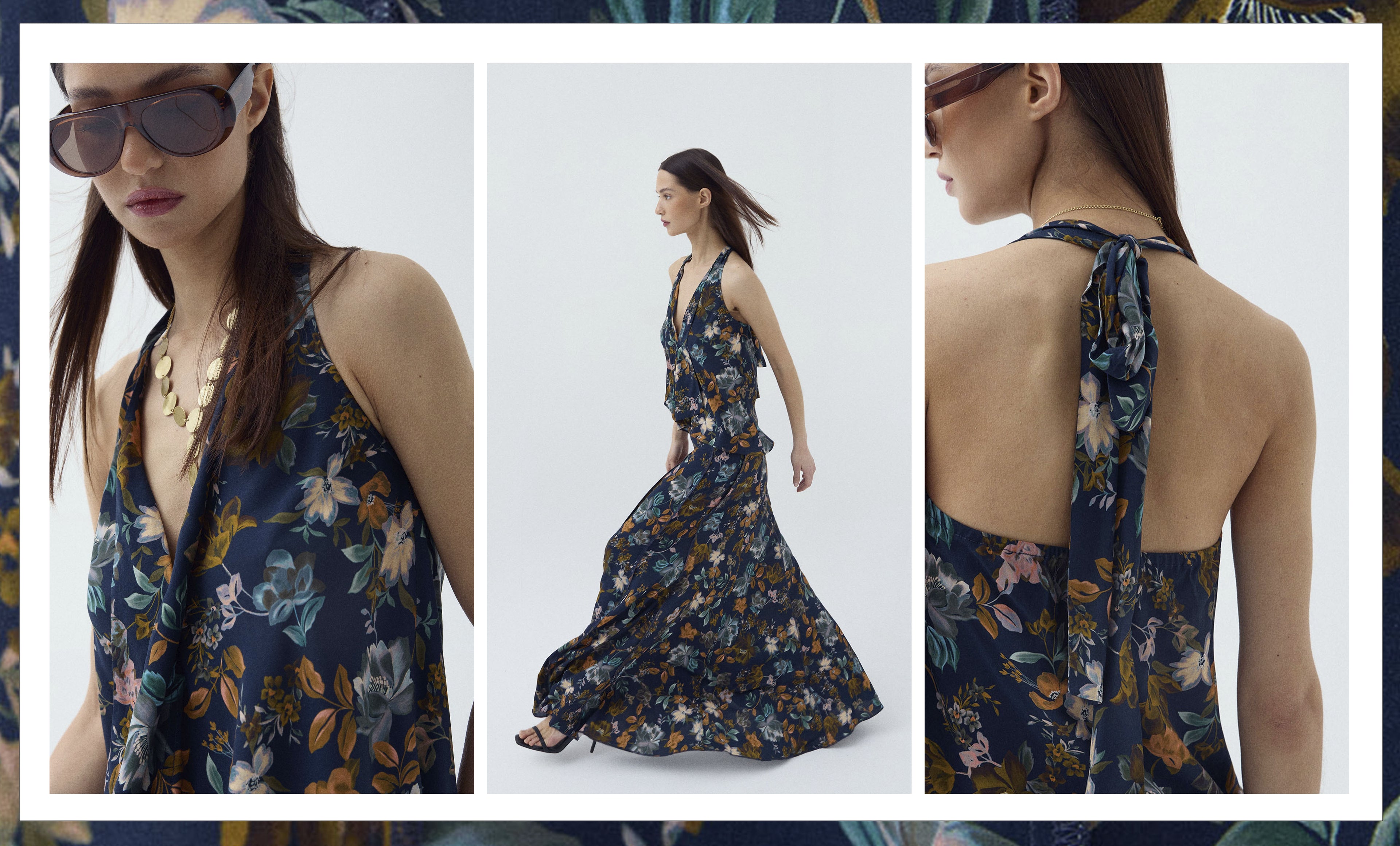 • Falda Larga Nervios Estampado Floral Azul Marino