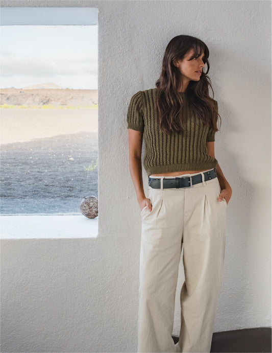 • Green Openwork Short Sleeve Knit Top