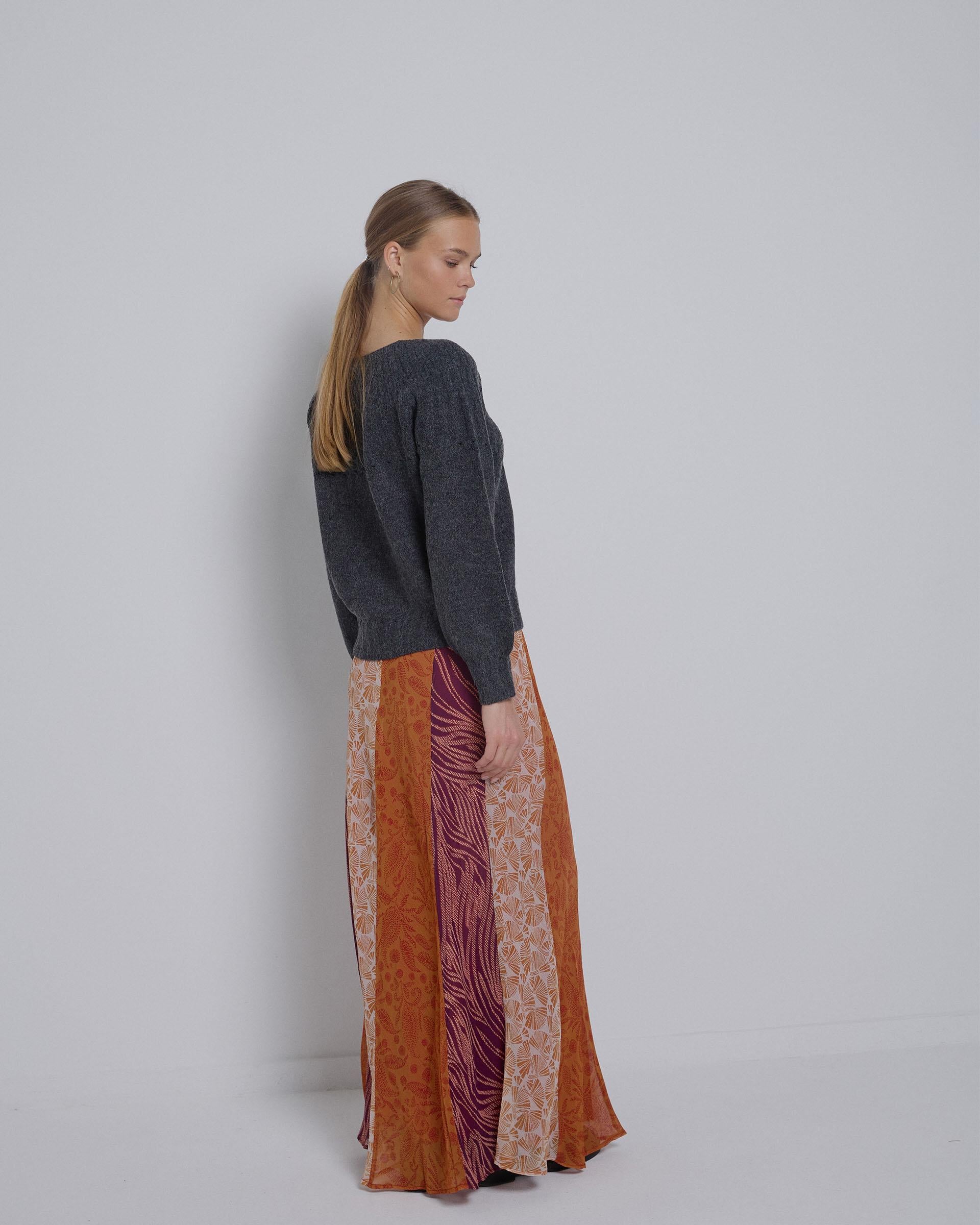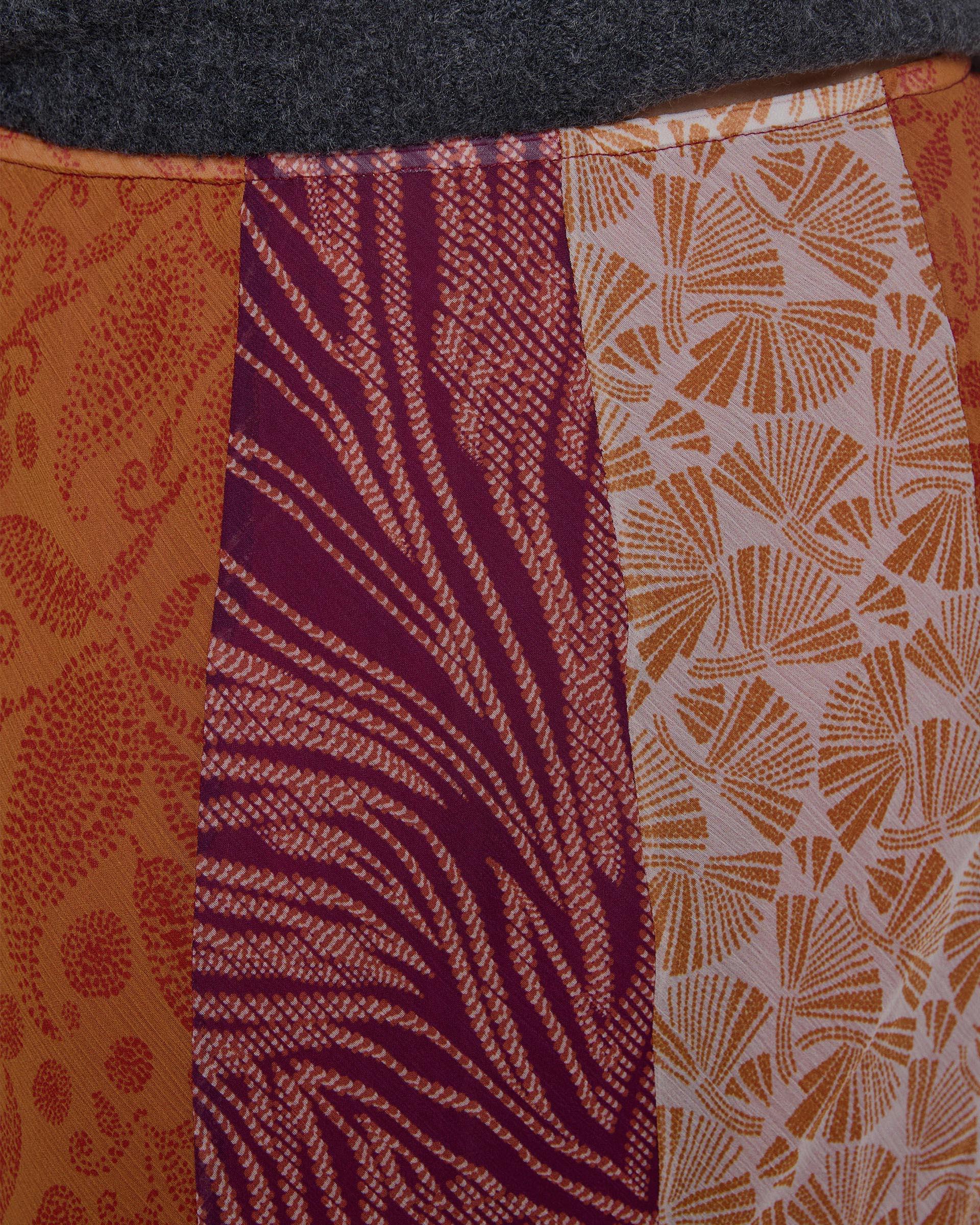 Straight skirt with different patchwork prints in orange and purple tones with a side zipper.