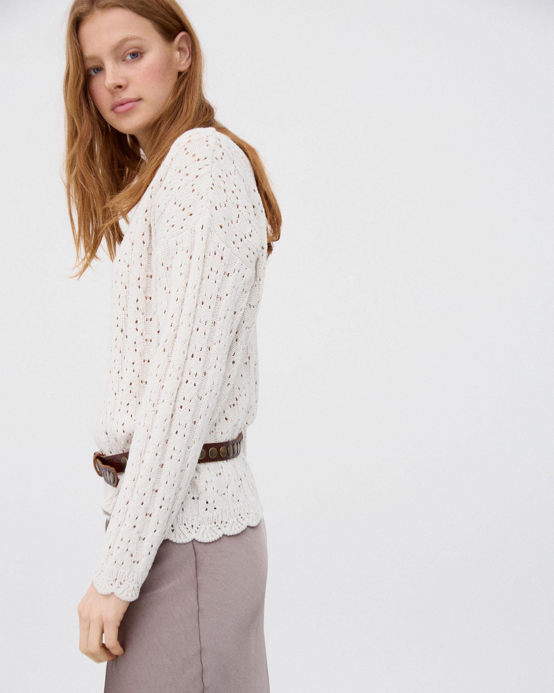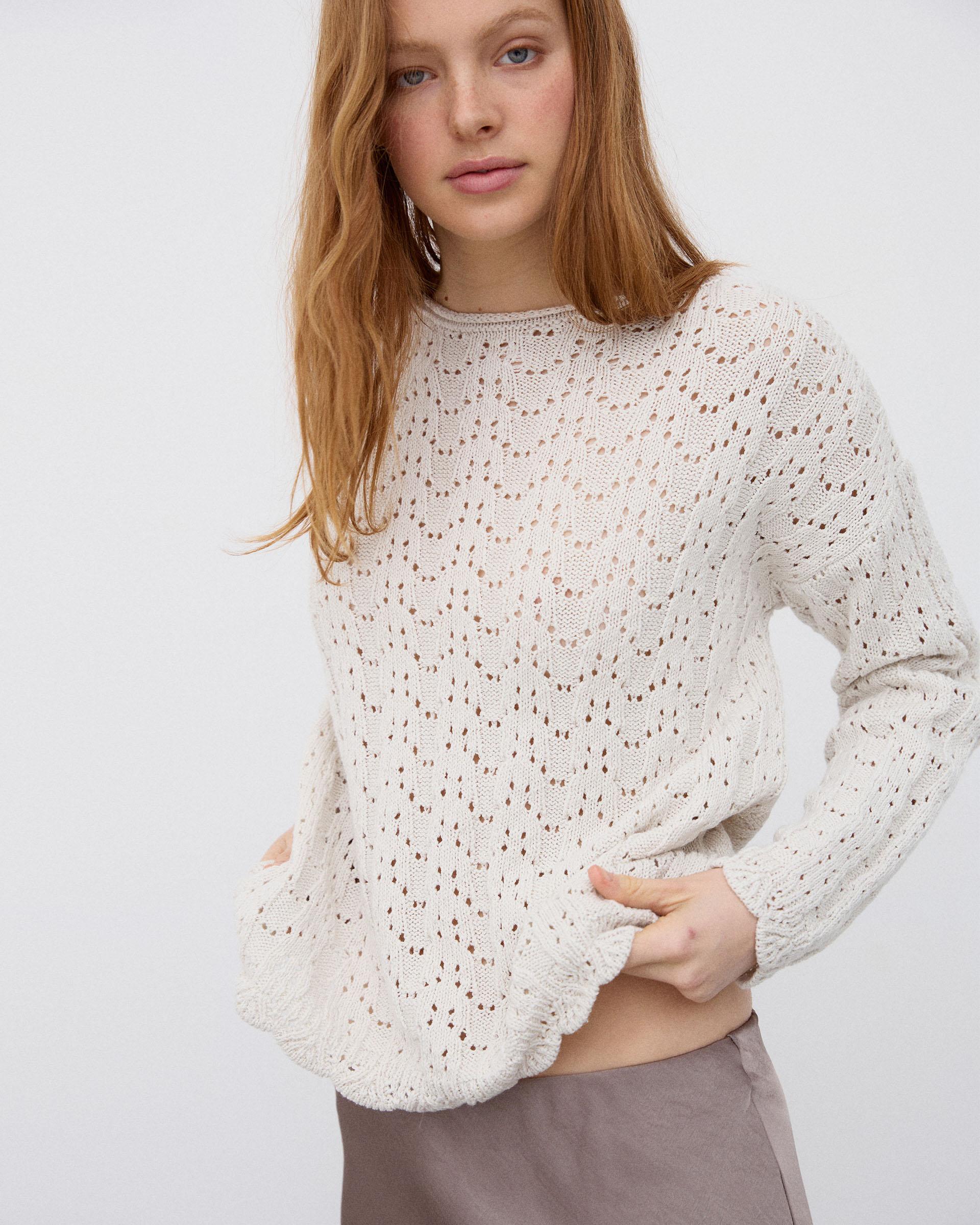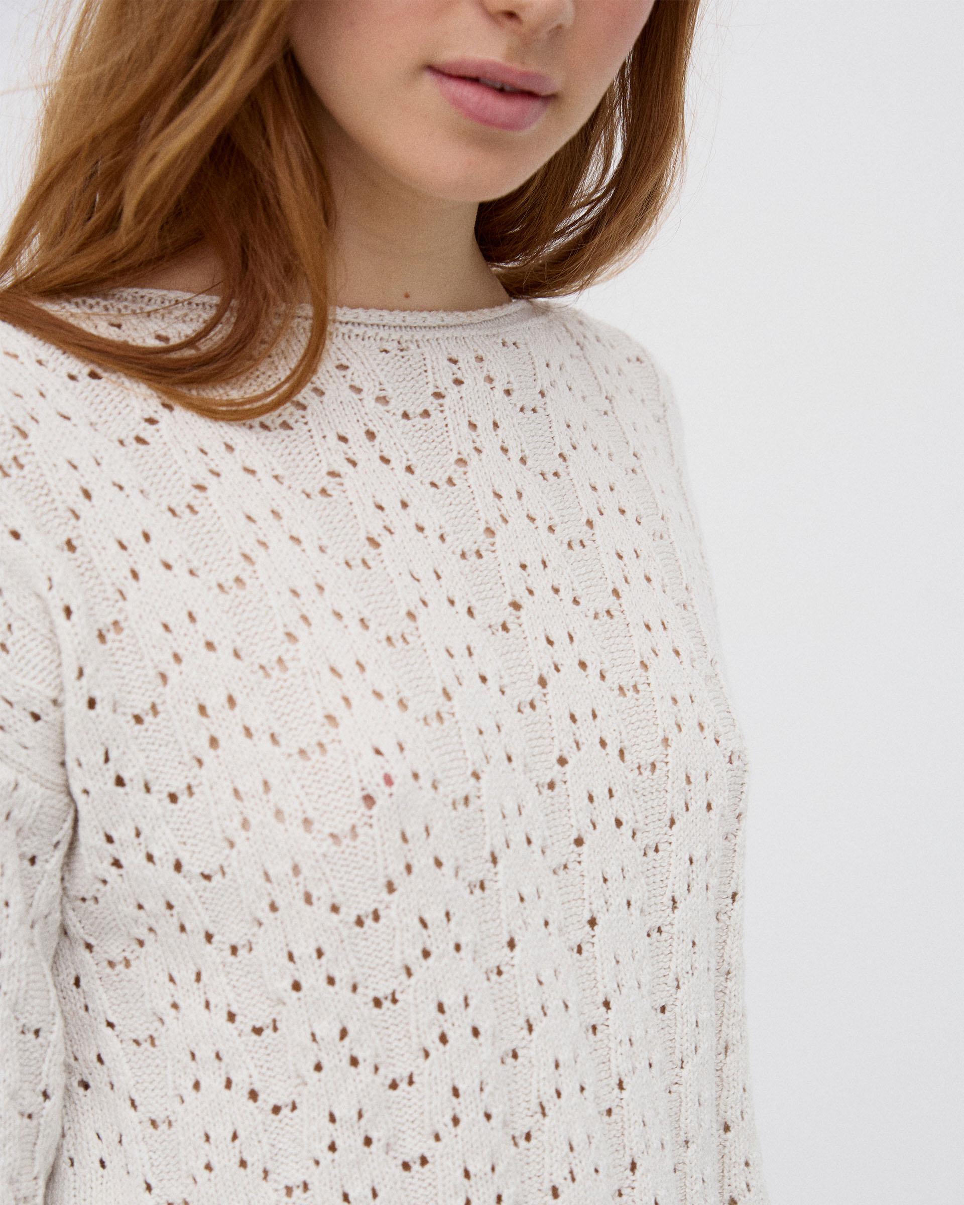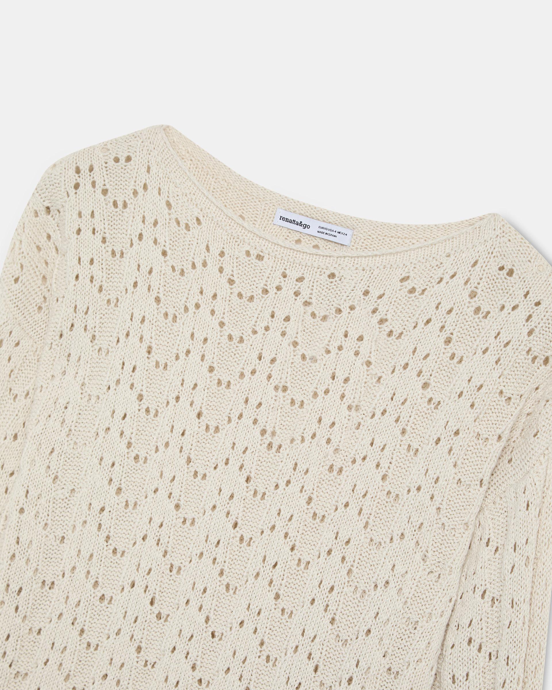 Jersey de punto con detalle de calados y cuello redondo, en color crudo.