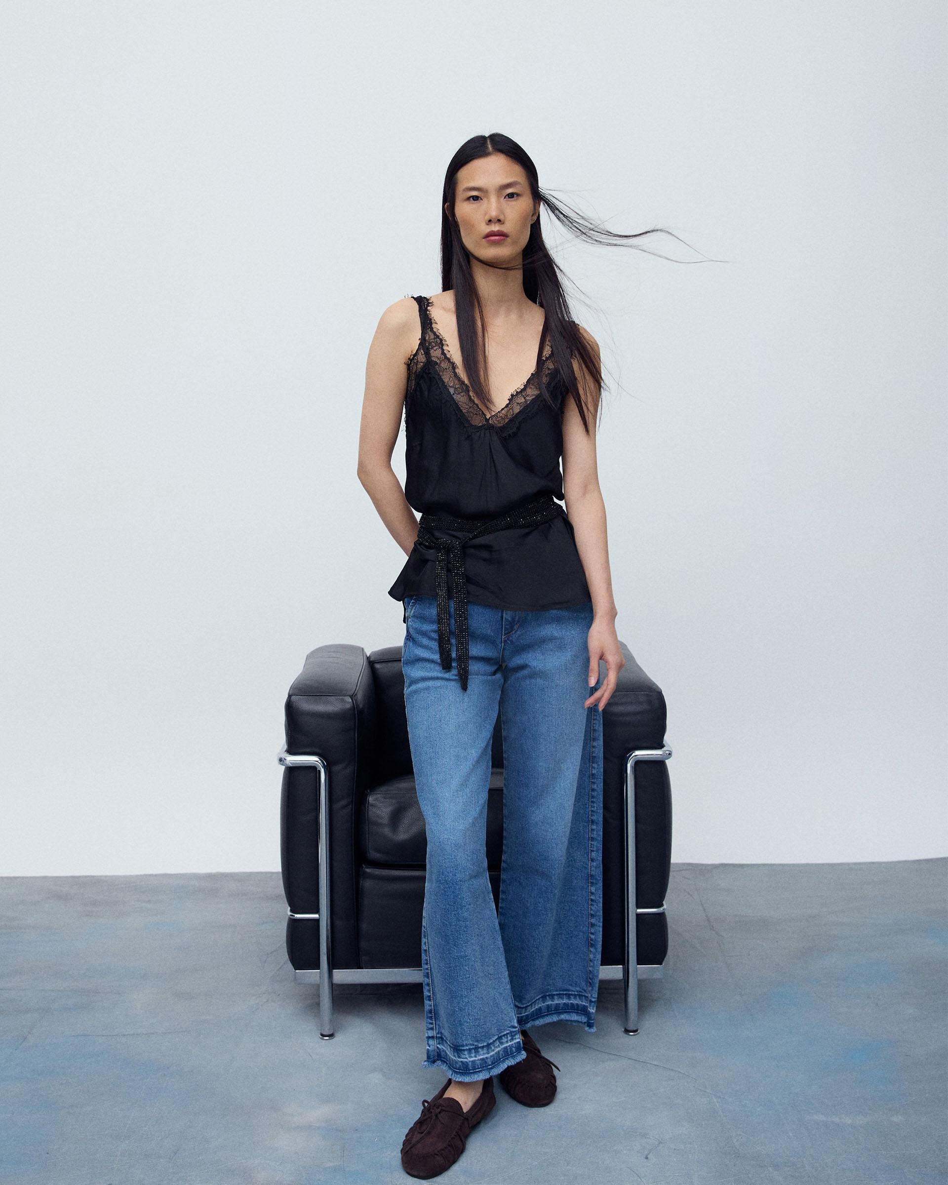 Blue midi-length straight flare jeans with four pockets, chain hem and flap back pockets.