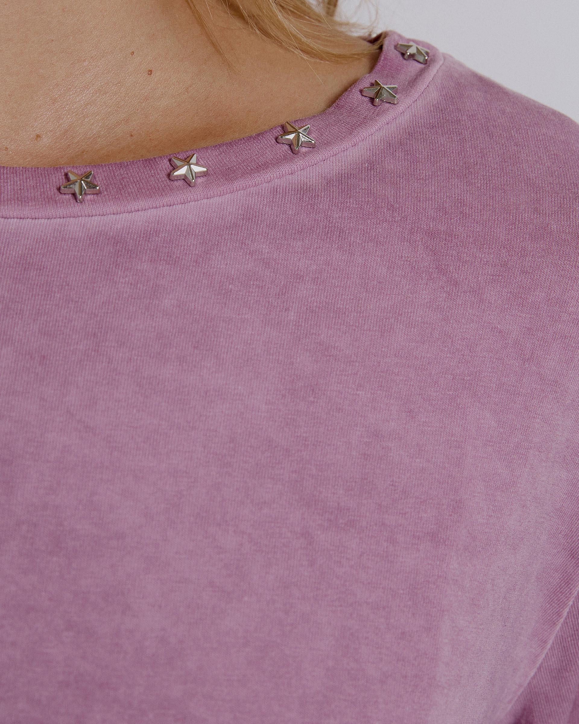 Pink long-sleeved T-shirt with a round neck and star stud detail.