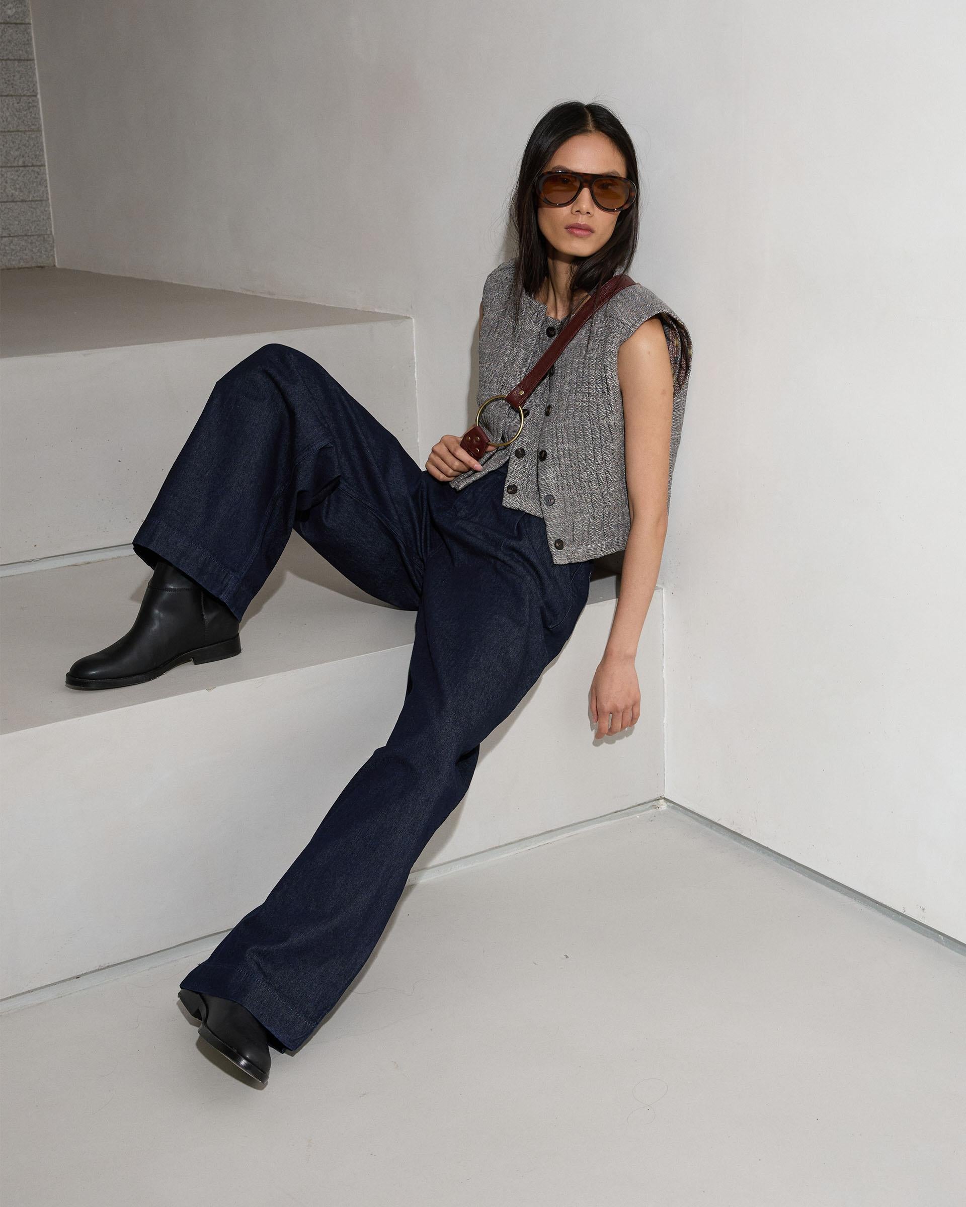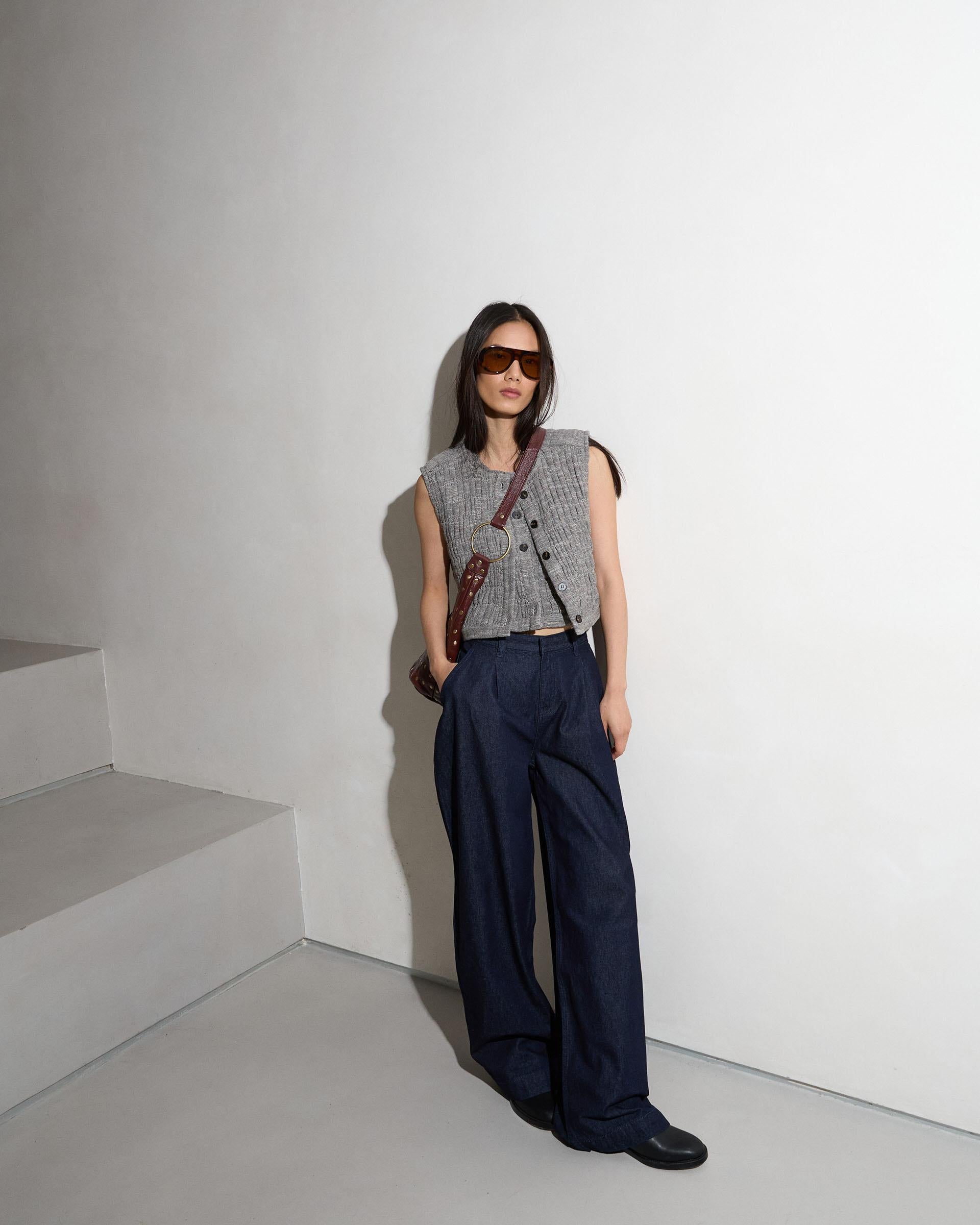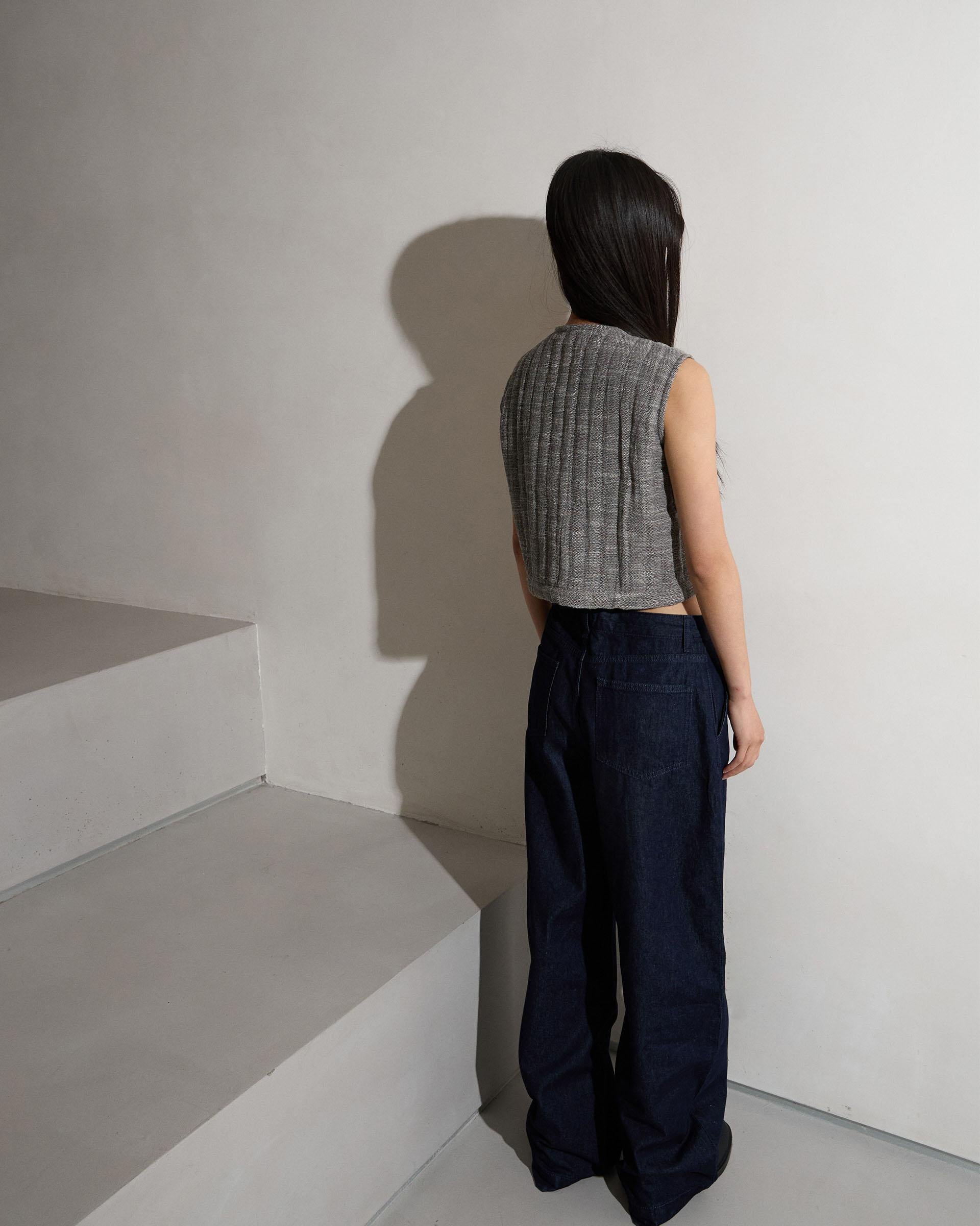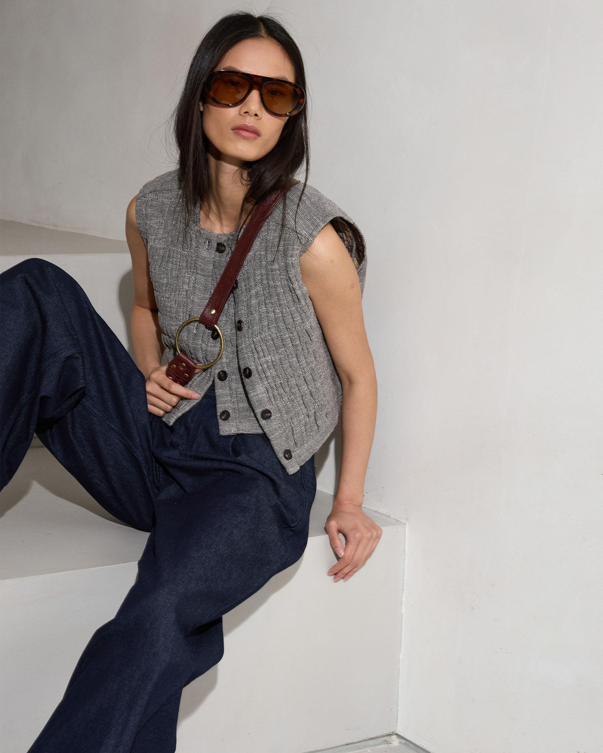 Quilted vest with herringbone print in taupe, round neck and buttons on the front.