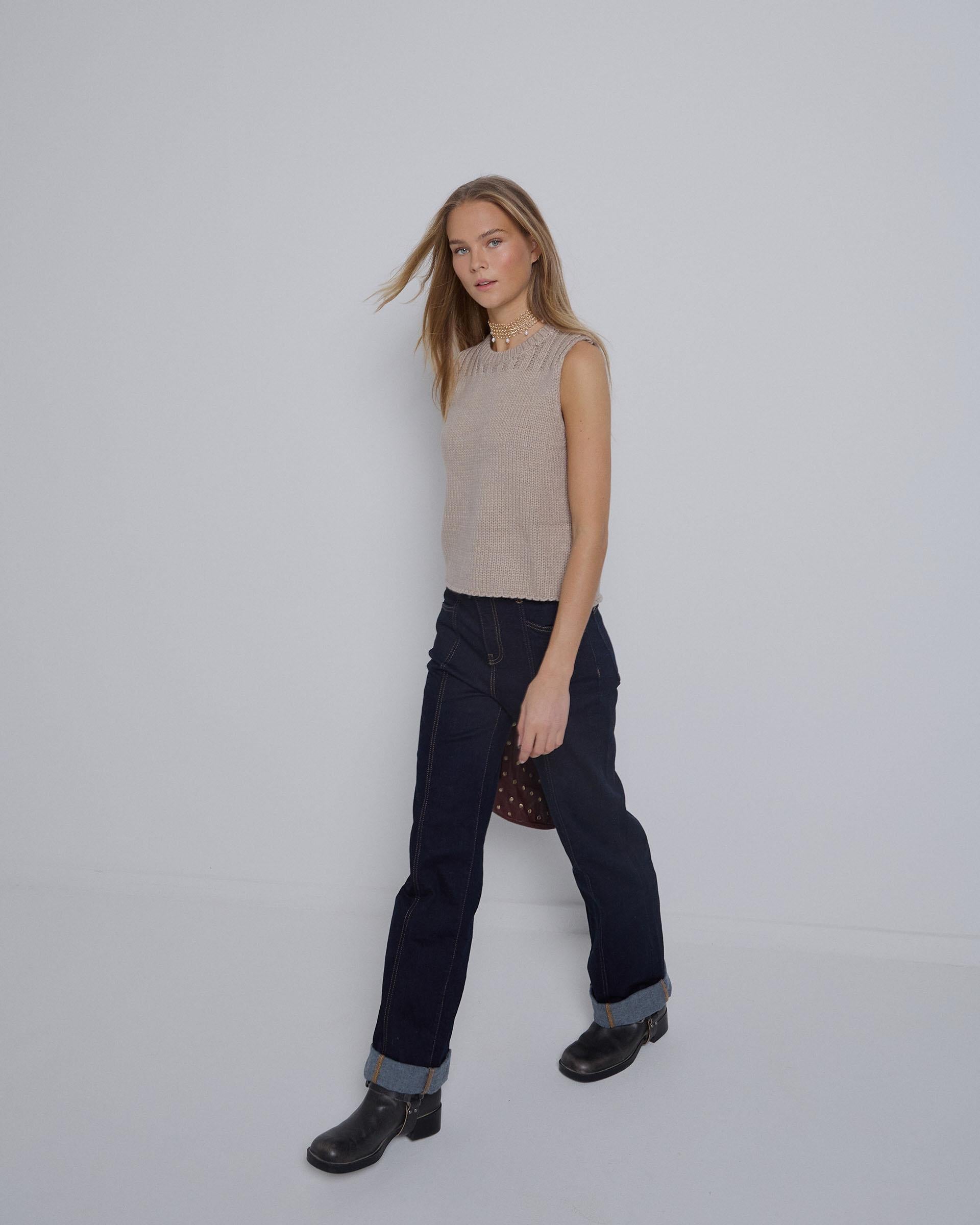 Beige sleeveless knitted vest.
