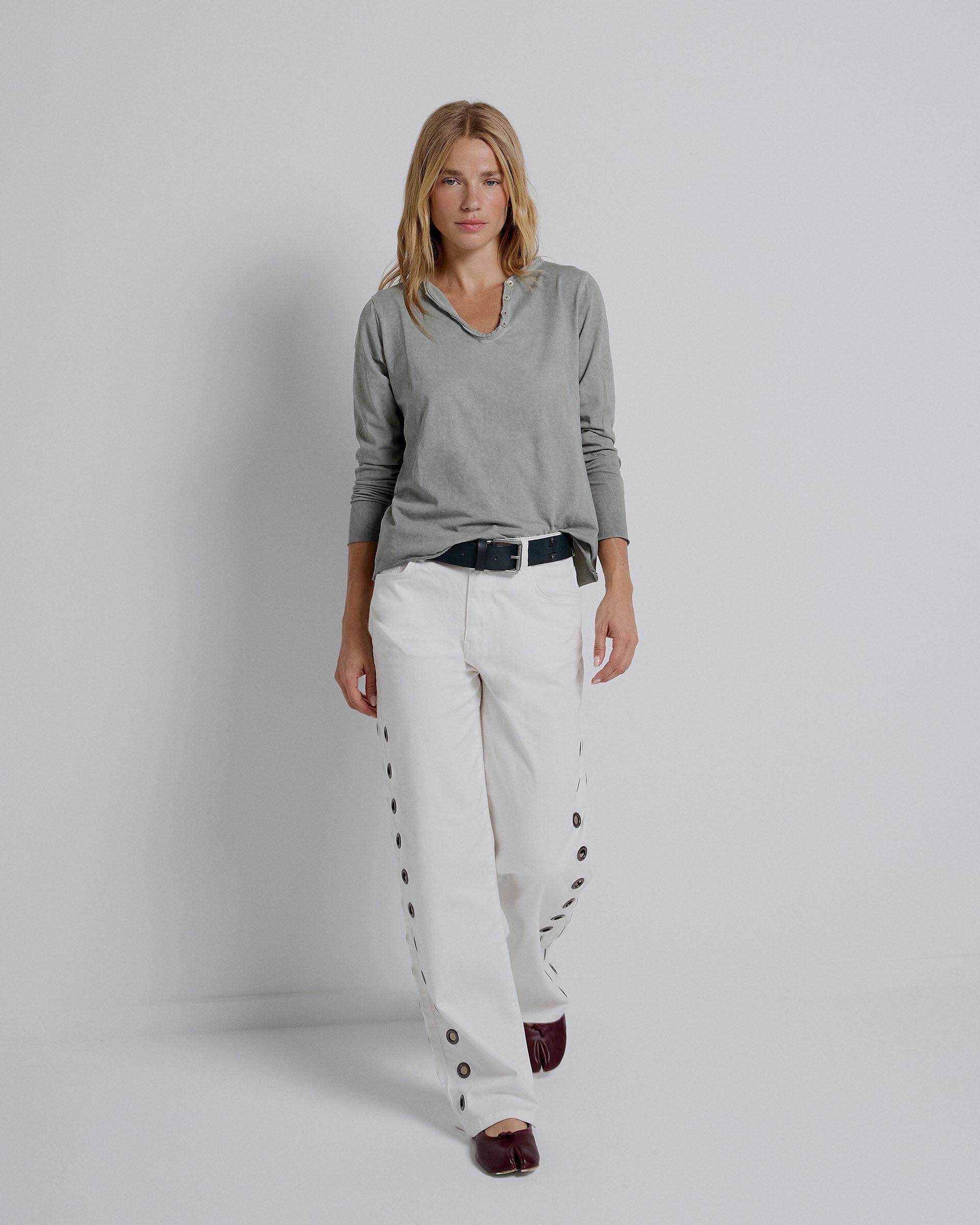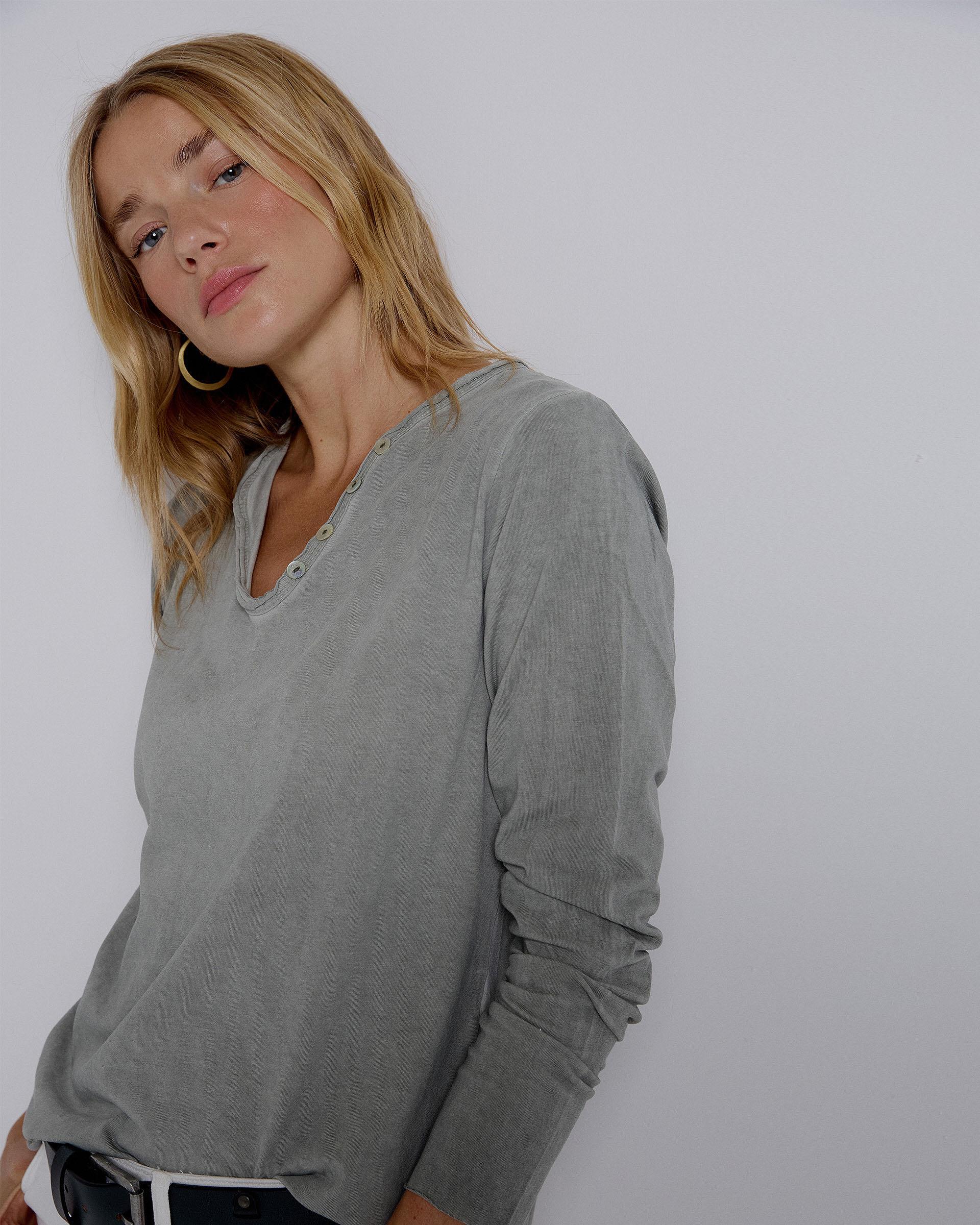 Long-sleeved green T-shirt with a V-neck and button detail.