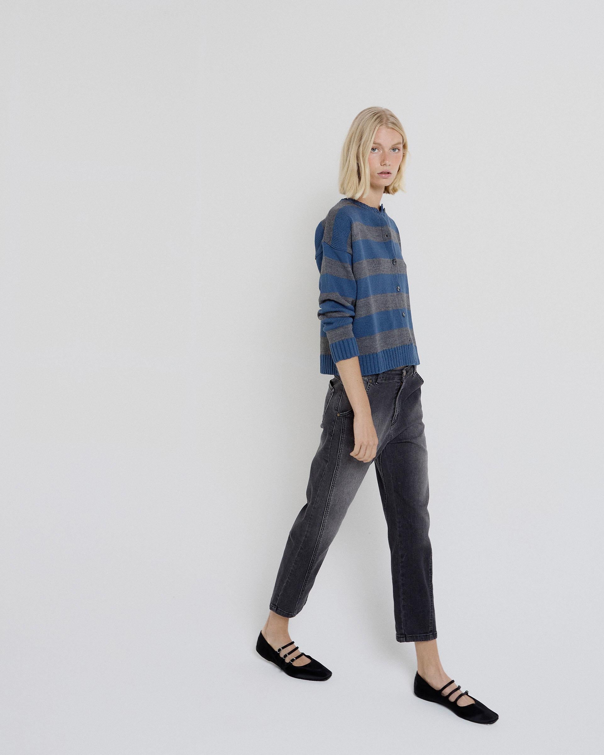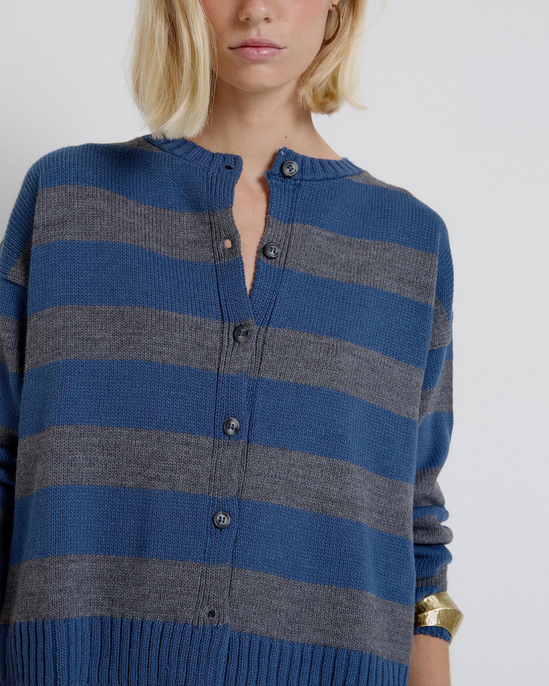 Horizontally striped knitted jacket with a round neck and front button closure.