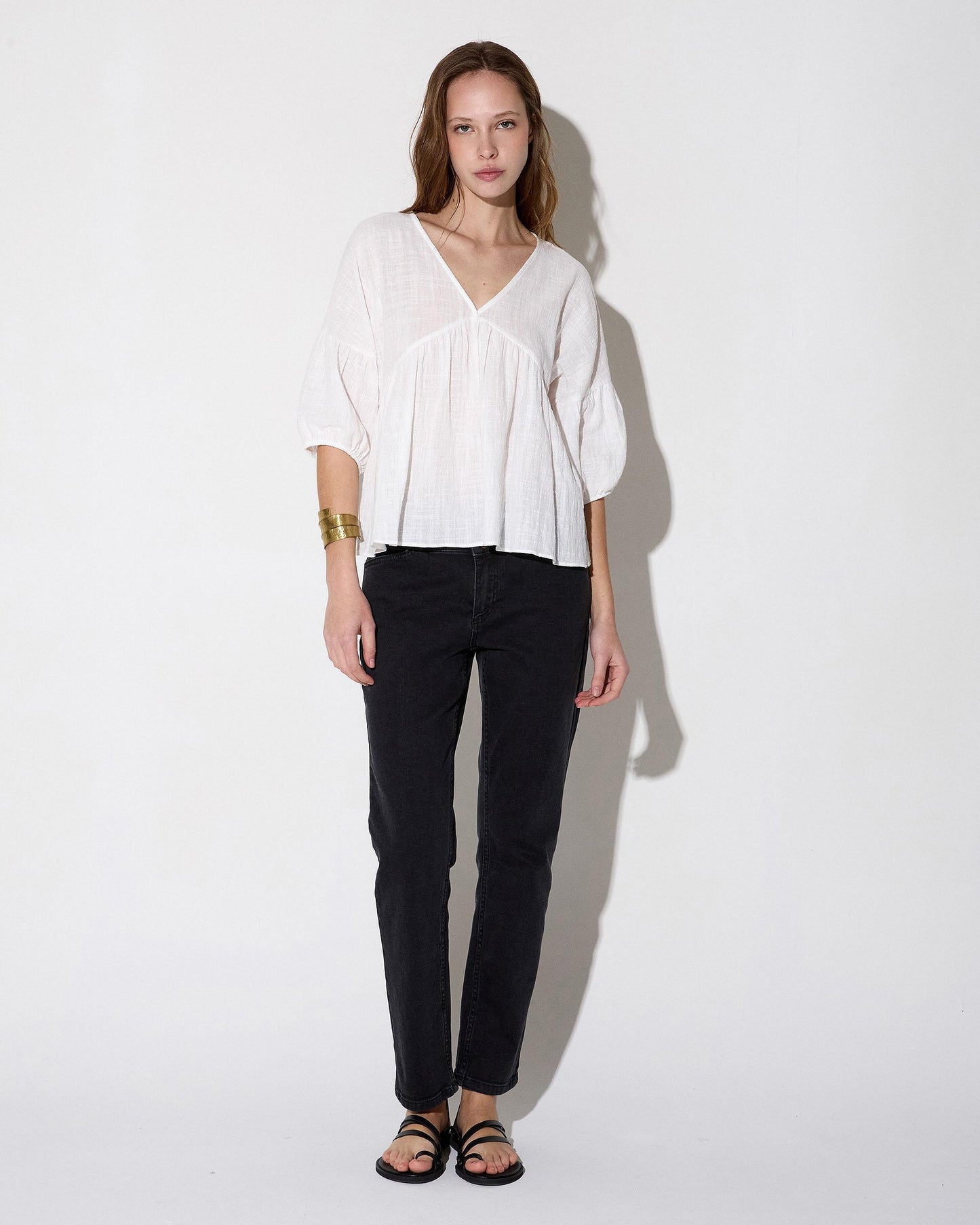 • Honeycomb Blouse with Ruffled Neck and Grey Trim