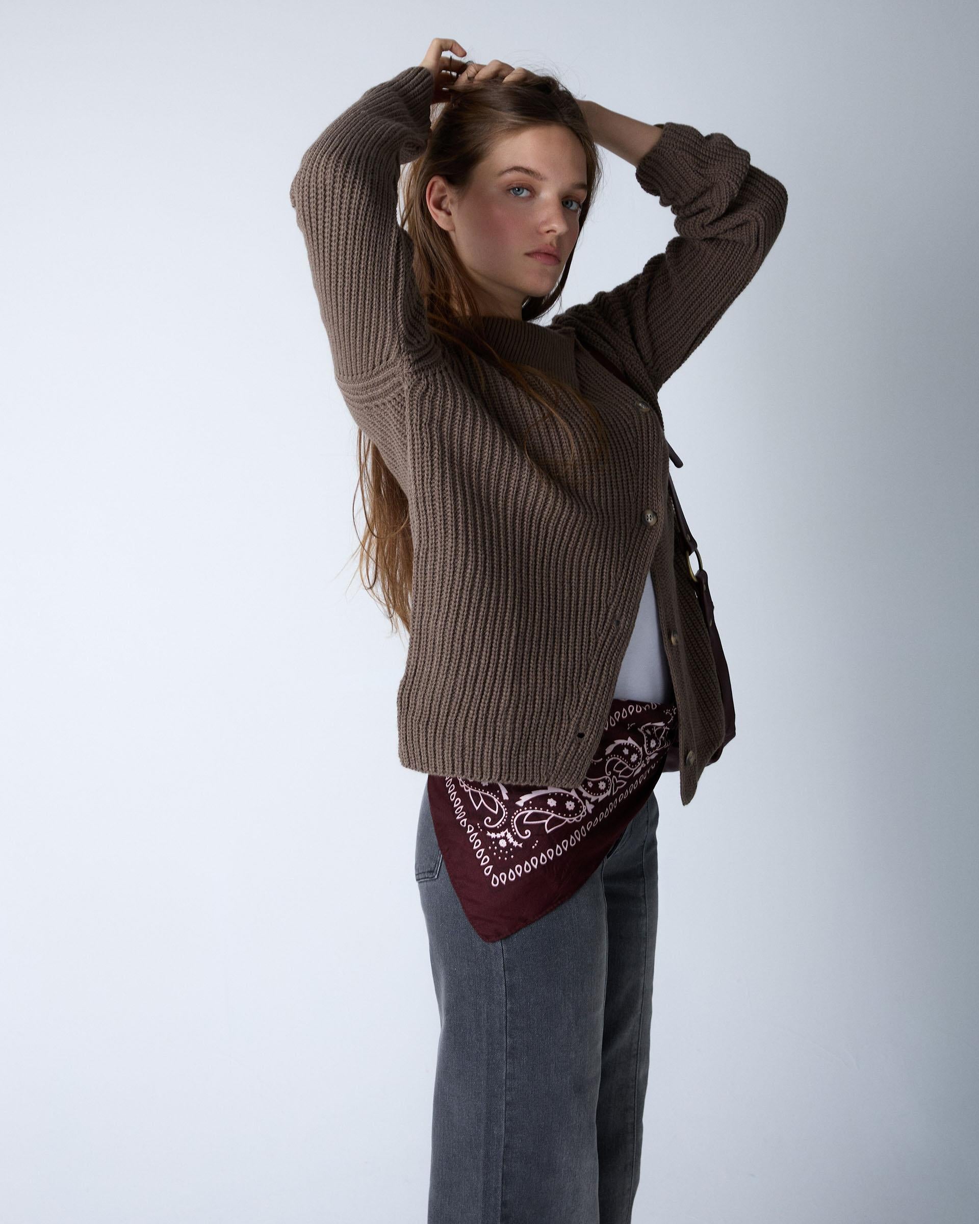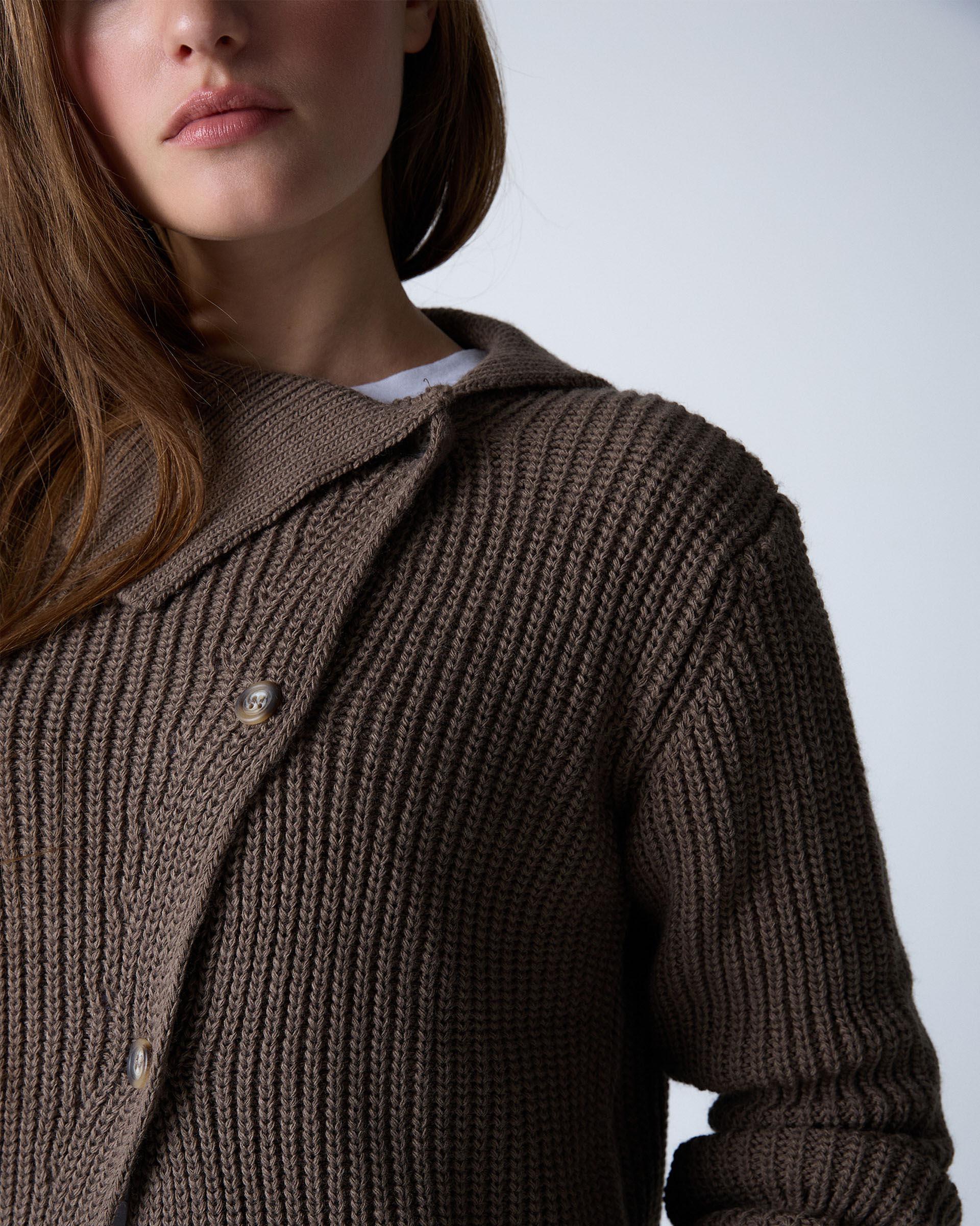 Knitted jacket with a wide polo collar and diagonal buttons.