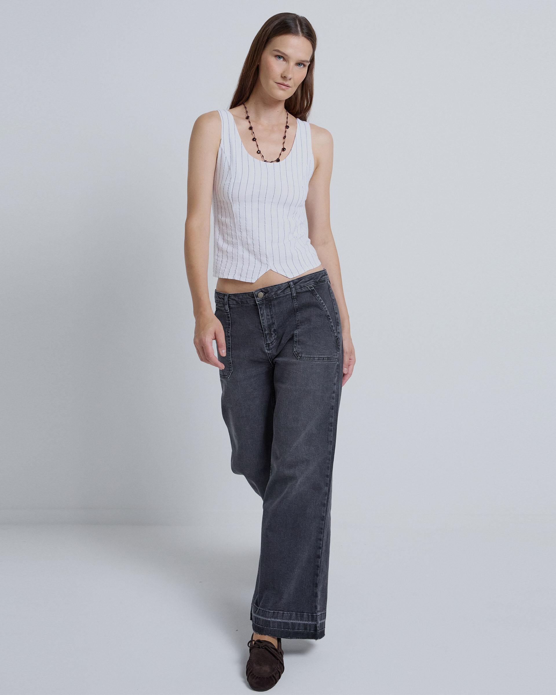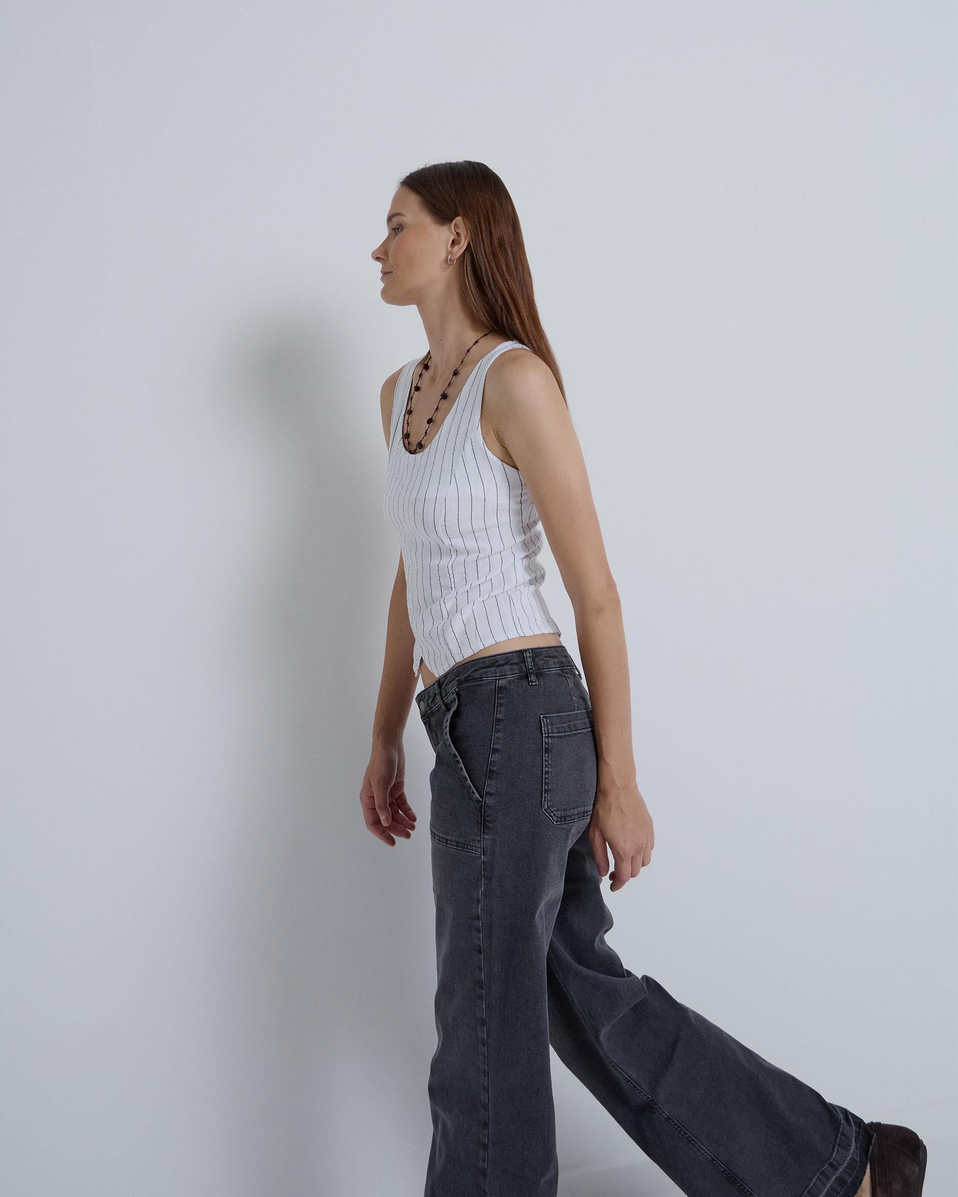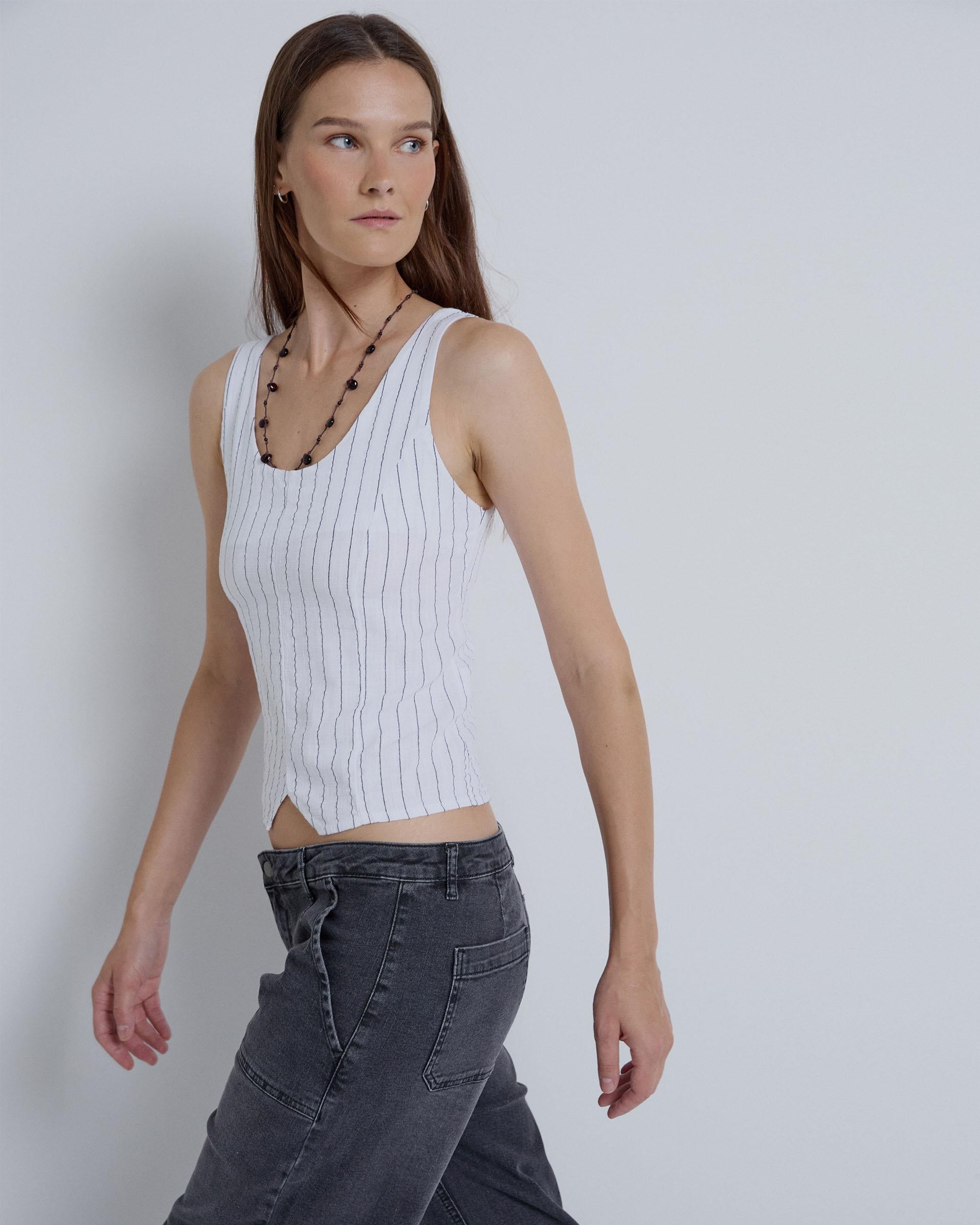 White striped strappy top with a round neck, side seams, and a V-shaped hem.