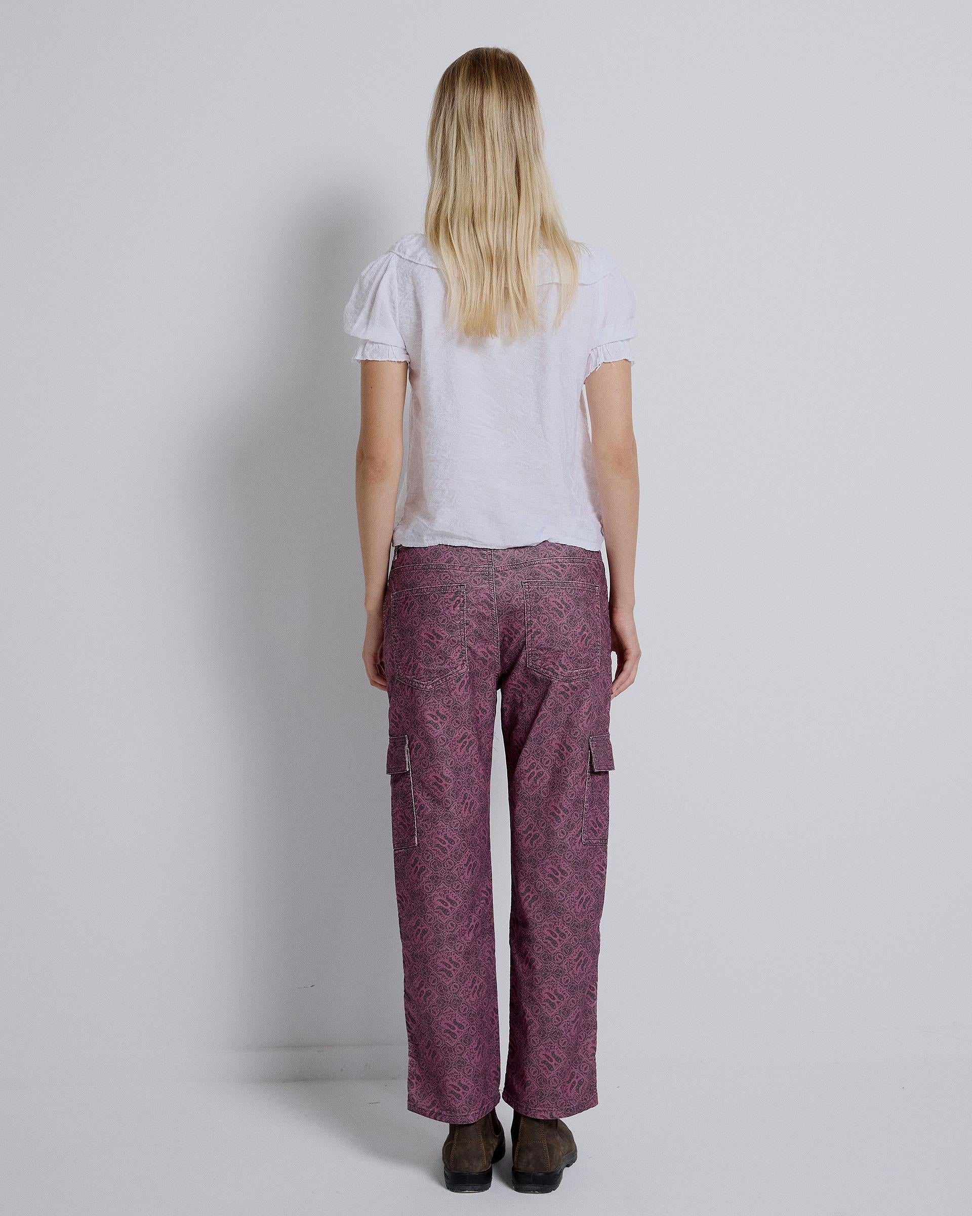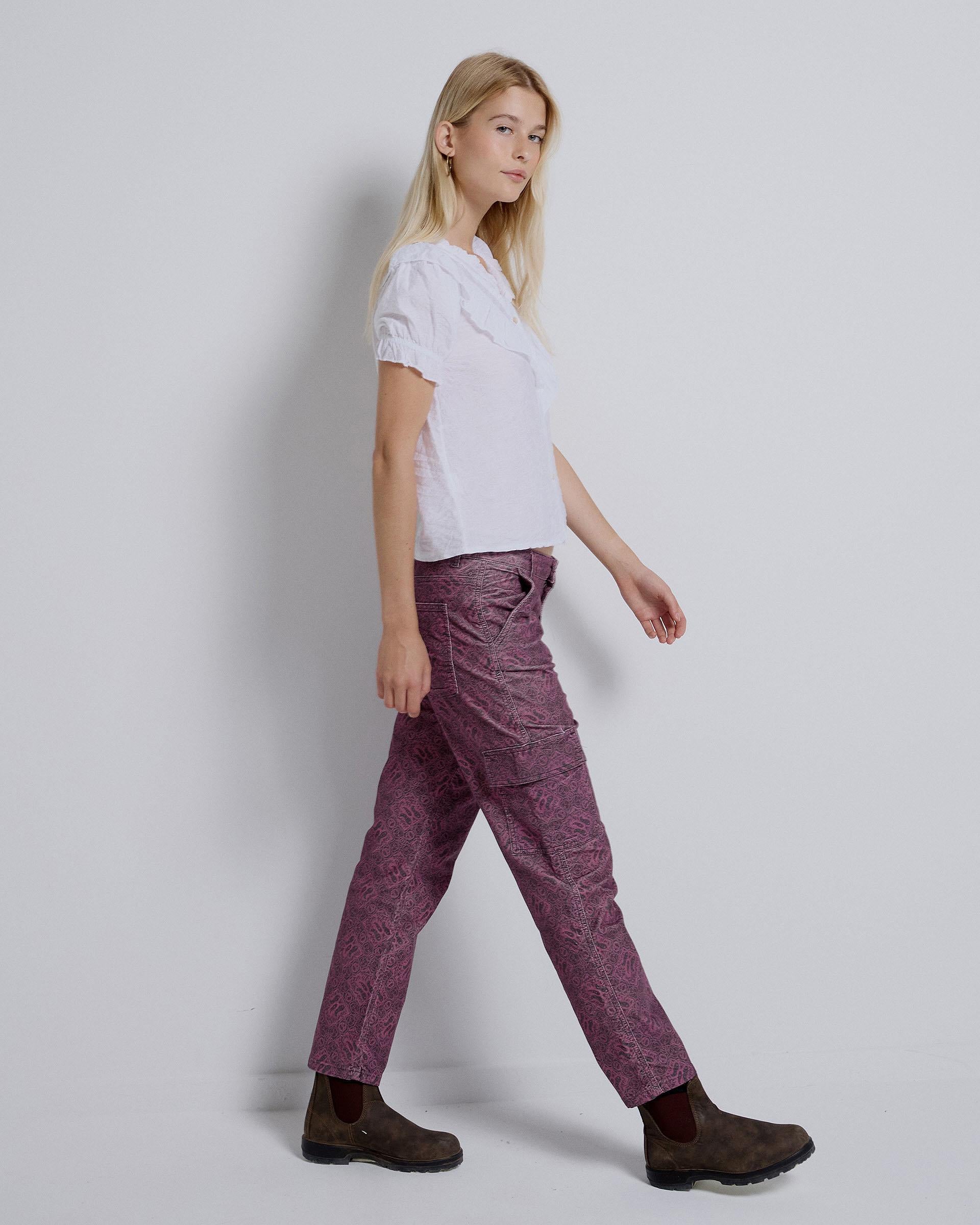 Short-sleeved blouse with a V-shaped ruffle on the chest in white.