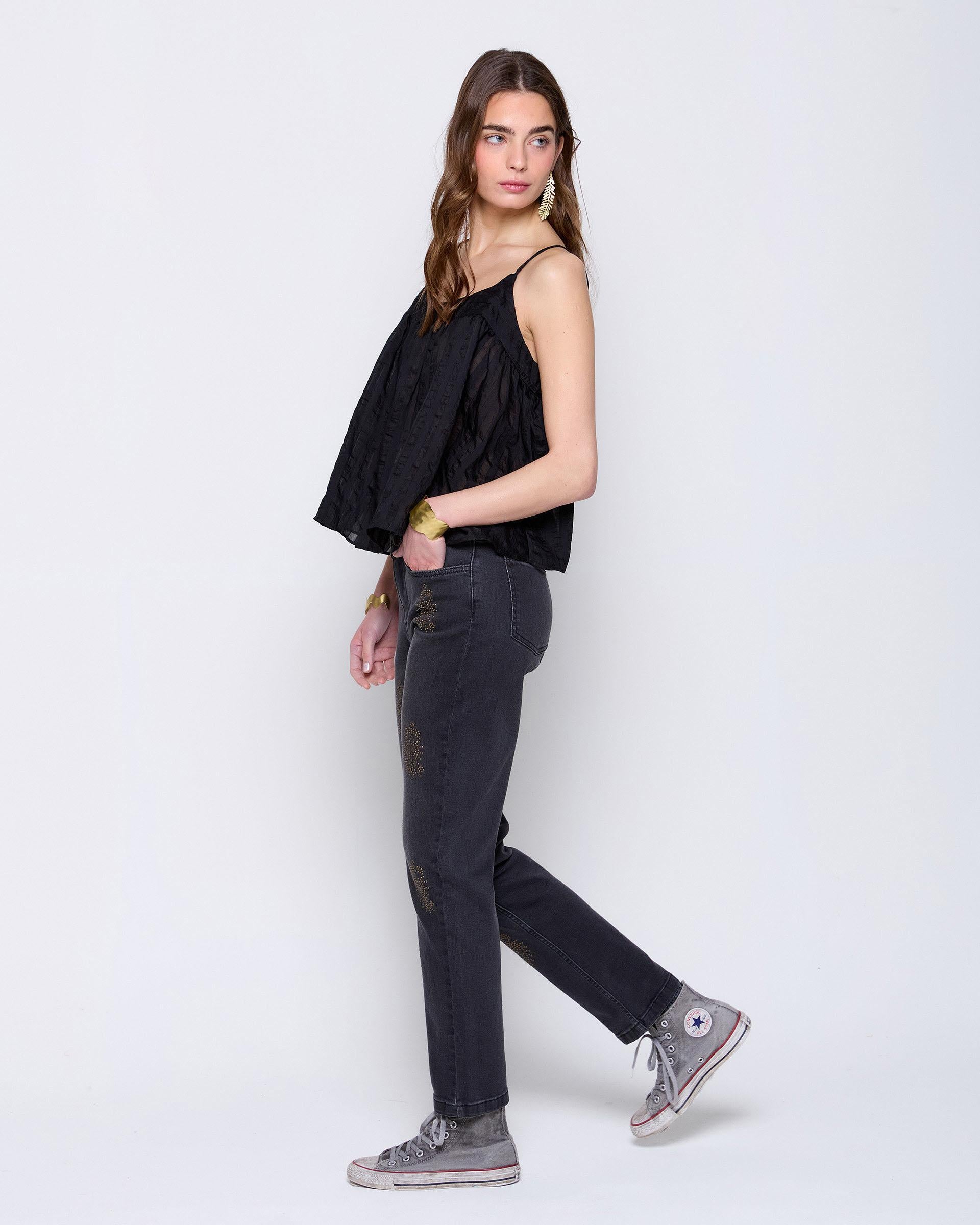 Black top with semi-transparent striped fabric detail. Strap and opening at back.