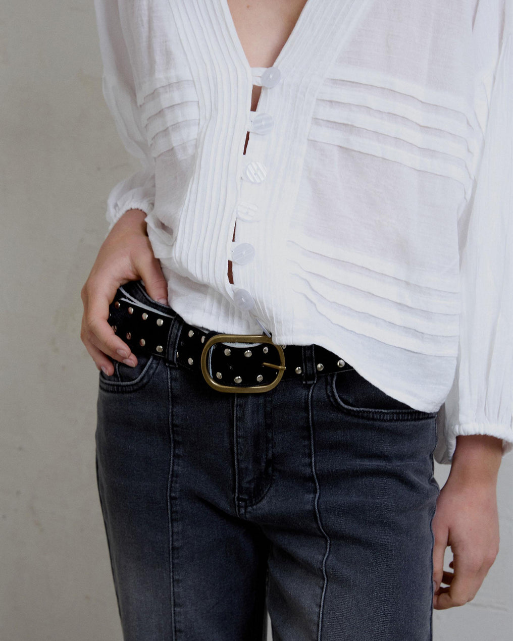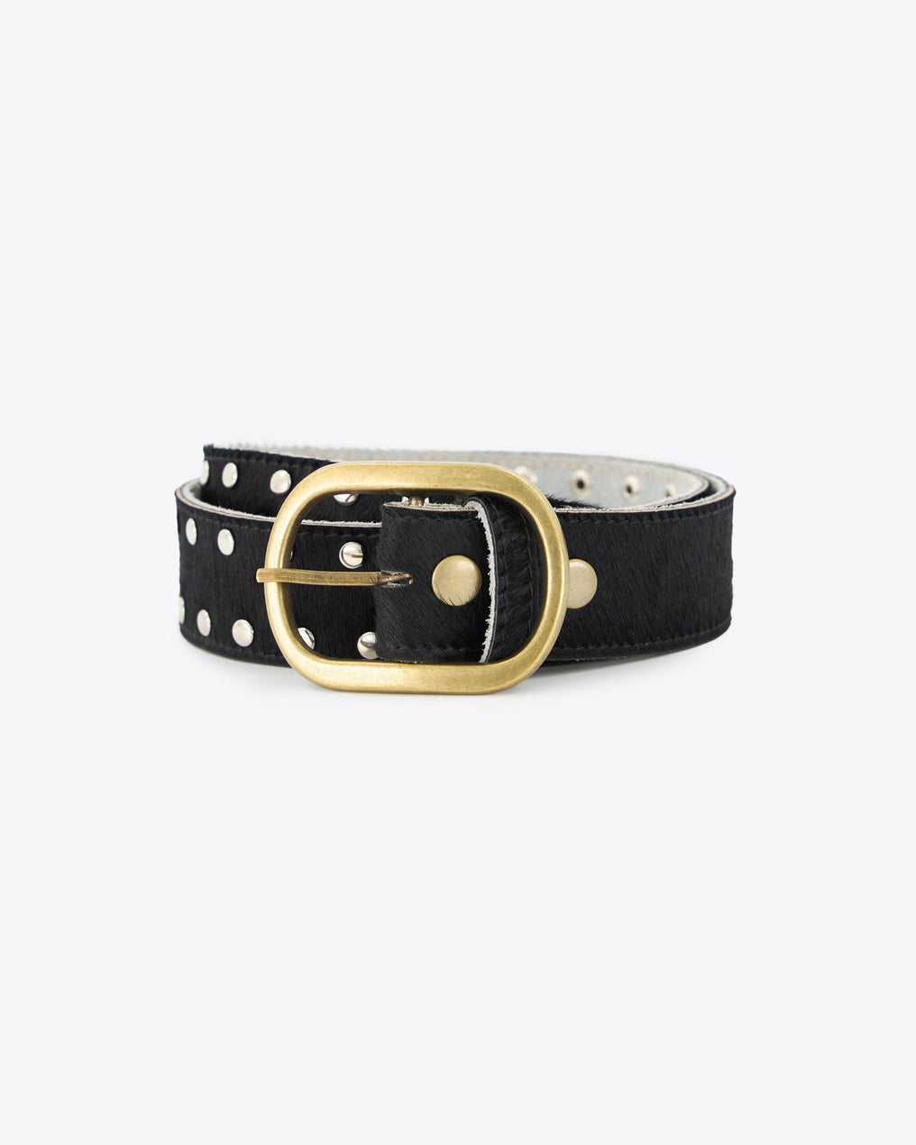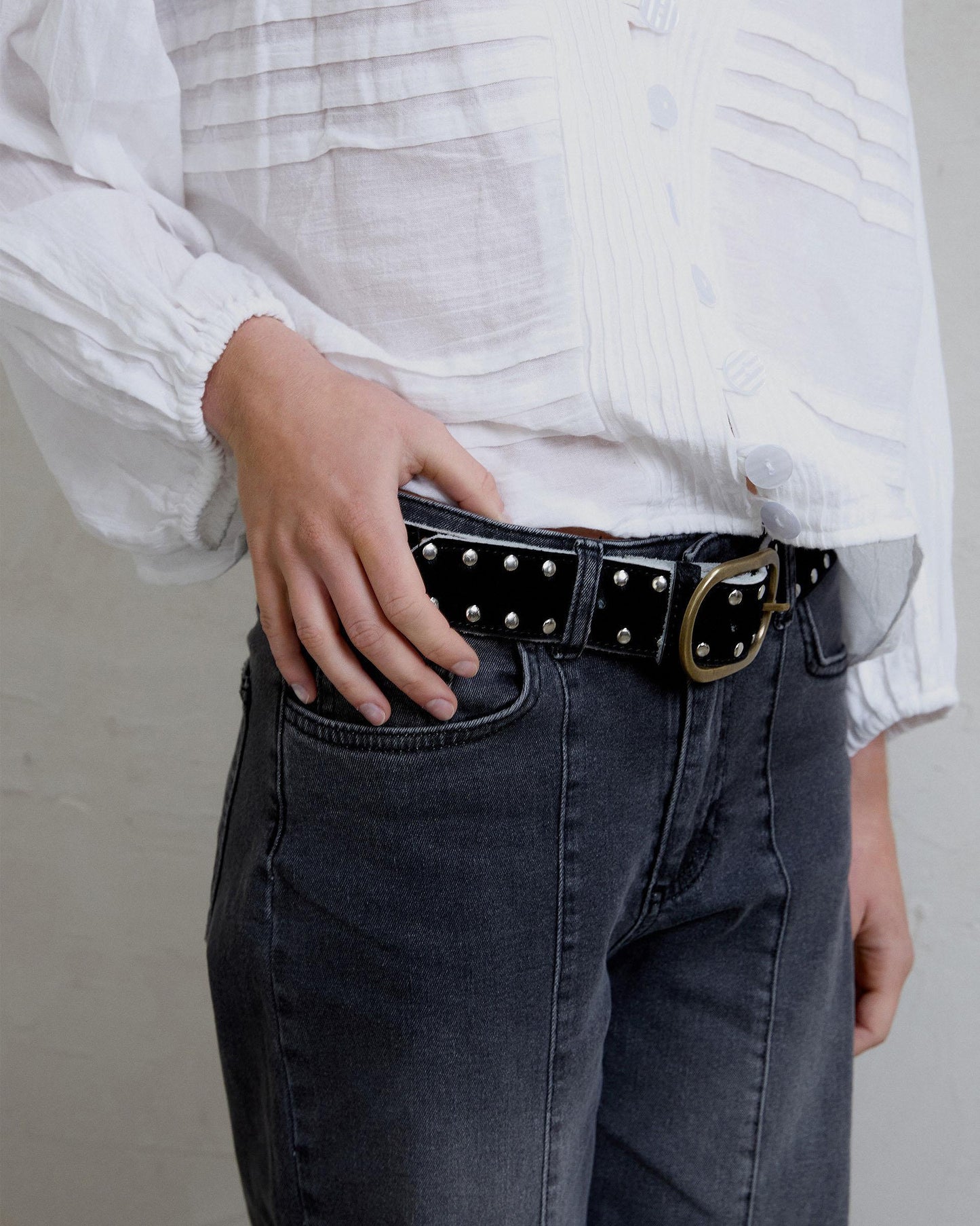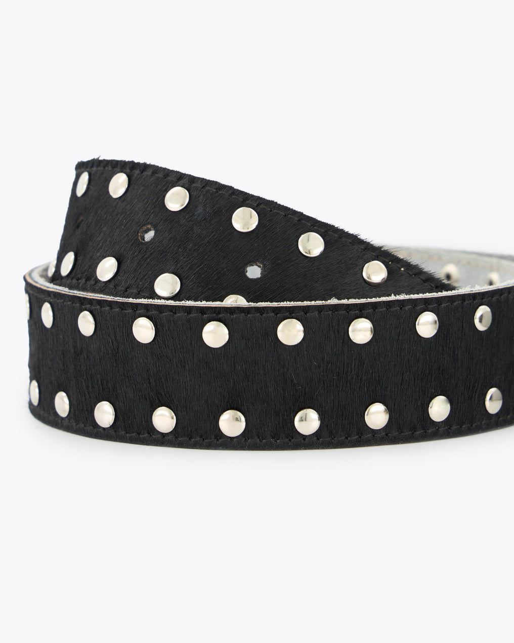 Black leather belt with silver stud detail.