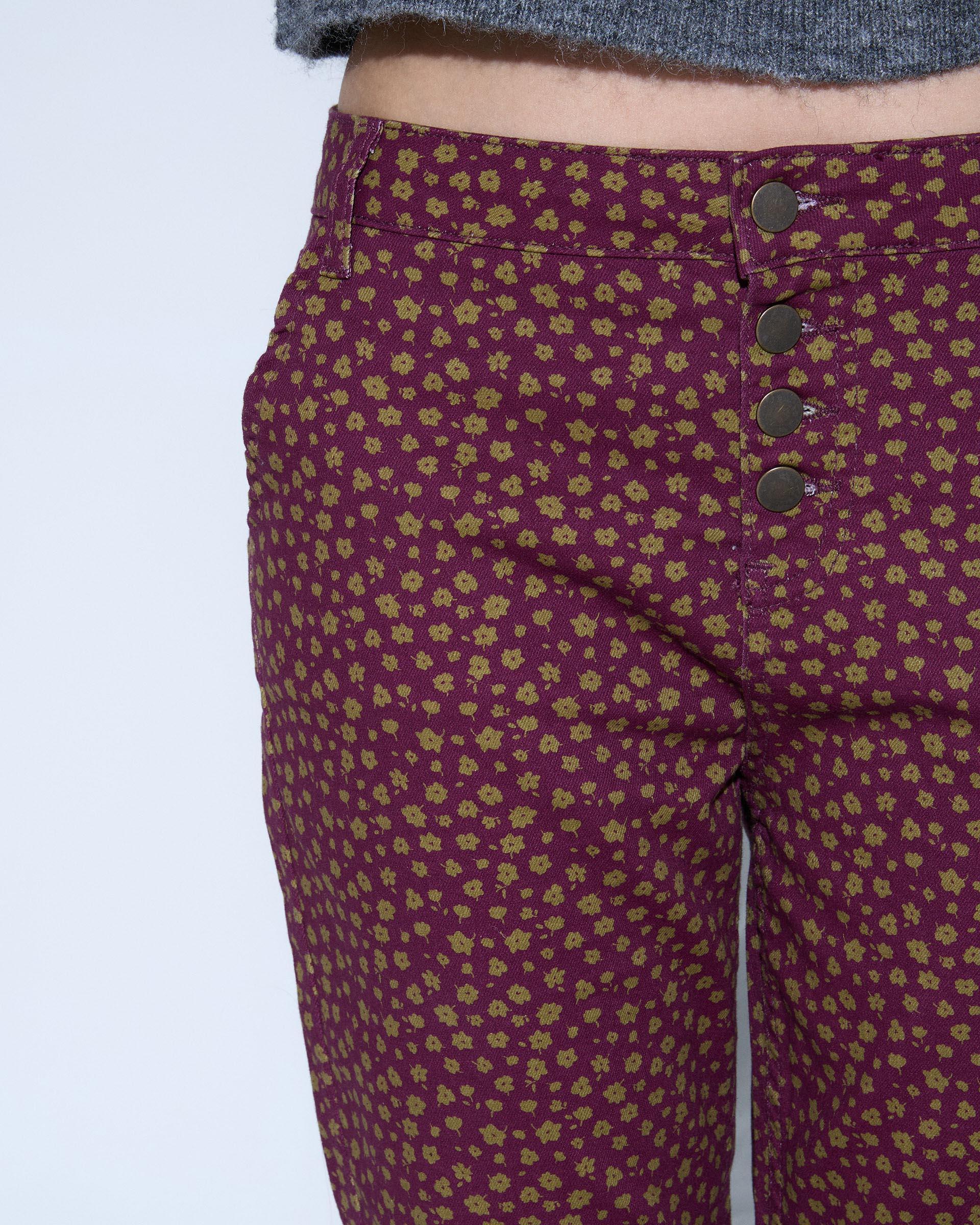 Maroon jeans with a mustard floral print and four-button front closure.
