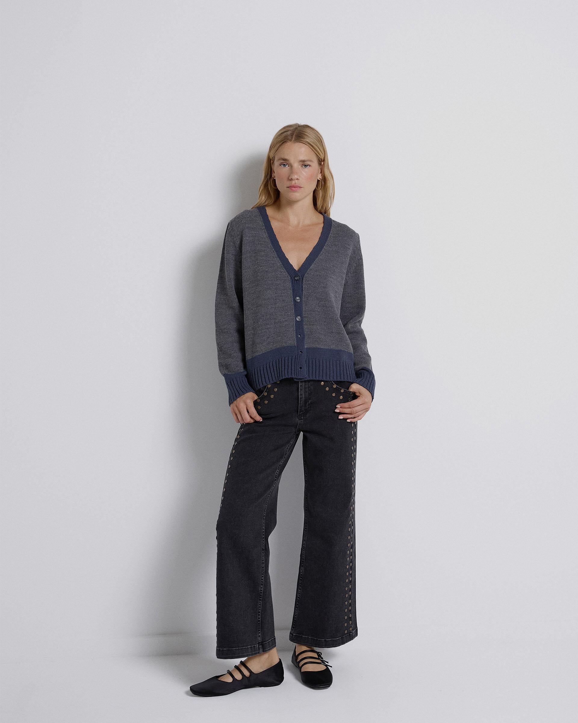 Wide-leg denim pants with studs on pockets and sides of legs, dark gray.