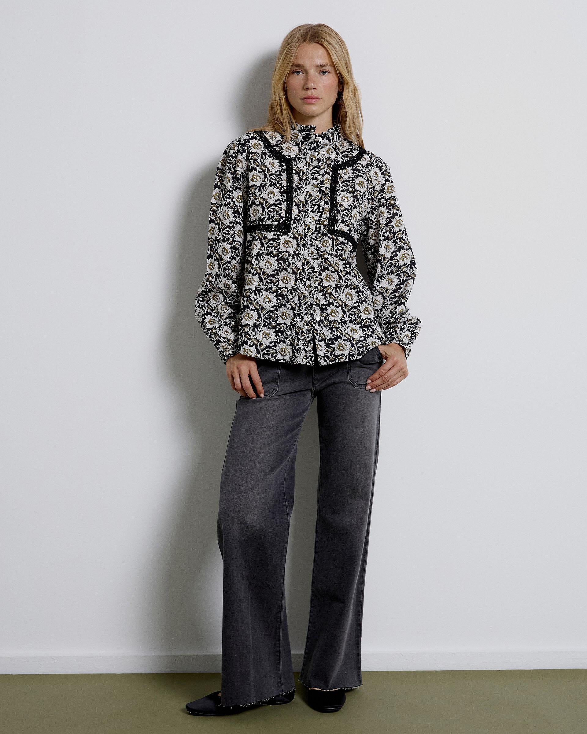 Dark gray jeans with a worker pocket, rings, and marked seams on pockets and waistband.