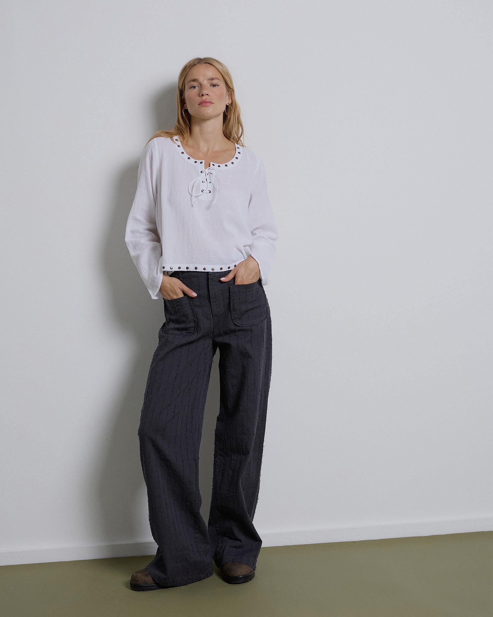 Long trousers with frayed anthracite stripes, front patch pockets, and zip and button closure.