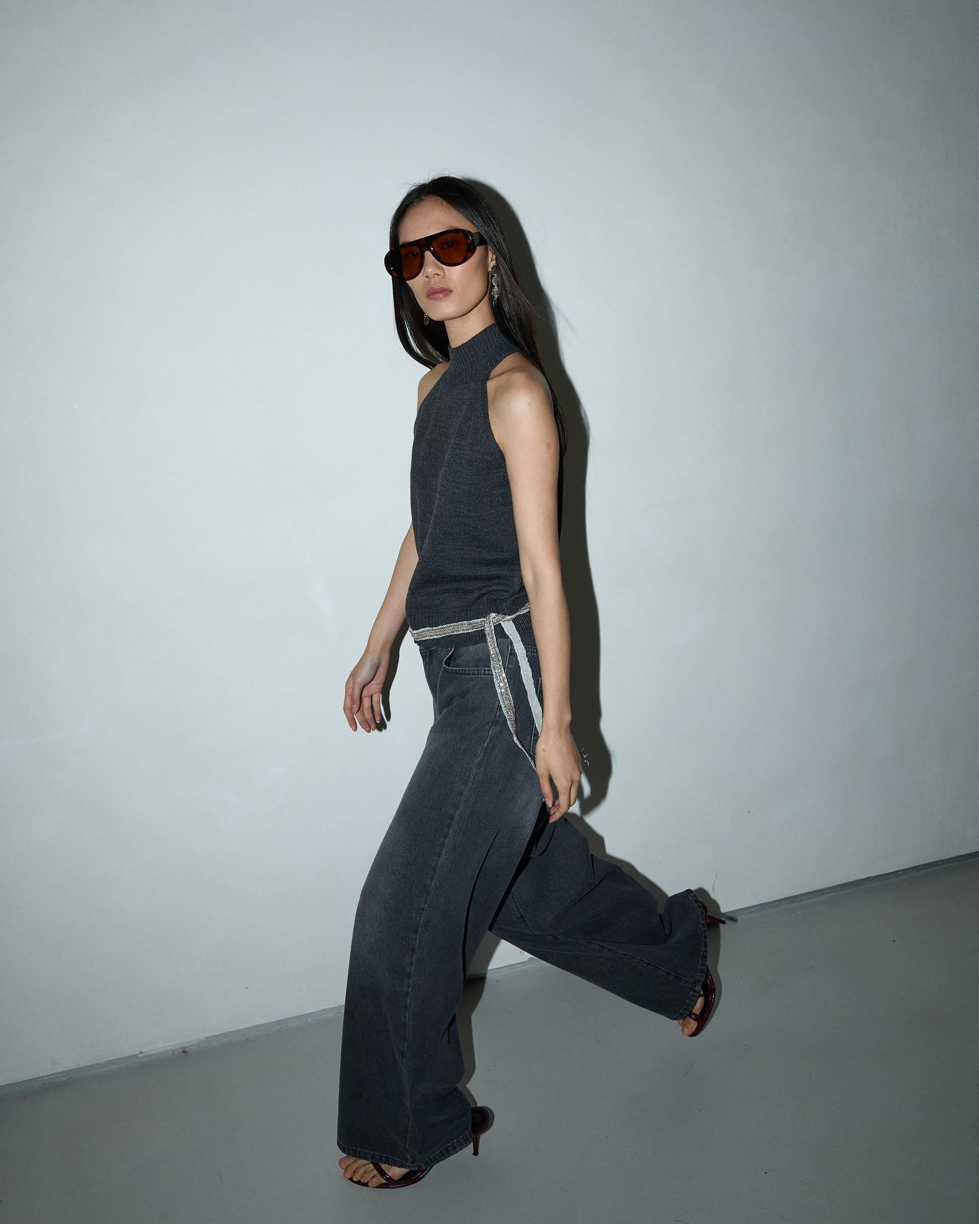 Knit top with halter neckline and high neck, in anthracite with lurex.