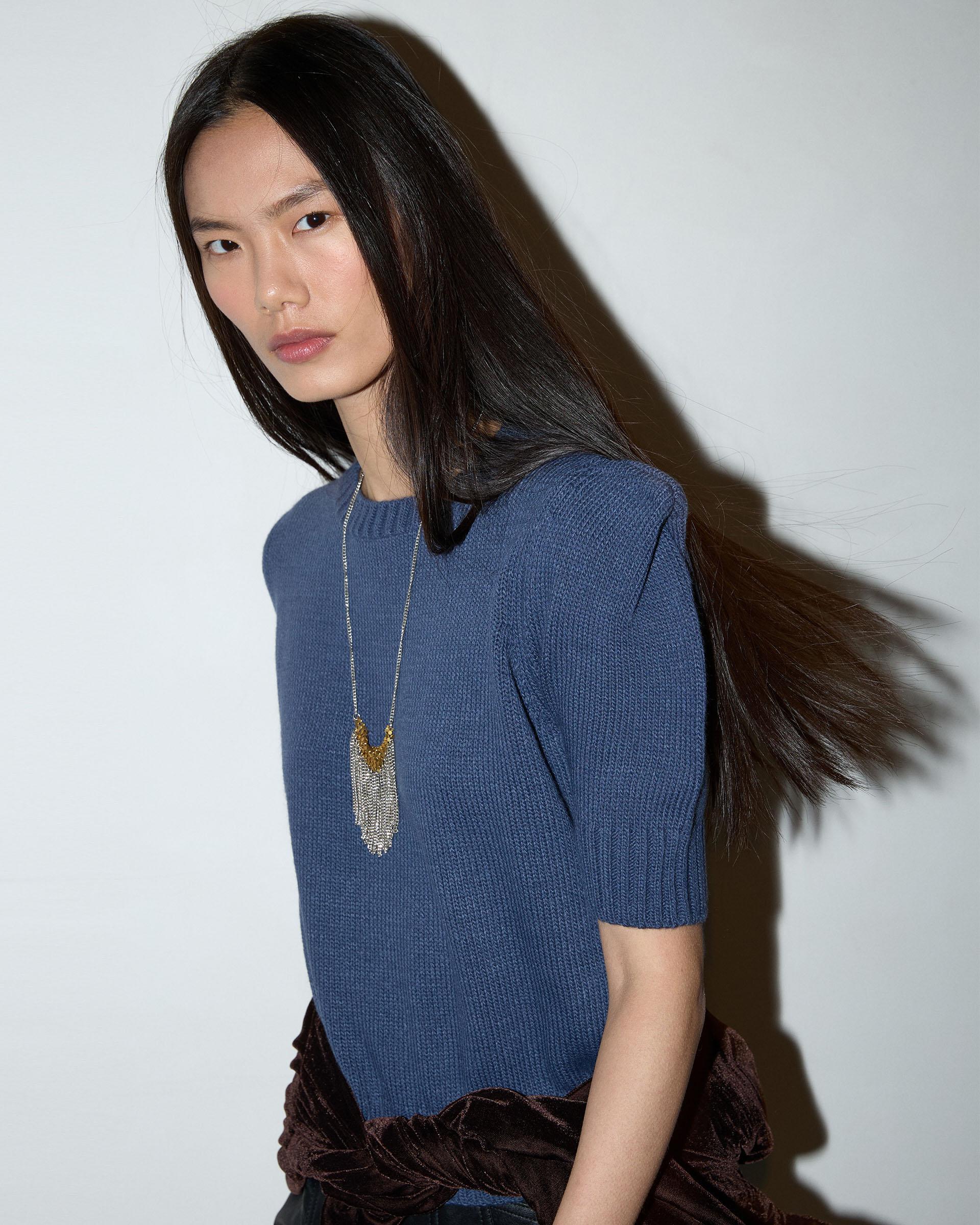 Round neck, short sleeve knit top with shoulder pleats for a shoulder pad effect, in dark blue.