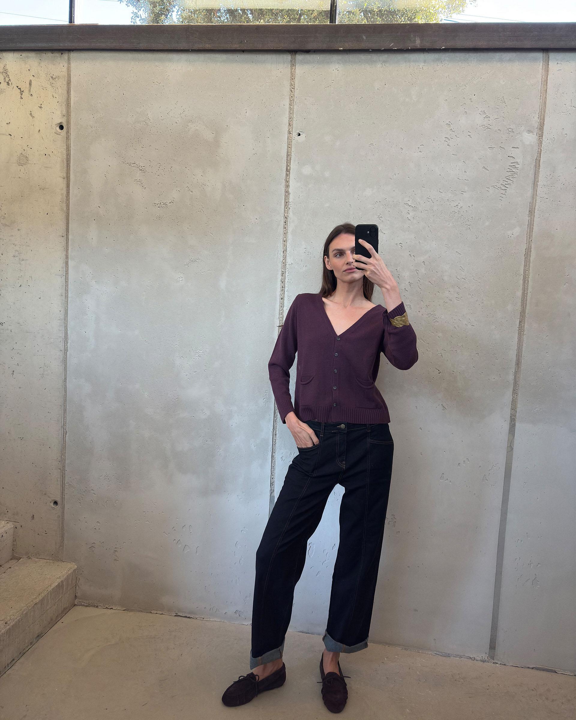 Chaqueta de punto de cuello en pico y bolsillos delanteros.