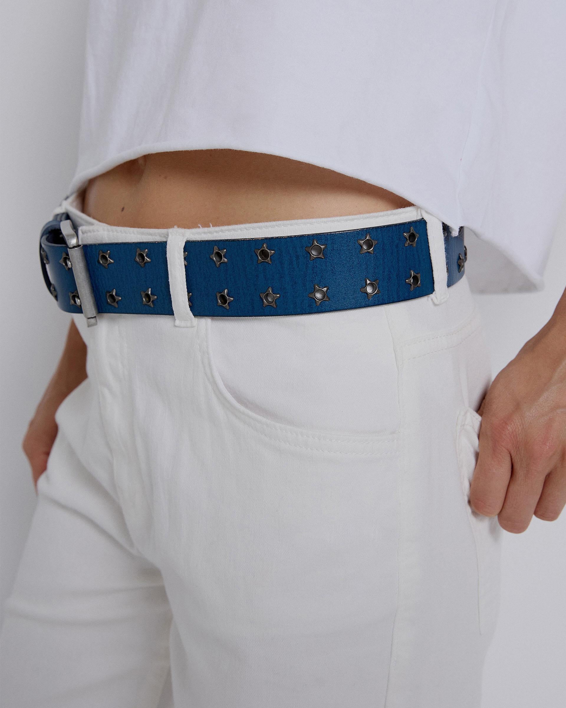 Cinturón de piel azul con tachuelas en forma de estrella en plata vieja.