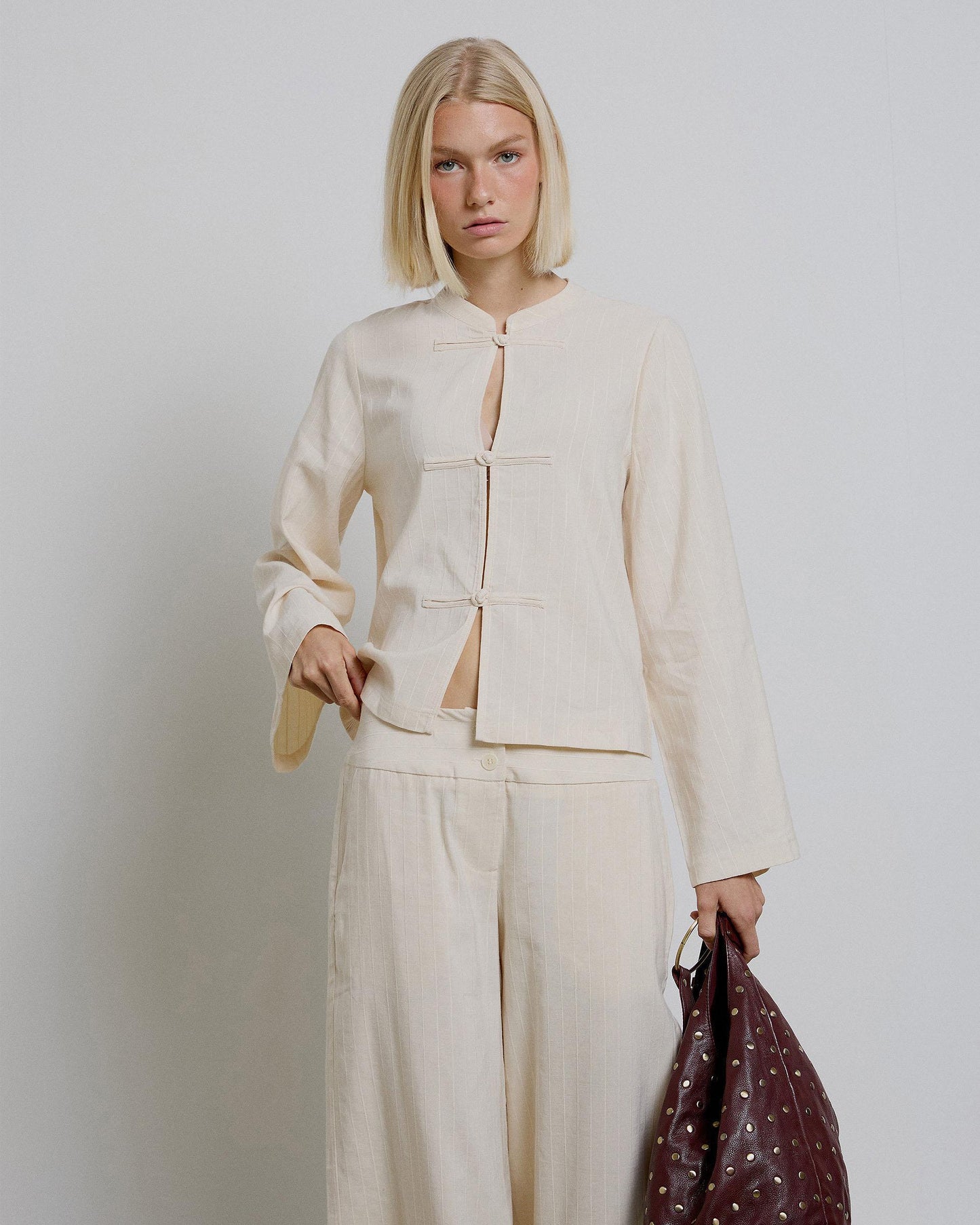 Pantalón crudo textura, con bolsillos delanteros, cinturilla ancha y cierre con cremallera y doble botón.