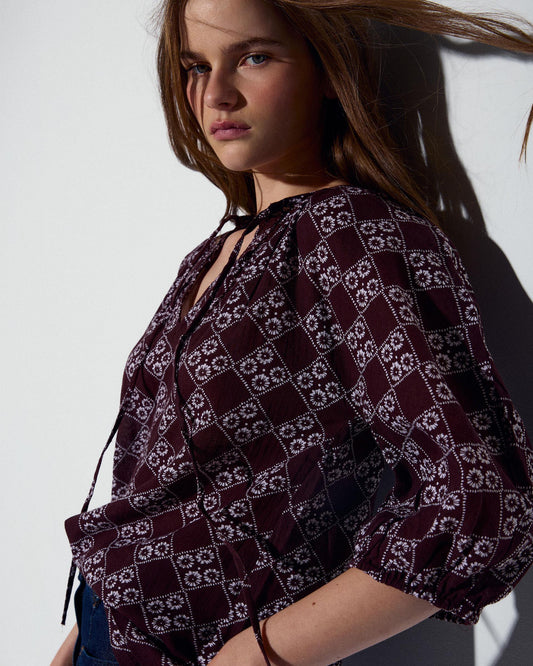 Blusa Nido De Abeja Cuello Cuadros Granate