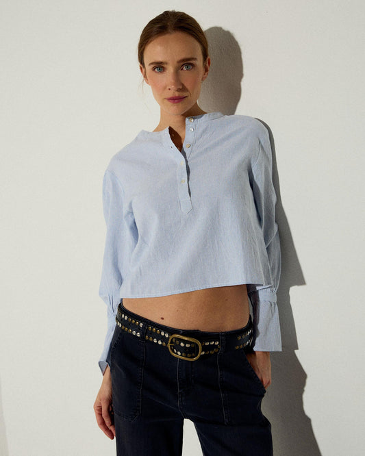 • Blusa Estampado Rayas Detalle Puños Azul