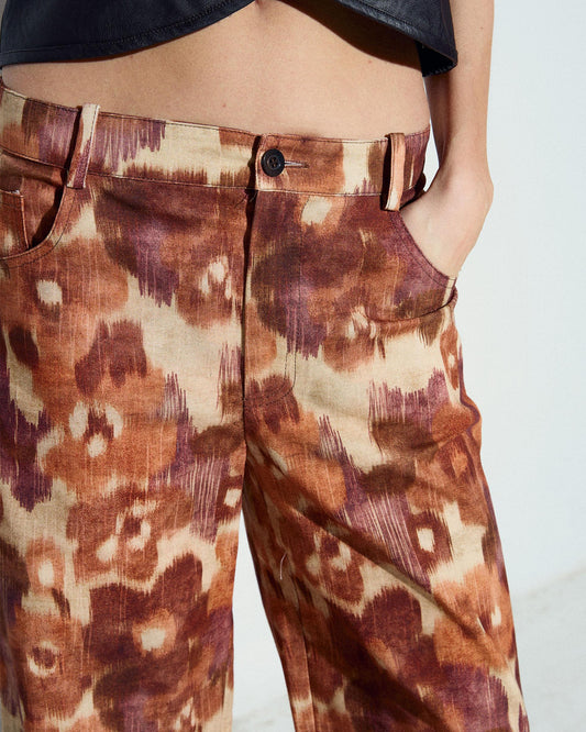 • Pantalón Fluido Triple Botón Estampado Floral Marrón