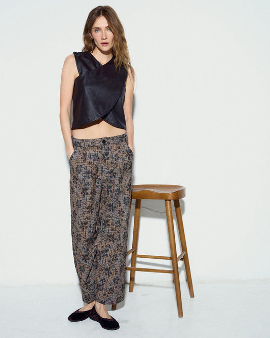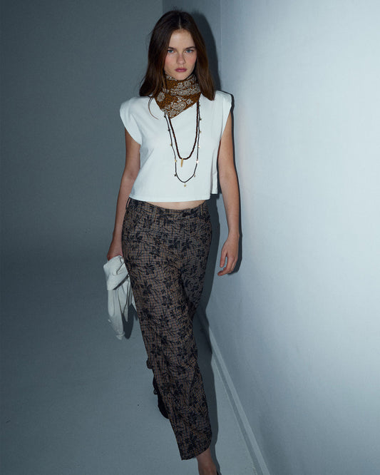 • Pantalón Estampado Cuadros Flores Marrón