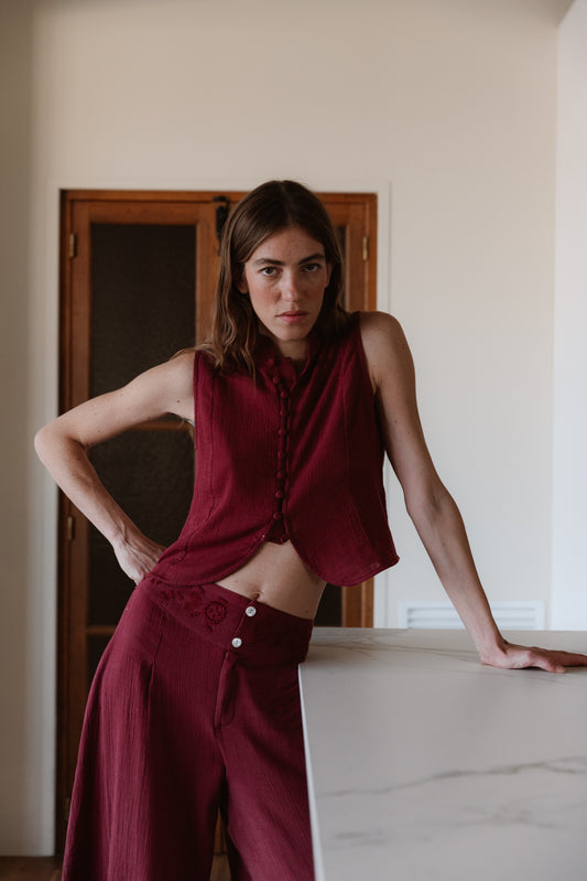 Top Cuello Mao Bordados Granate
