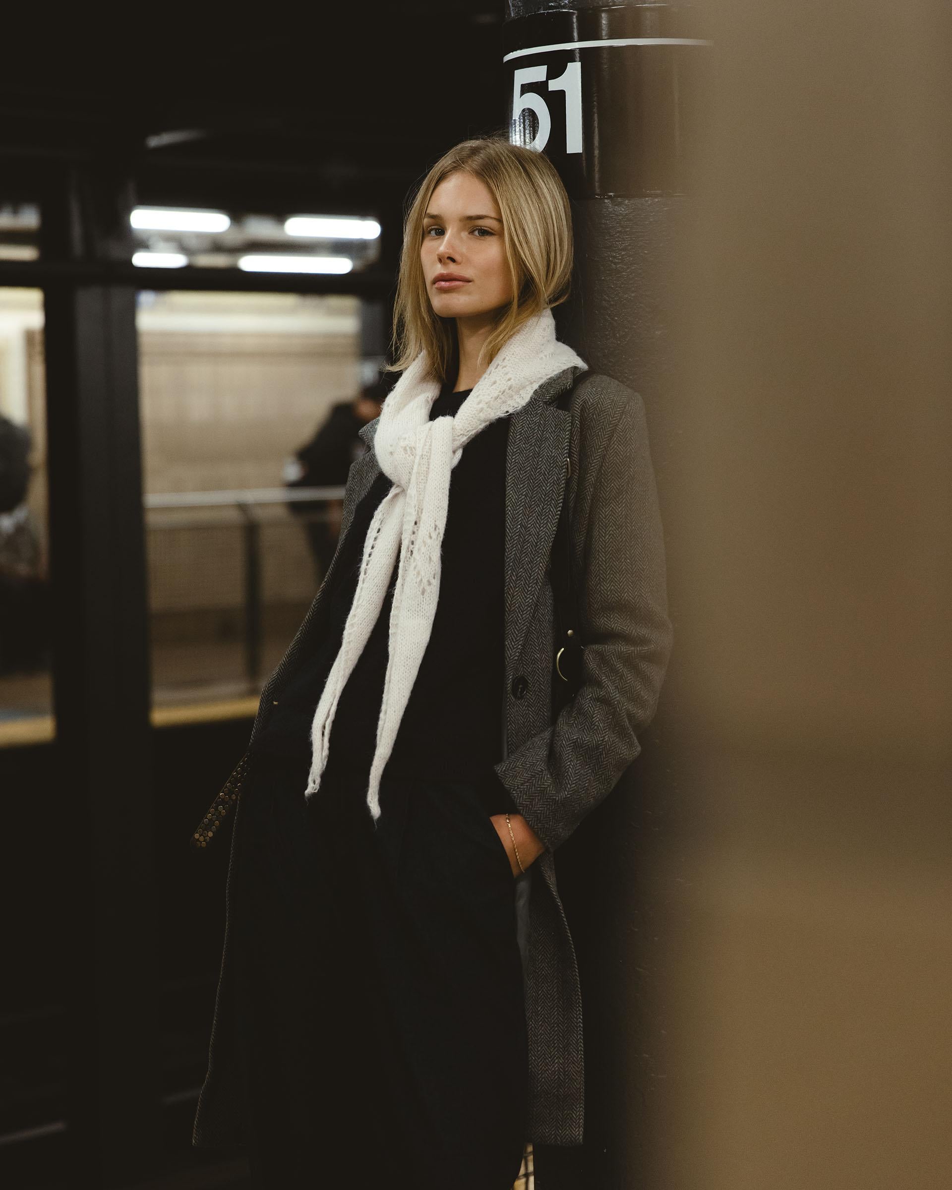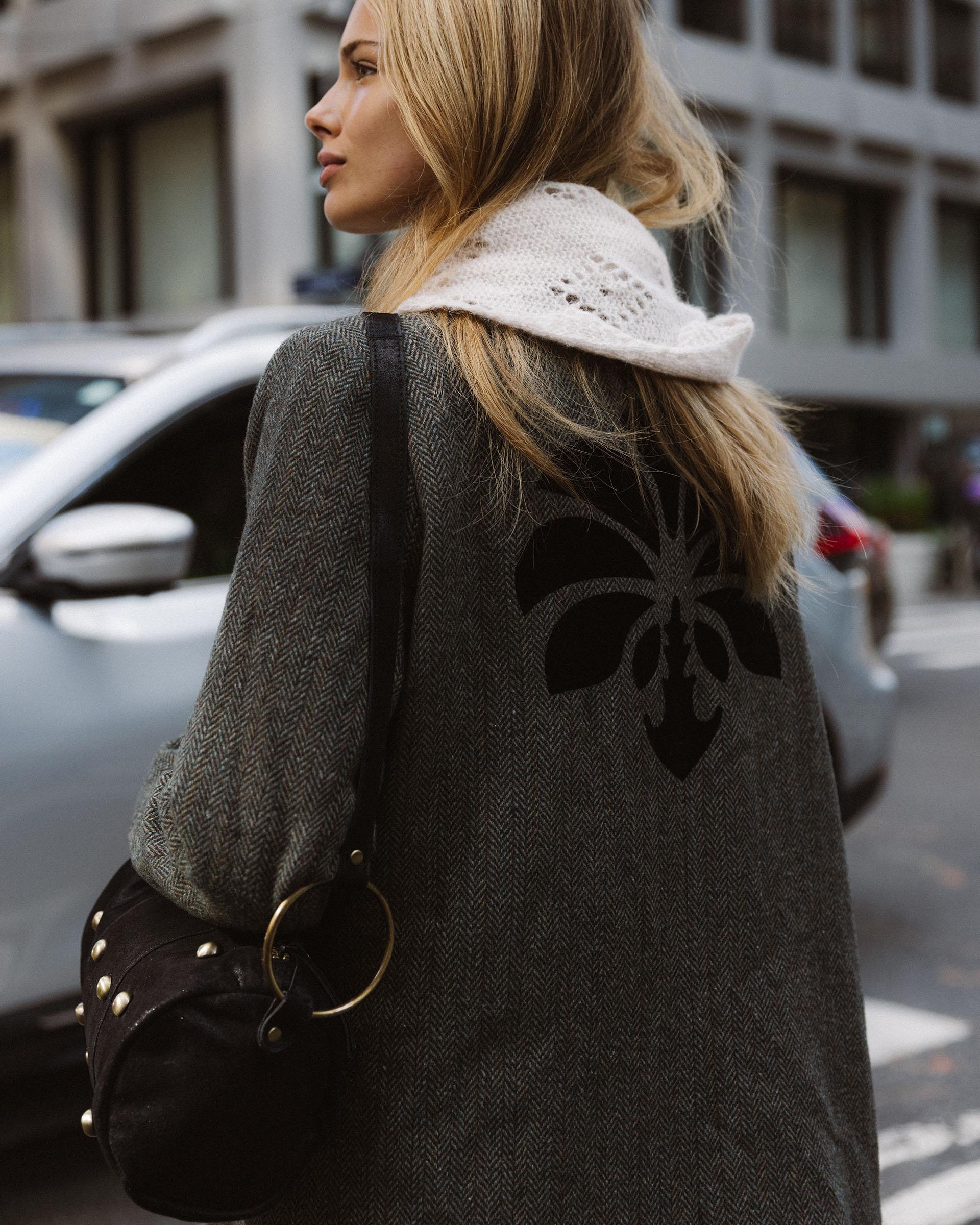 Abrigo tipo midi con estampado de espiga en tonos verdes y grises, detalle de flor bordada en trasero en color negro y mezcla de lana.