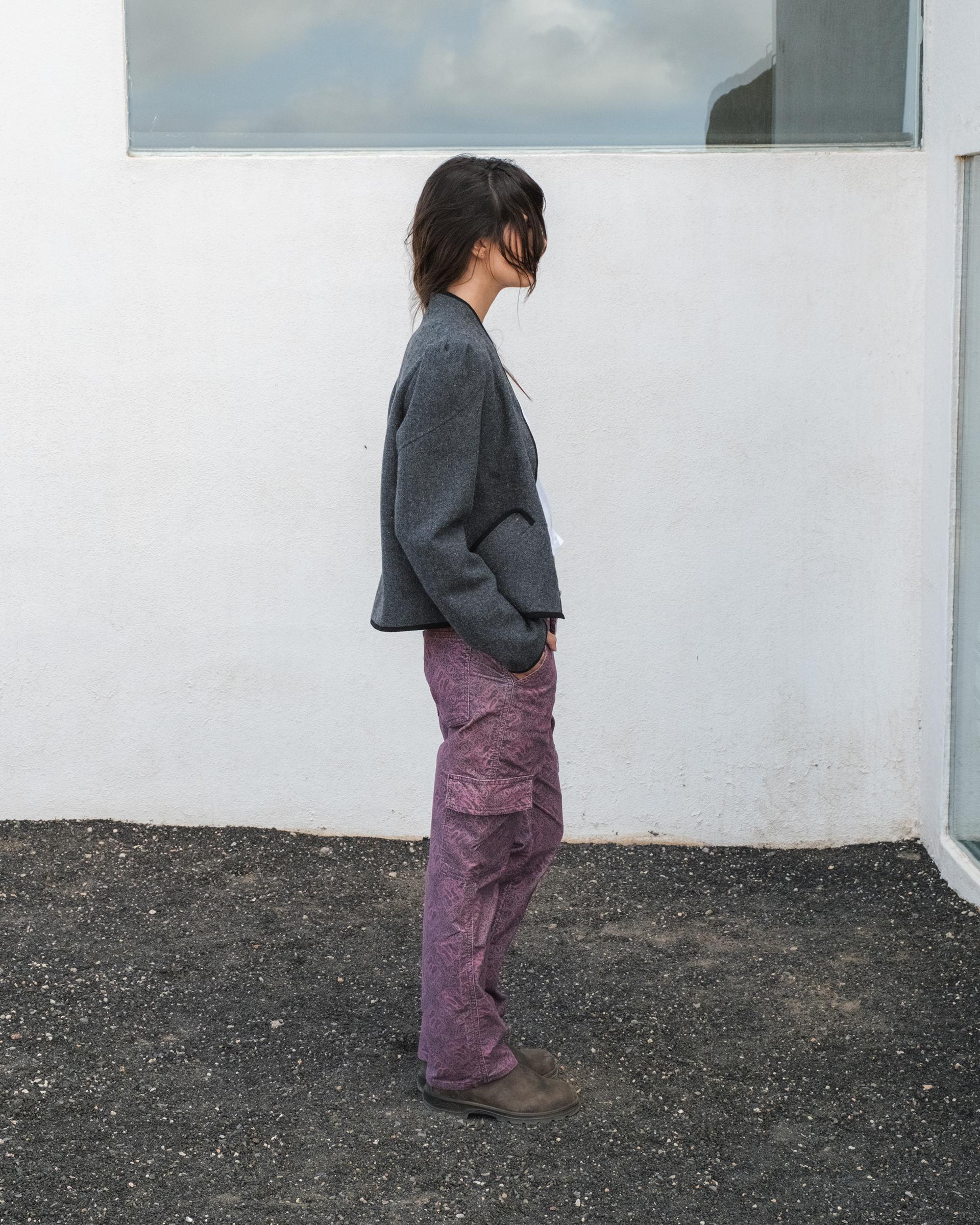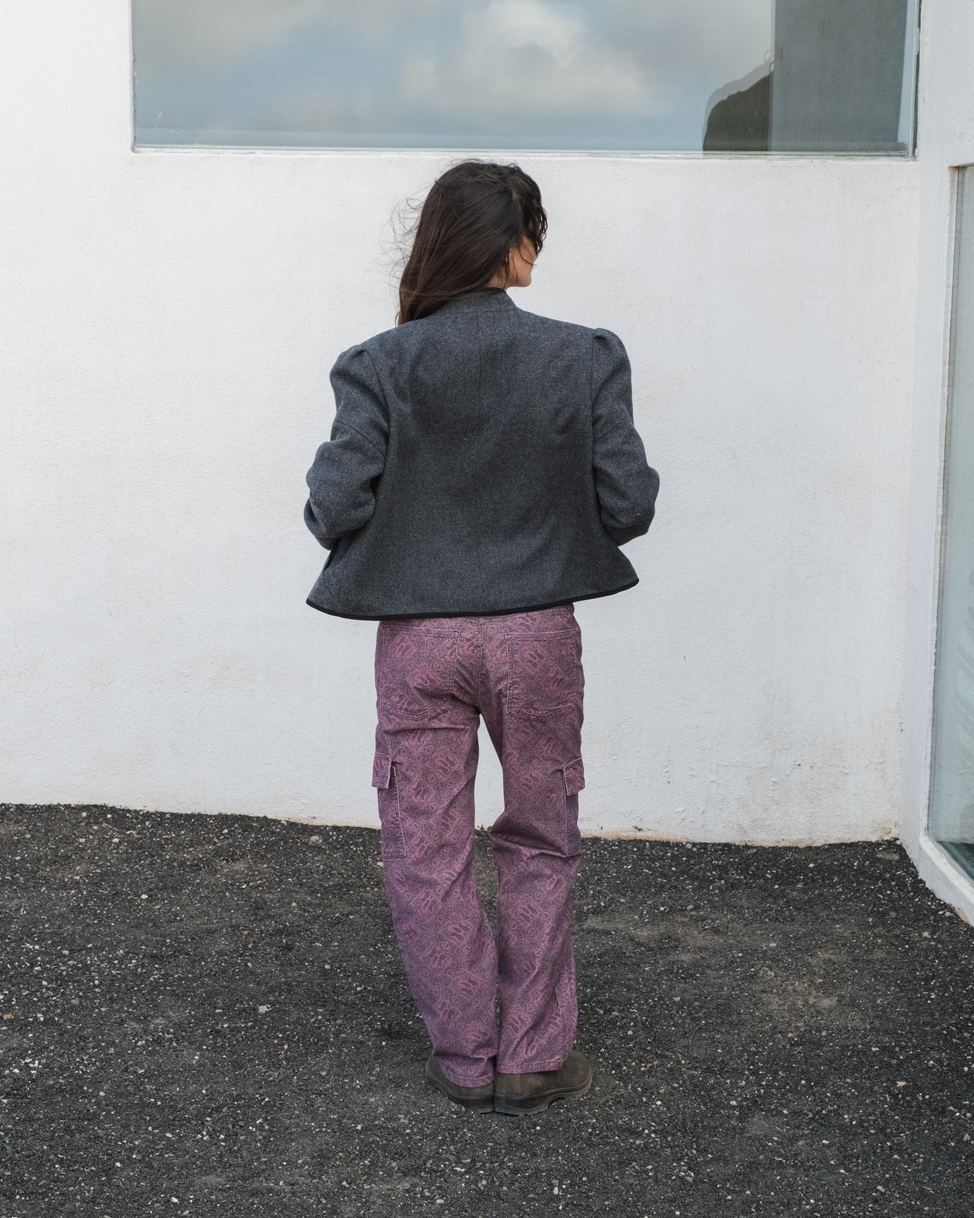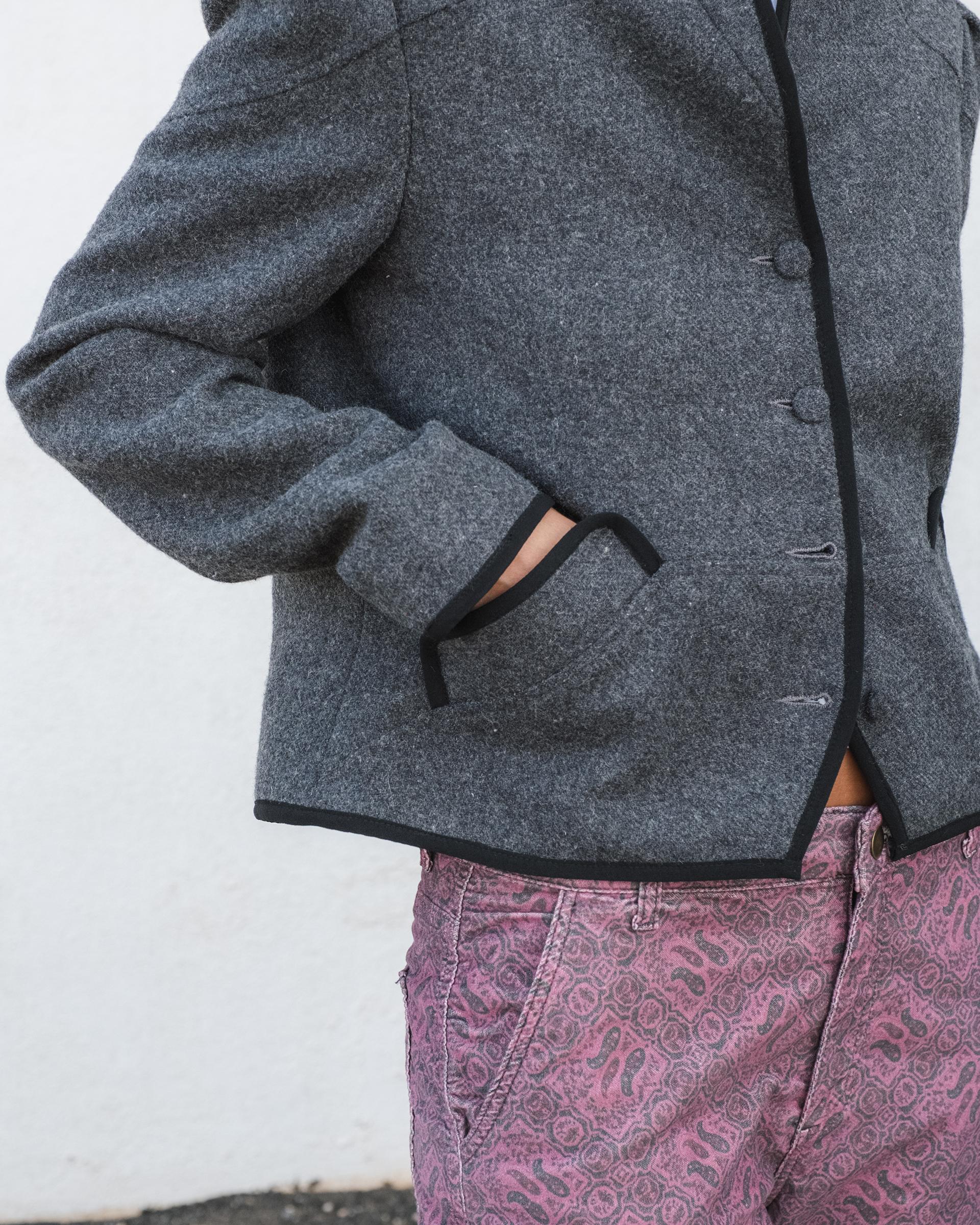 Chaqueta tipo bomber de color gris oscuro con manga abullonada, ribete a contraste de color y botones forrados y mezcla de lana.