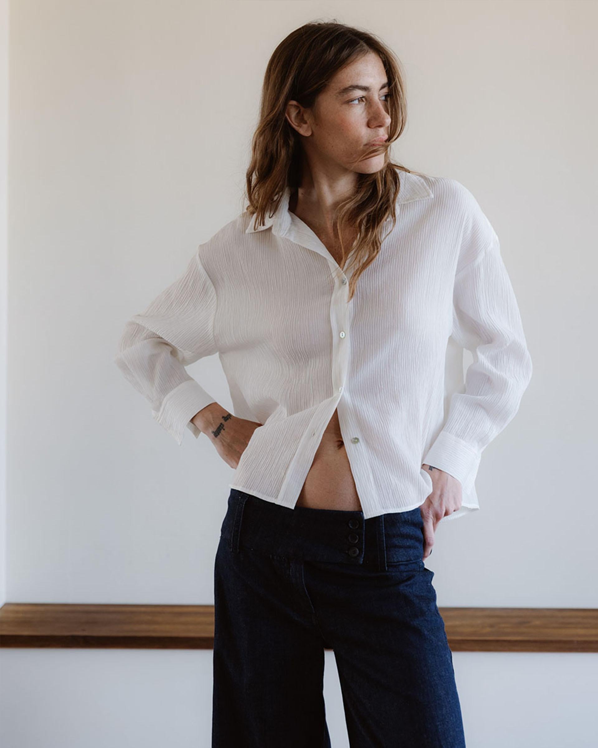 Camisa con tejido tipo plisado de color blanco, con botones de nácar en delantero.