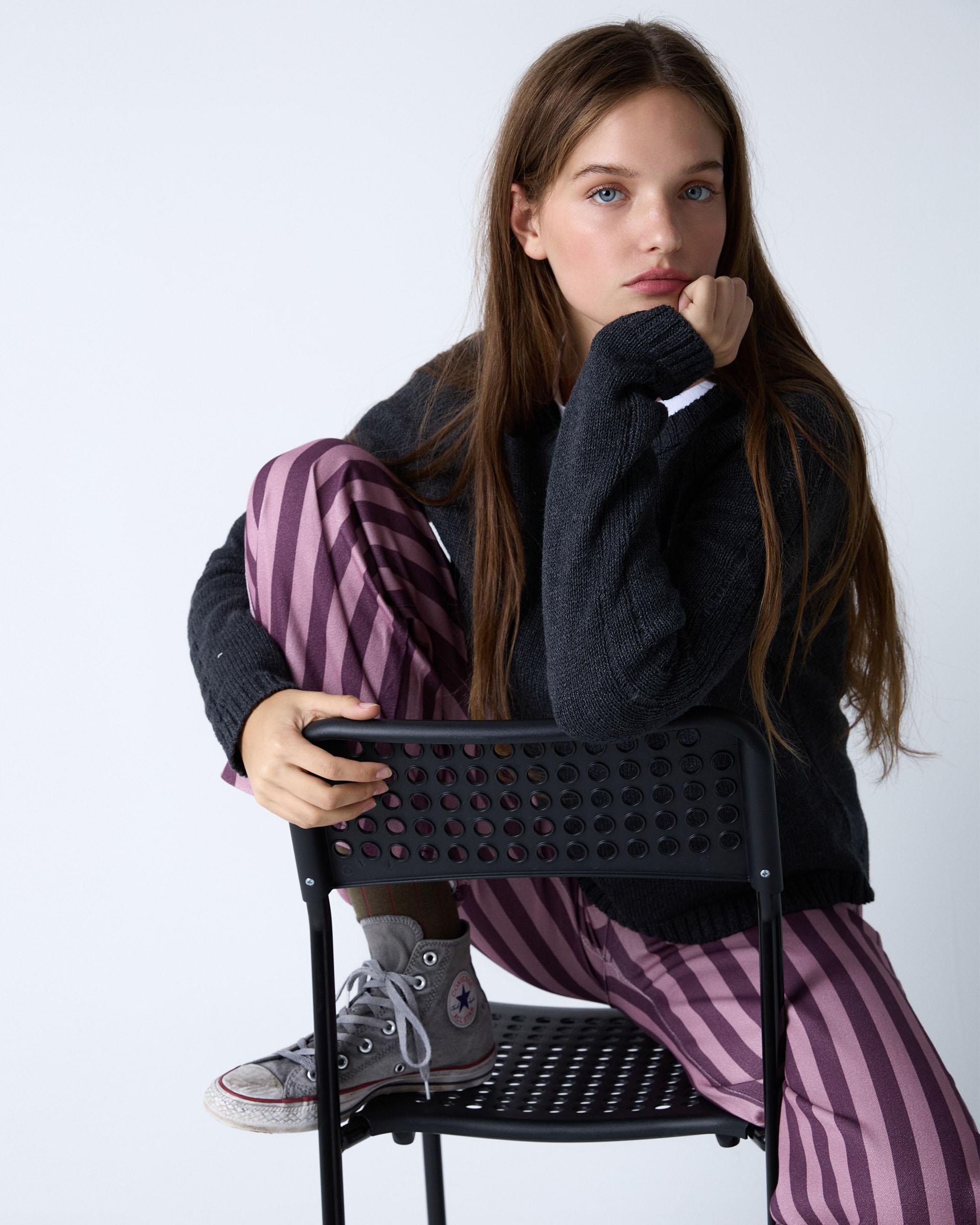 Pantalón largo tipo straight fit con estampado de rayas en color rosa y morado, detalle de bolsillos en delantero y cierre con cremallera y botón.