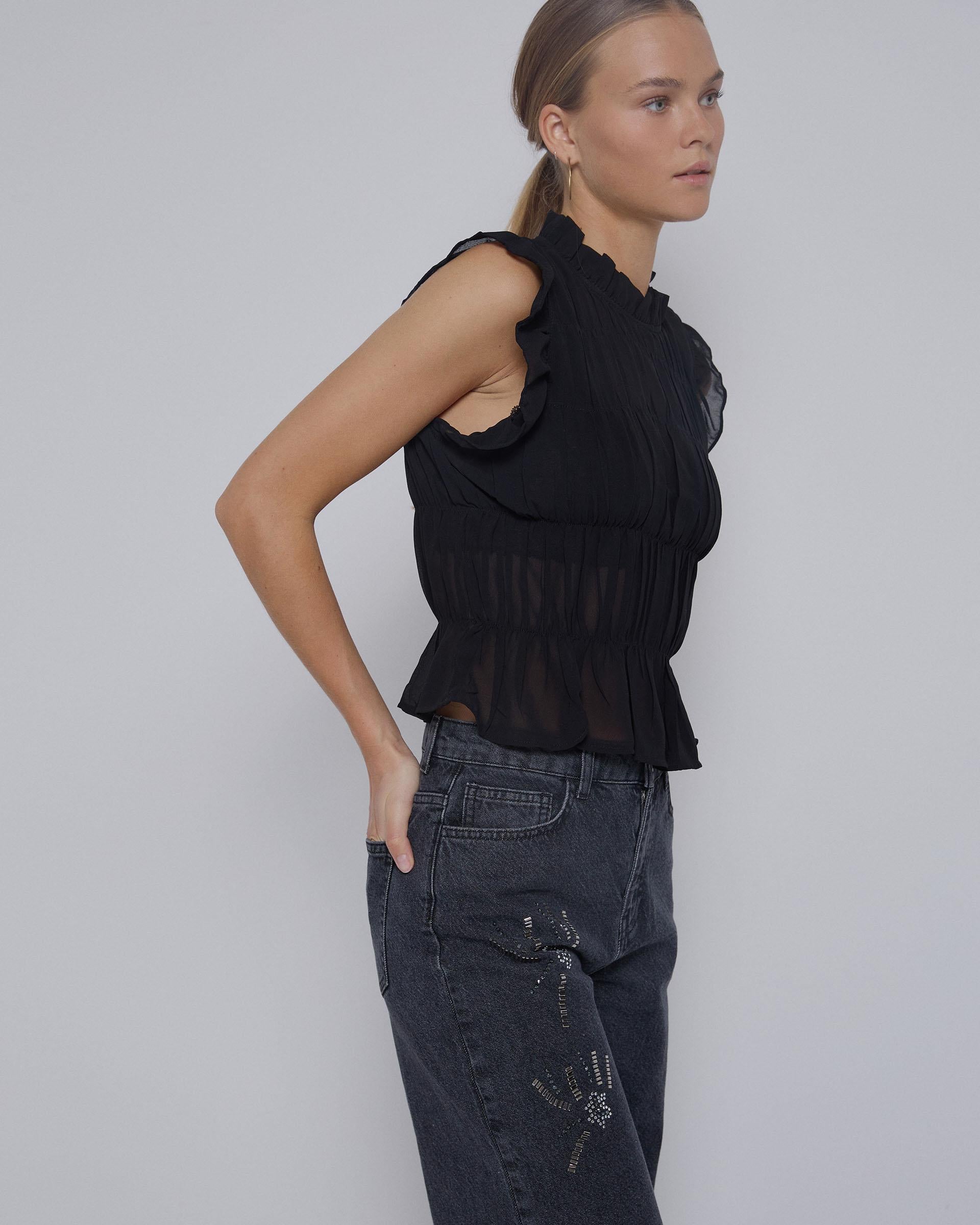 Top de gomas de color negro. Volante en cuello y manga corta.