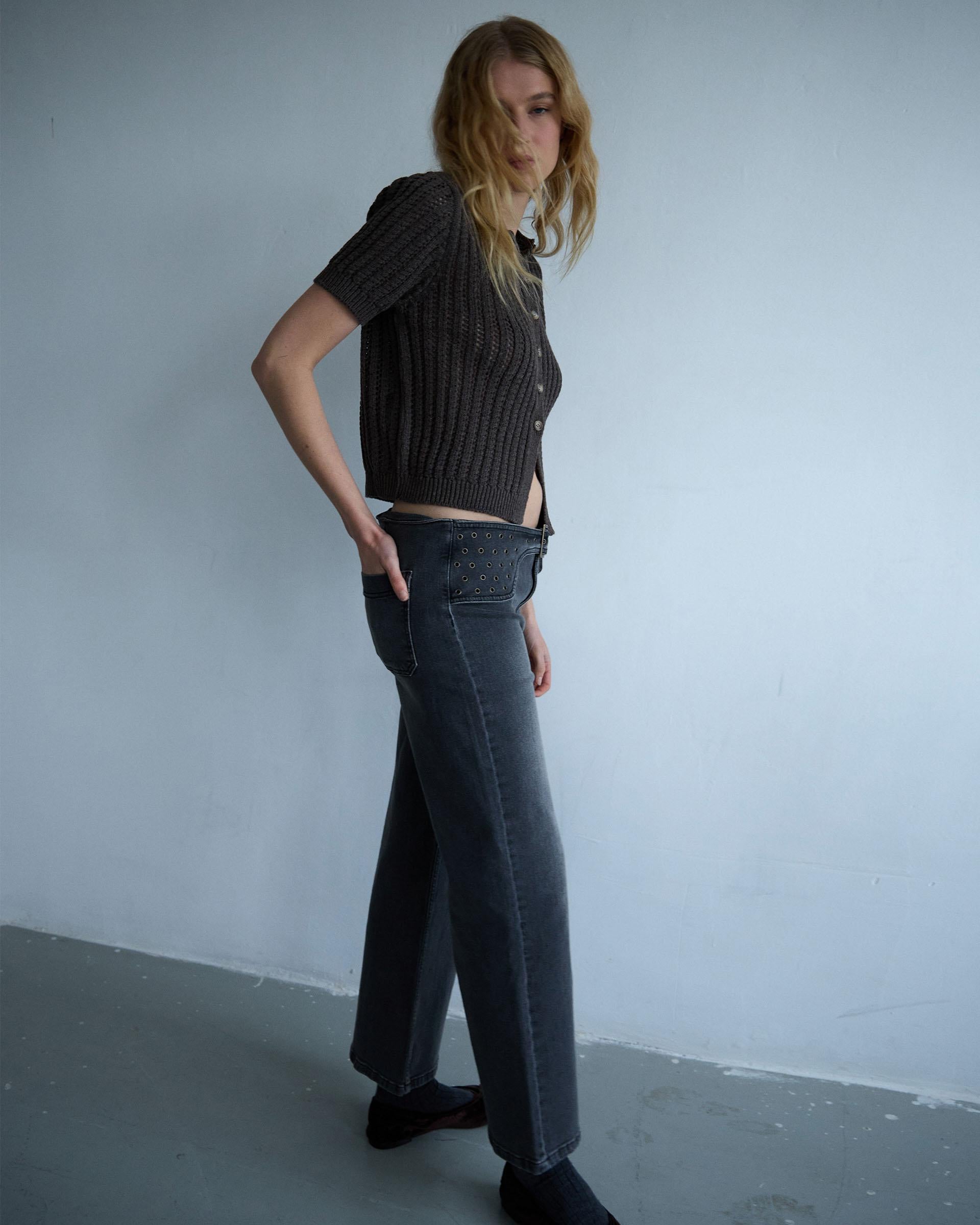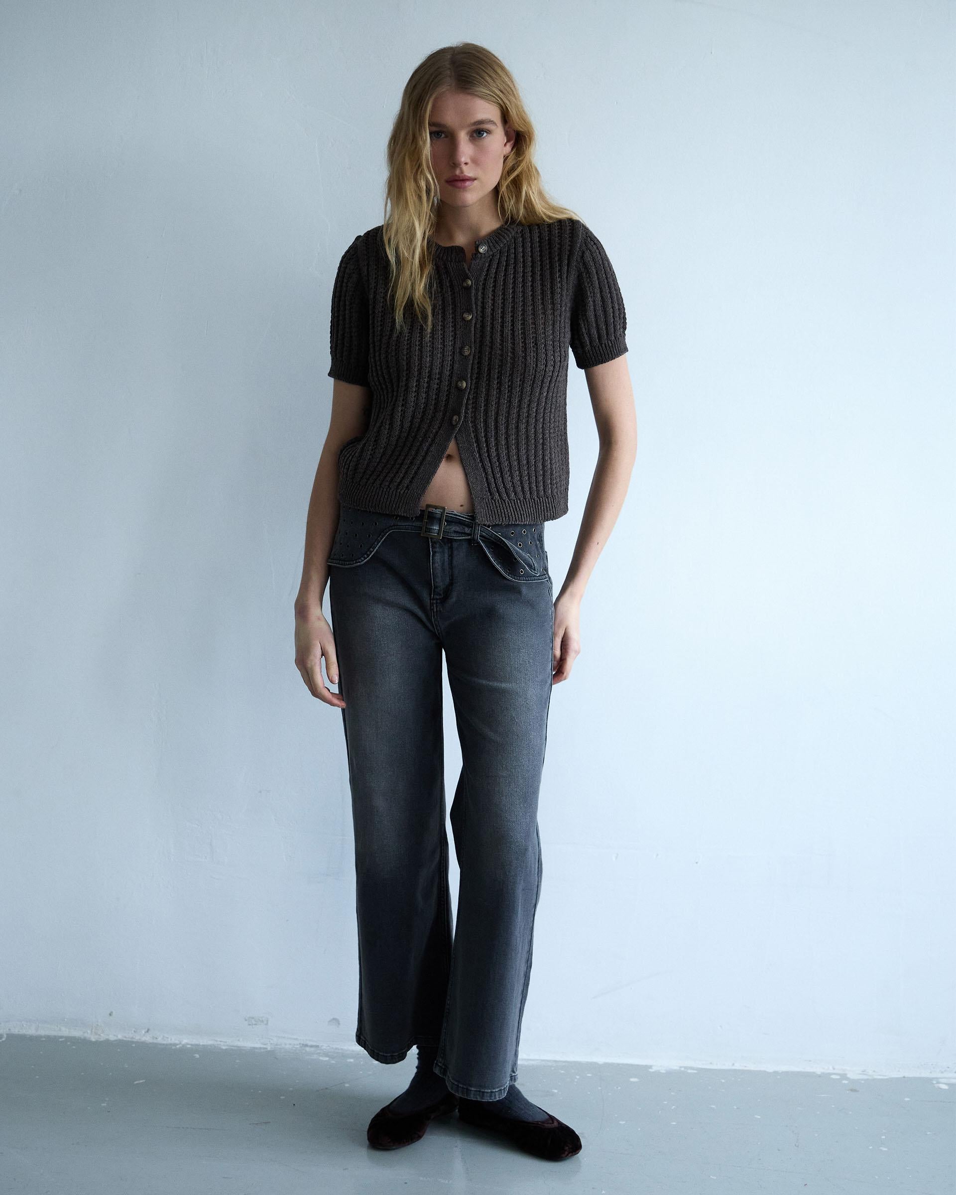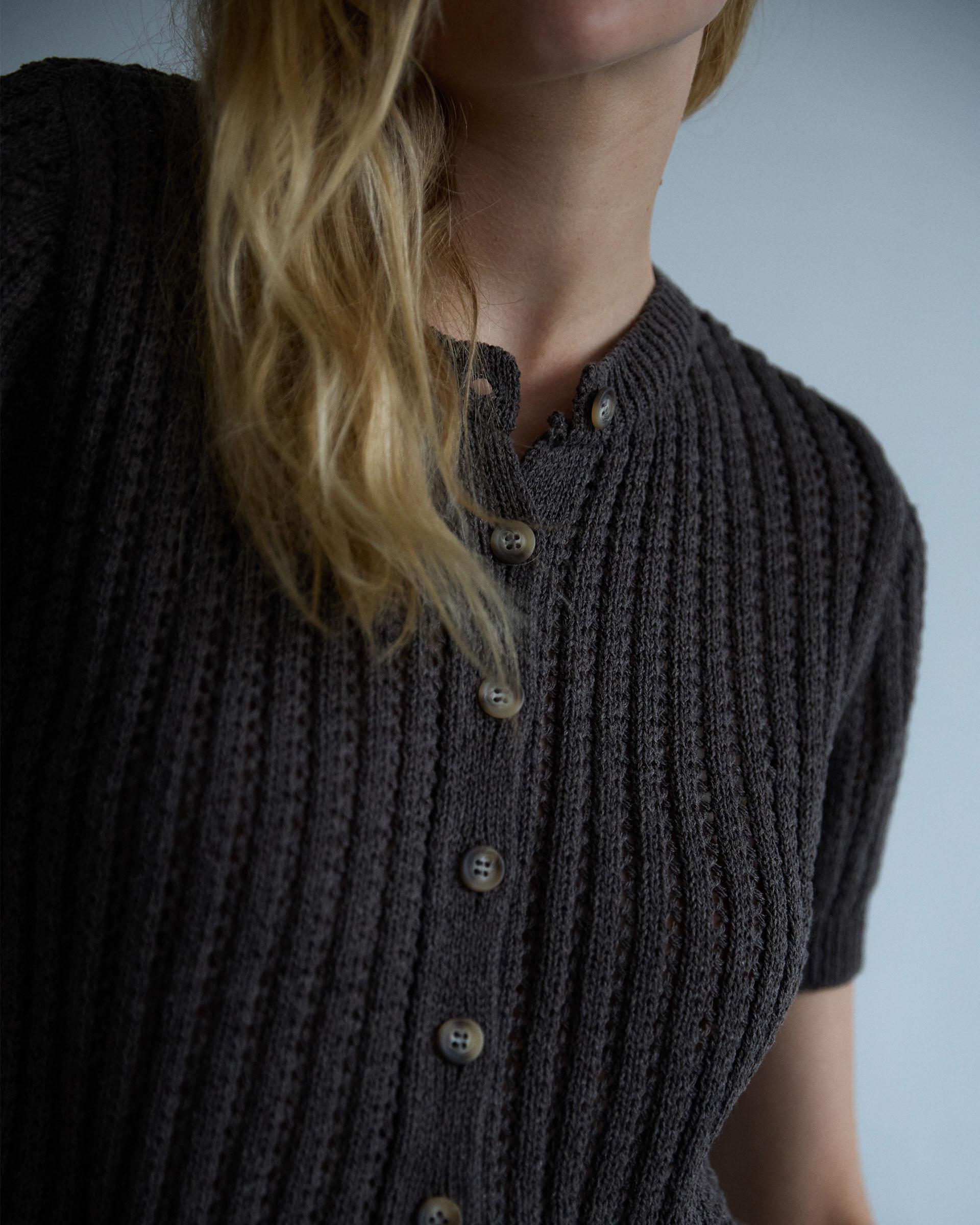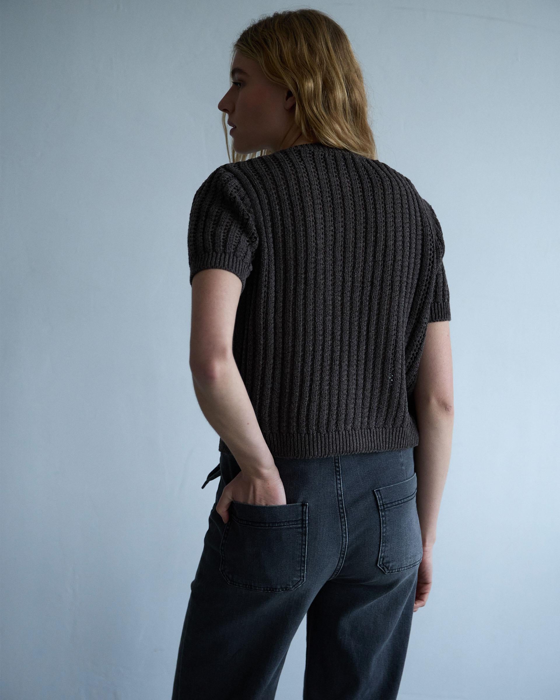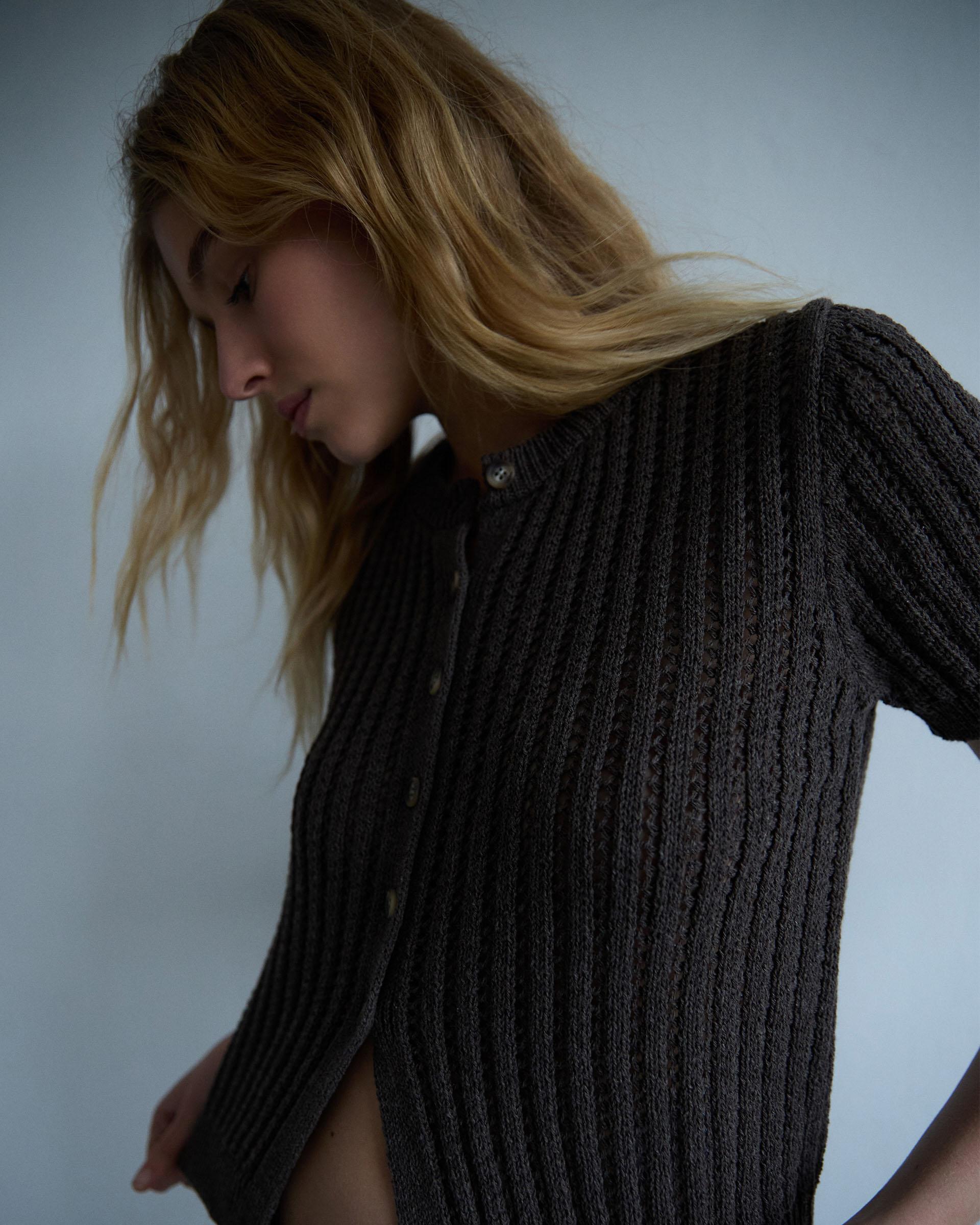 Top de punto de manga corta con detalle de calados, botones en delantero y cuello redondo, de color marrón.