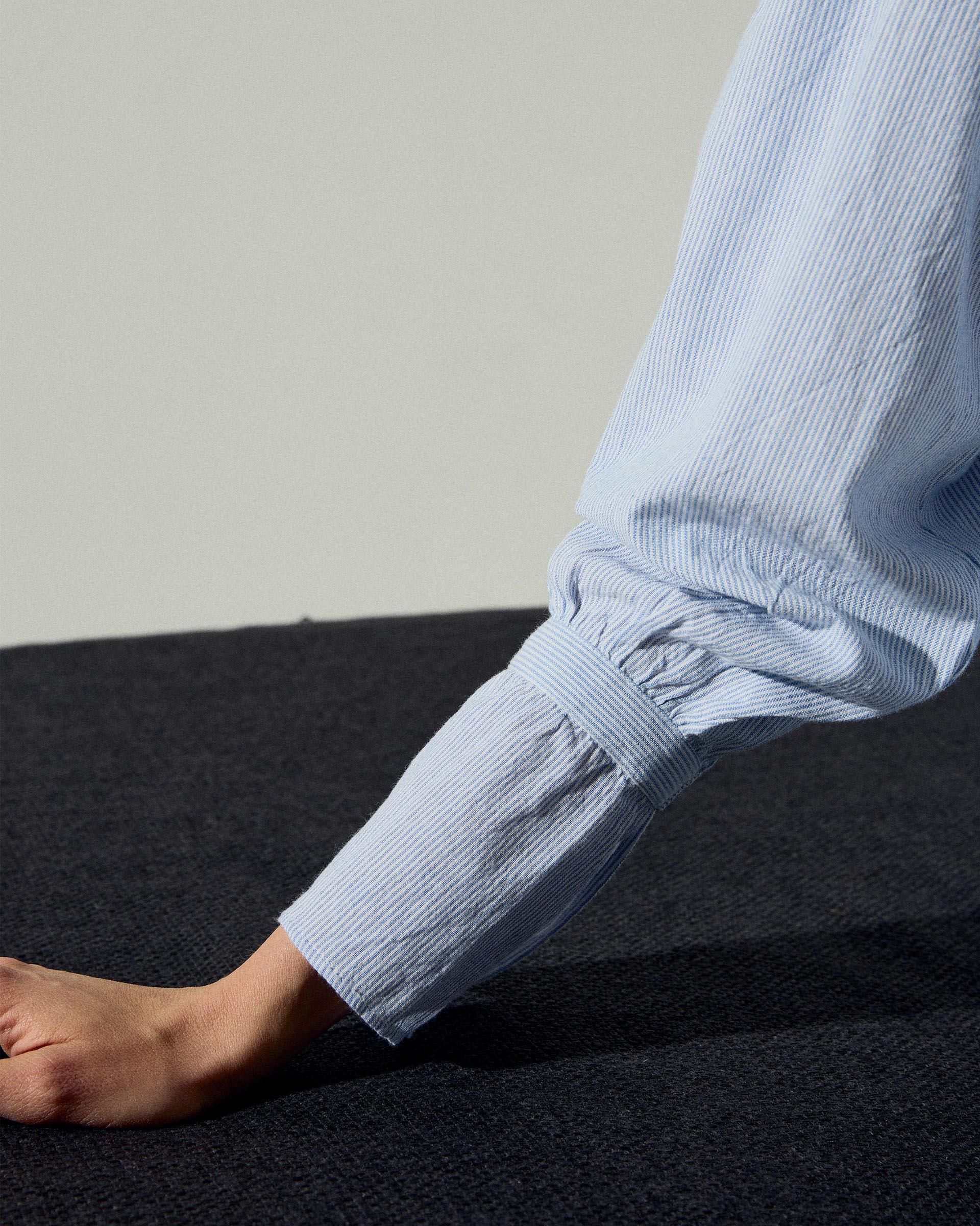Blusa de manga larga con estampado de rayas azul y blanco, cuello redondo y detalle de puños con trabilla y botón.