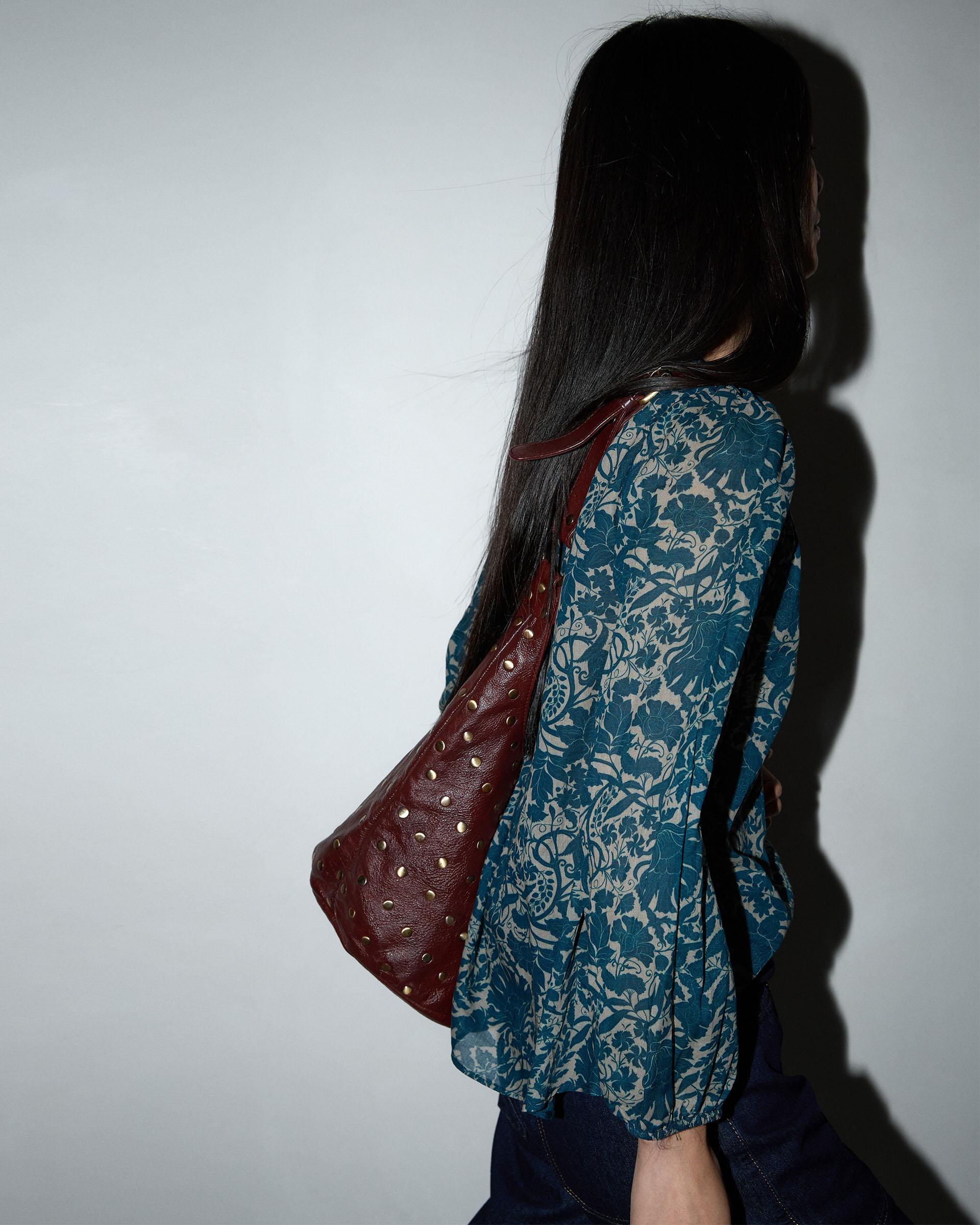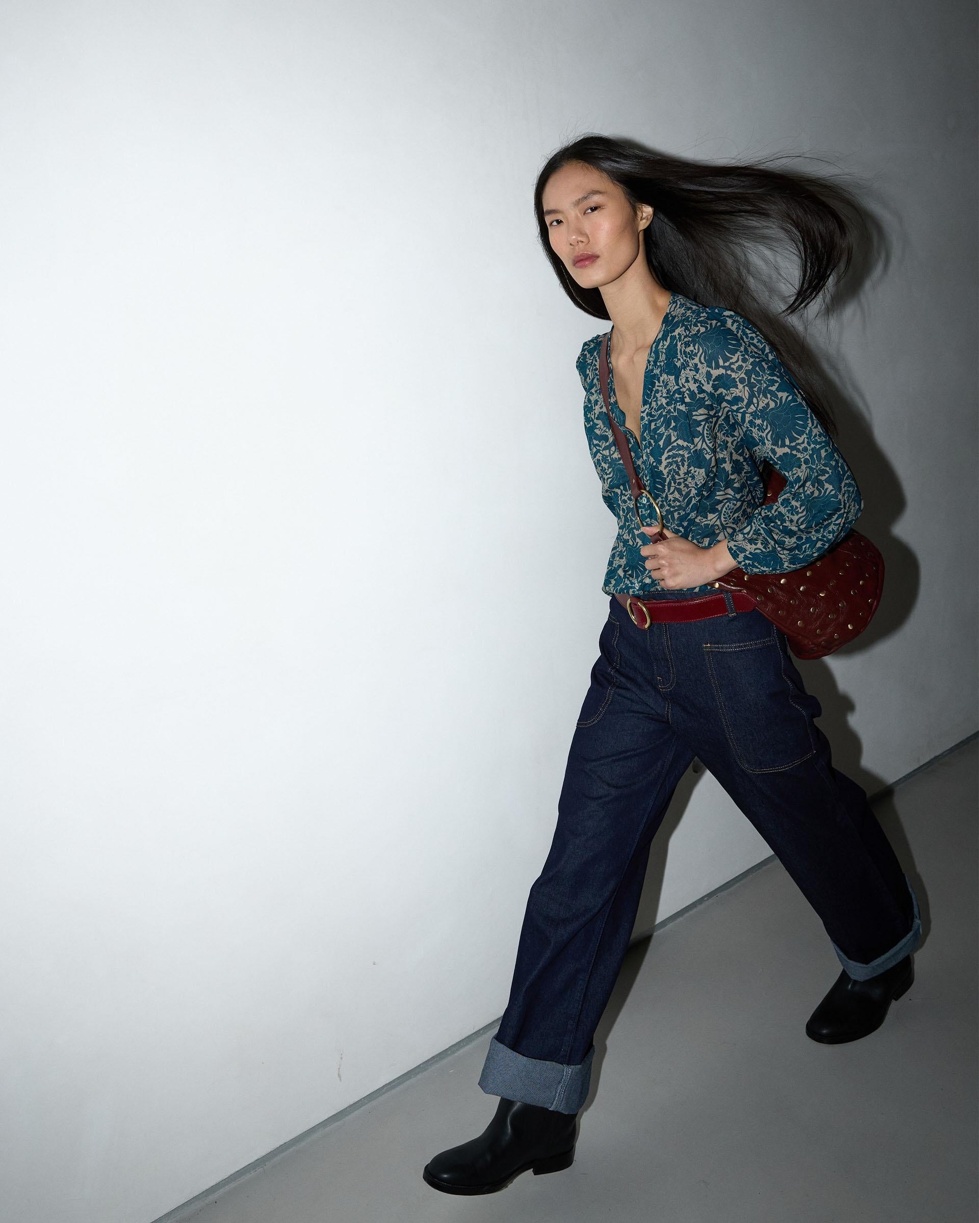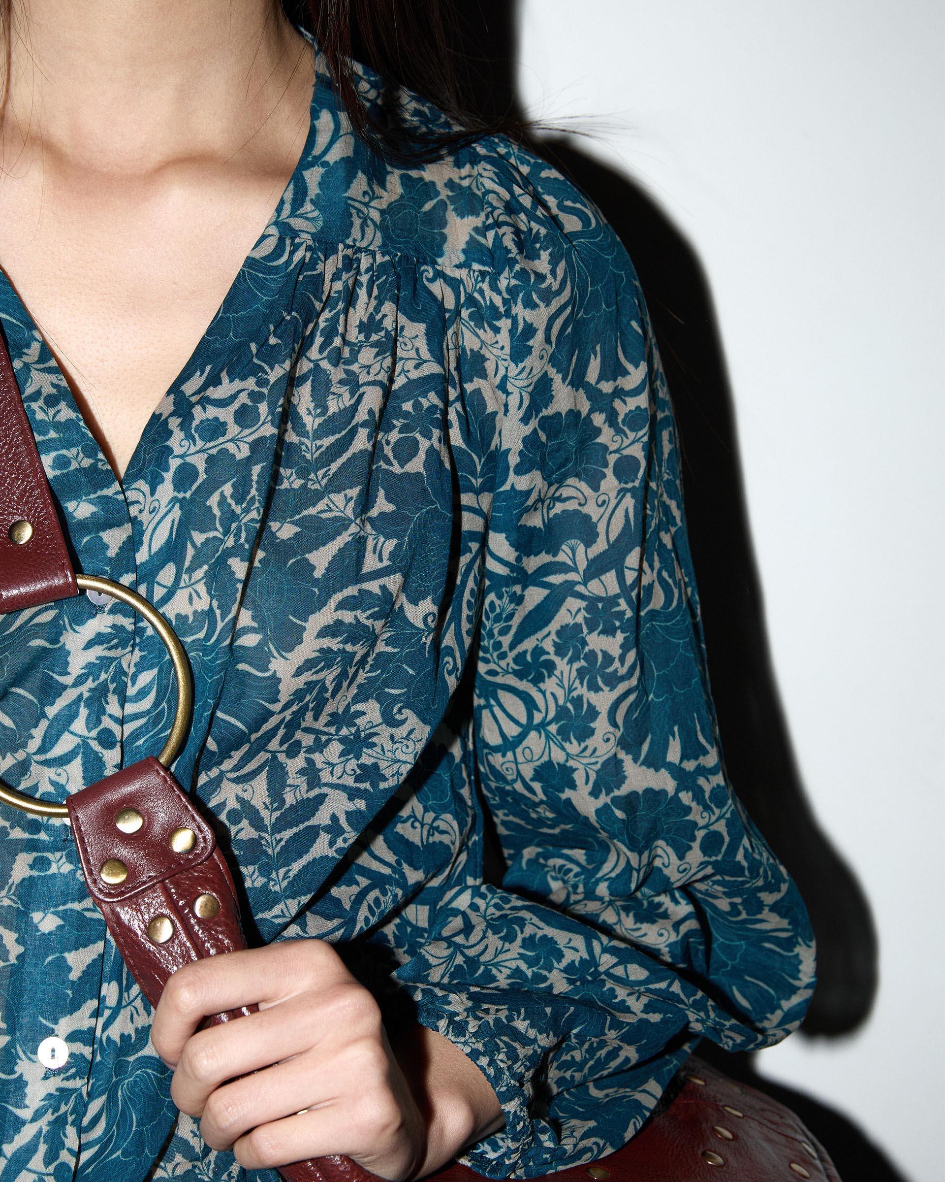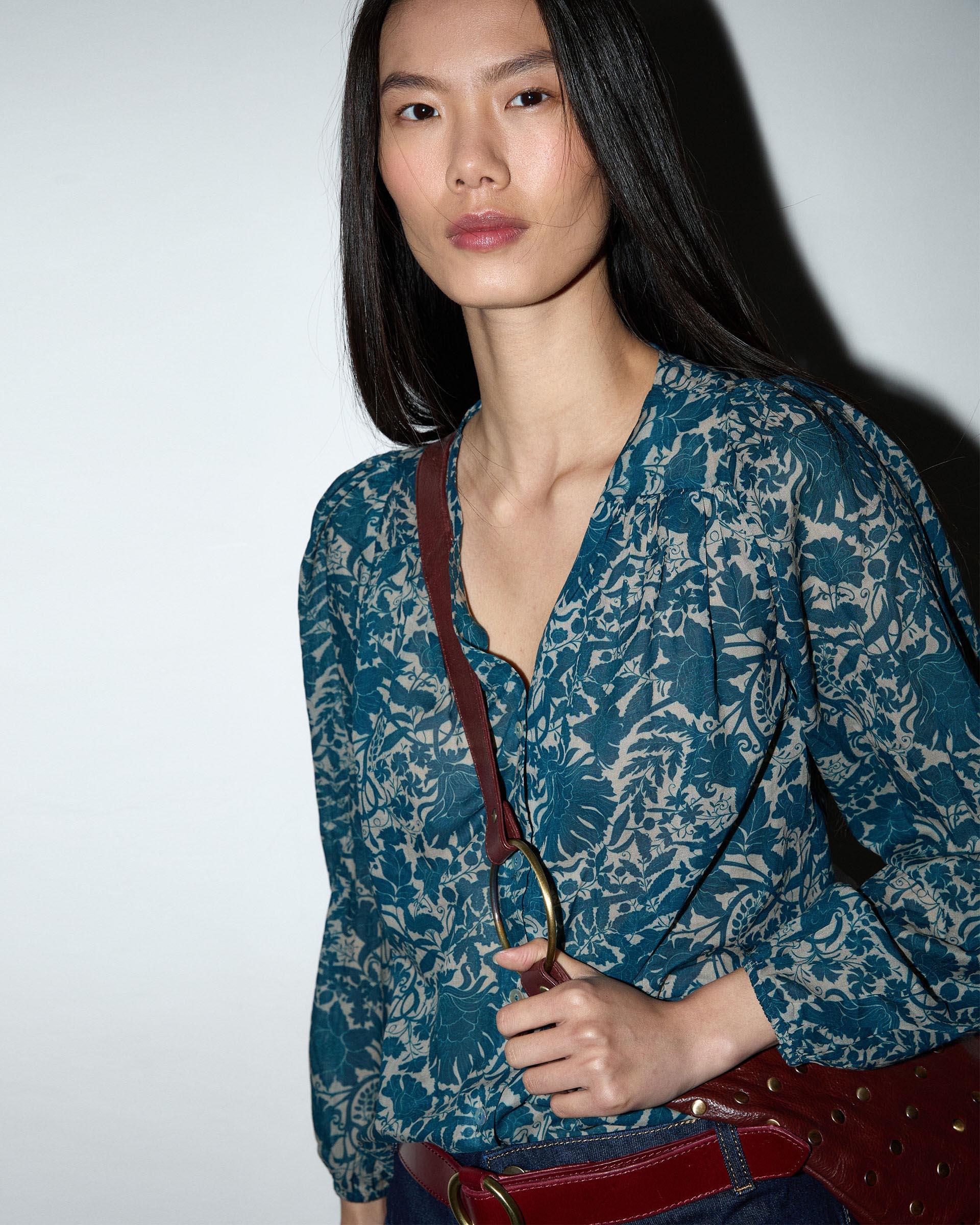 Blusa fluida de manga larga con escote en pico y botones de nácar en delantero, con estampado floral en color petróleo.