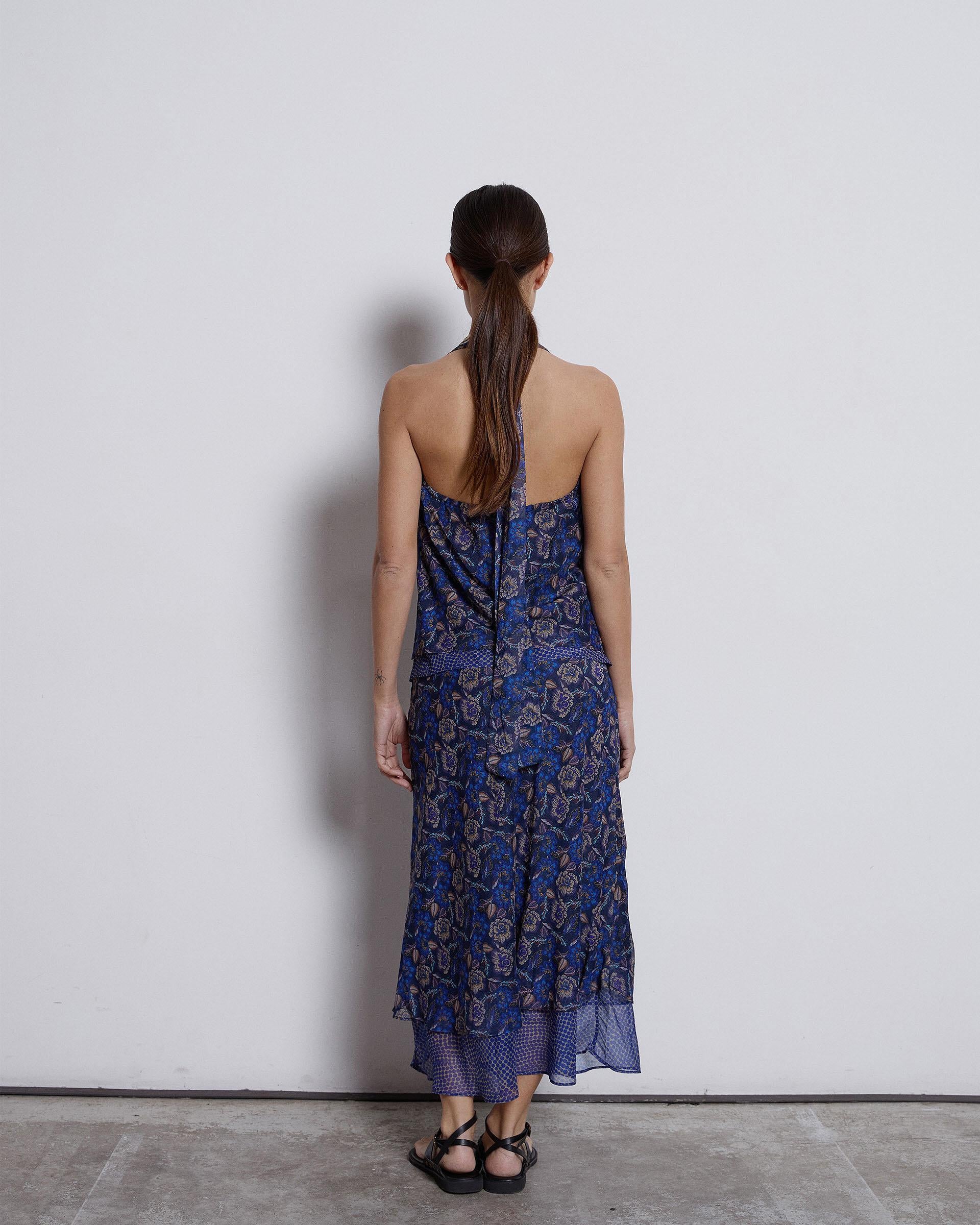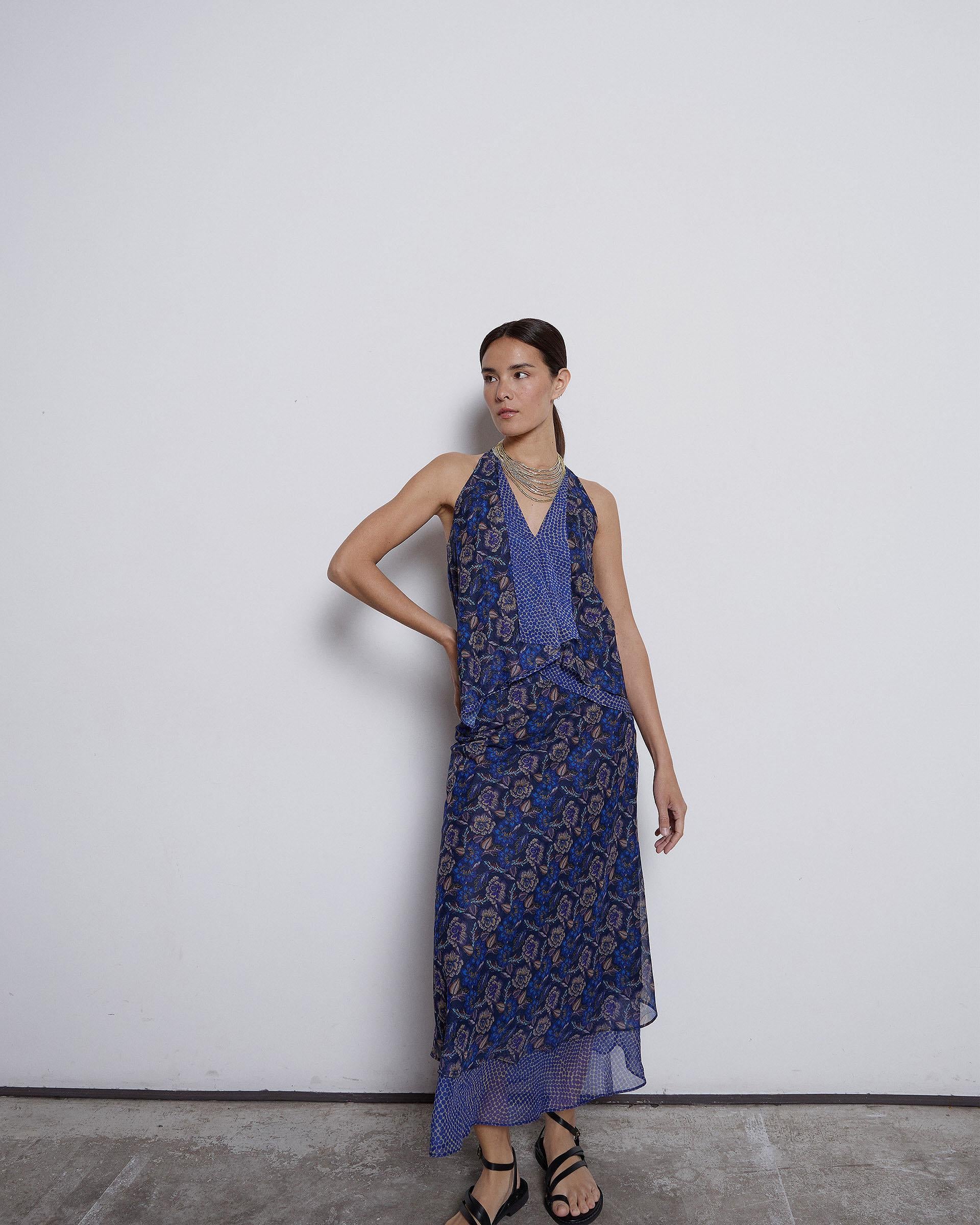 Falda larga de gasa de estampado floral en tonos negros y azules, con combinación de tejidos y bajo en forma de picos.