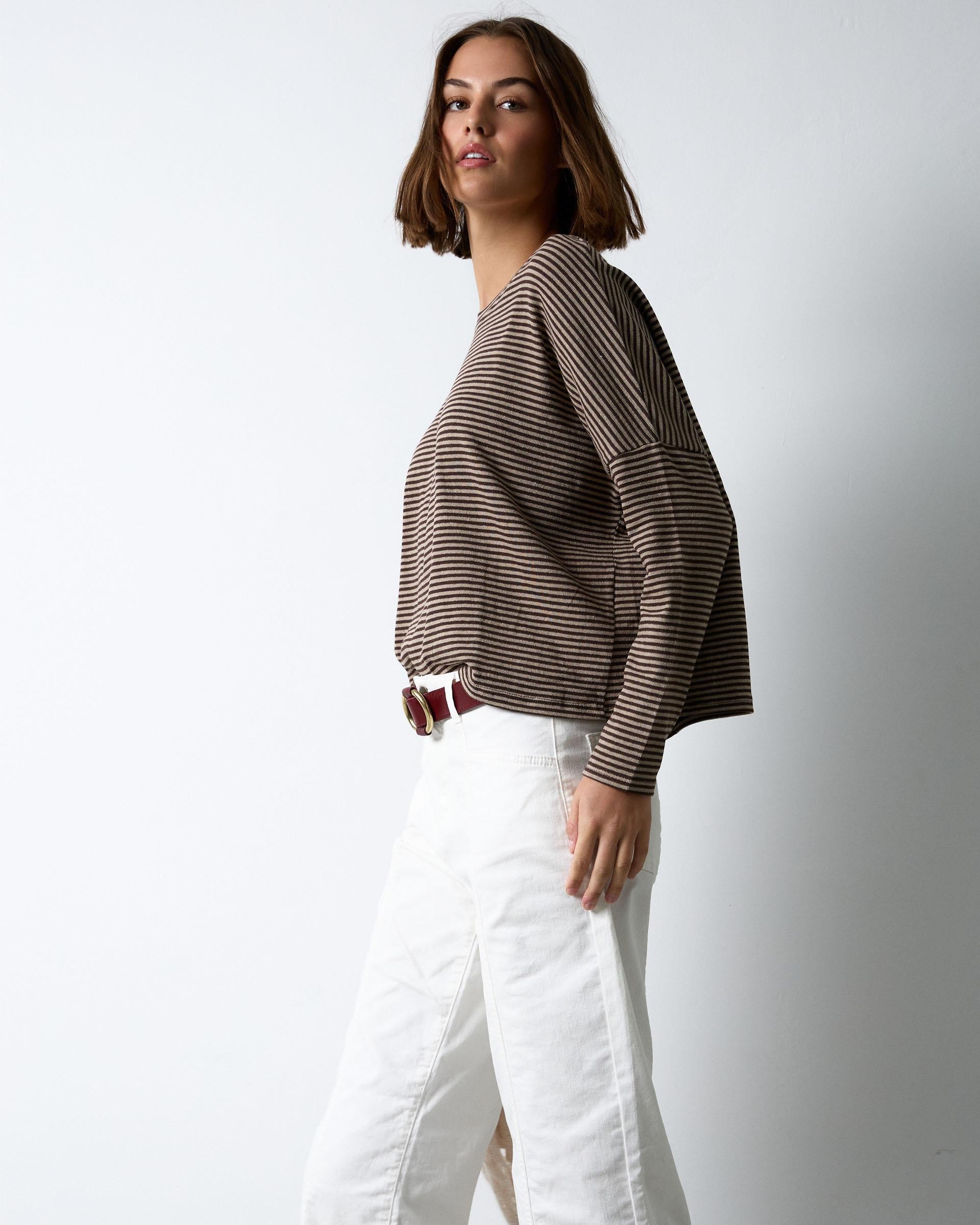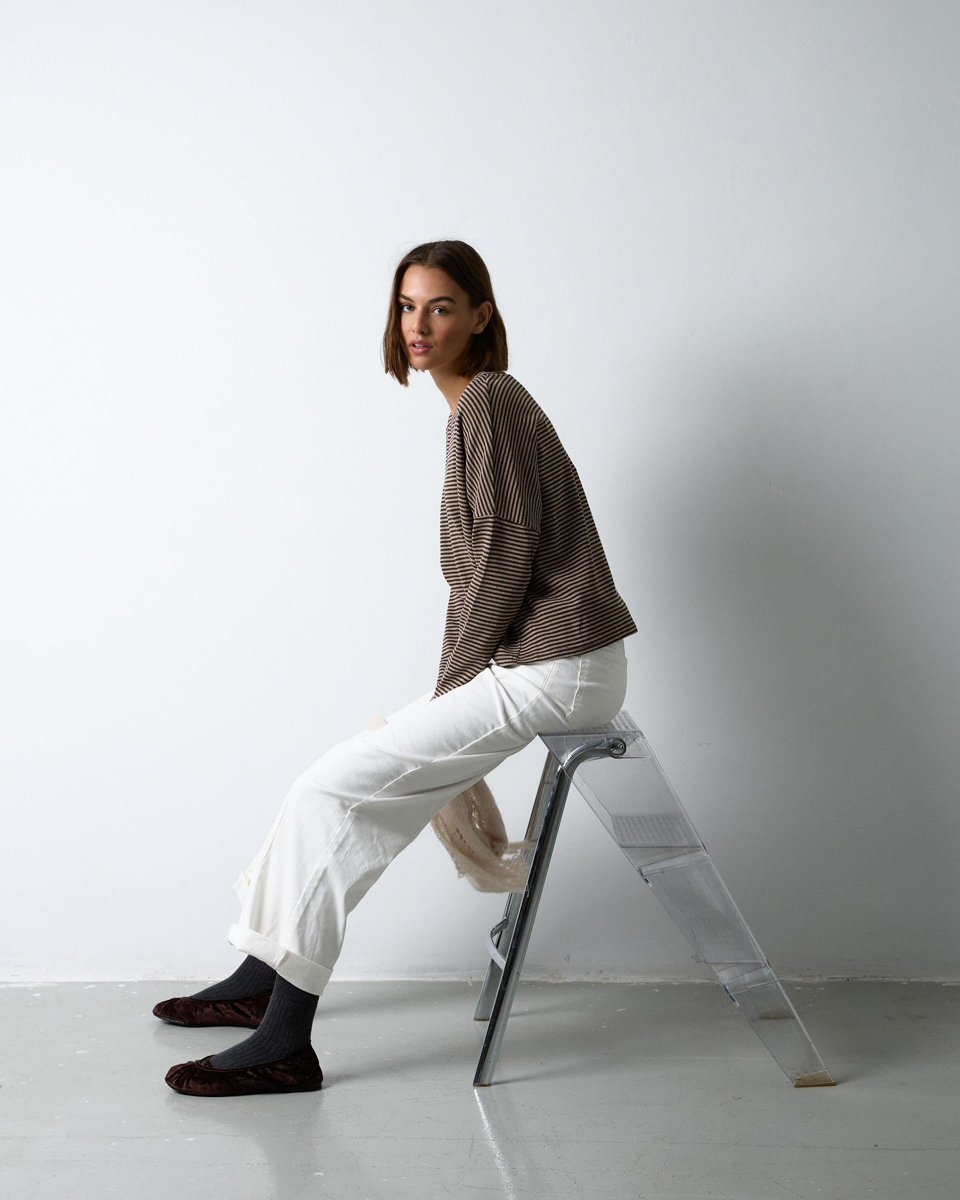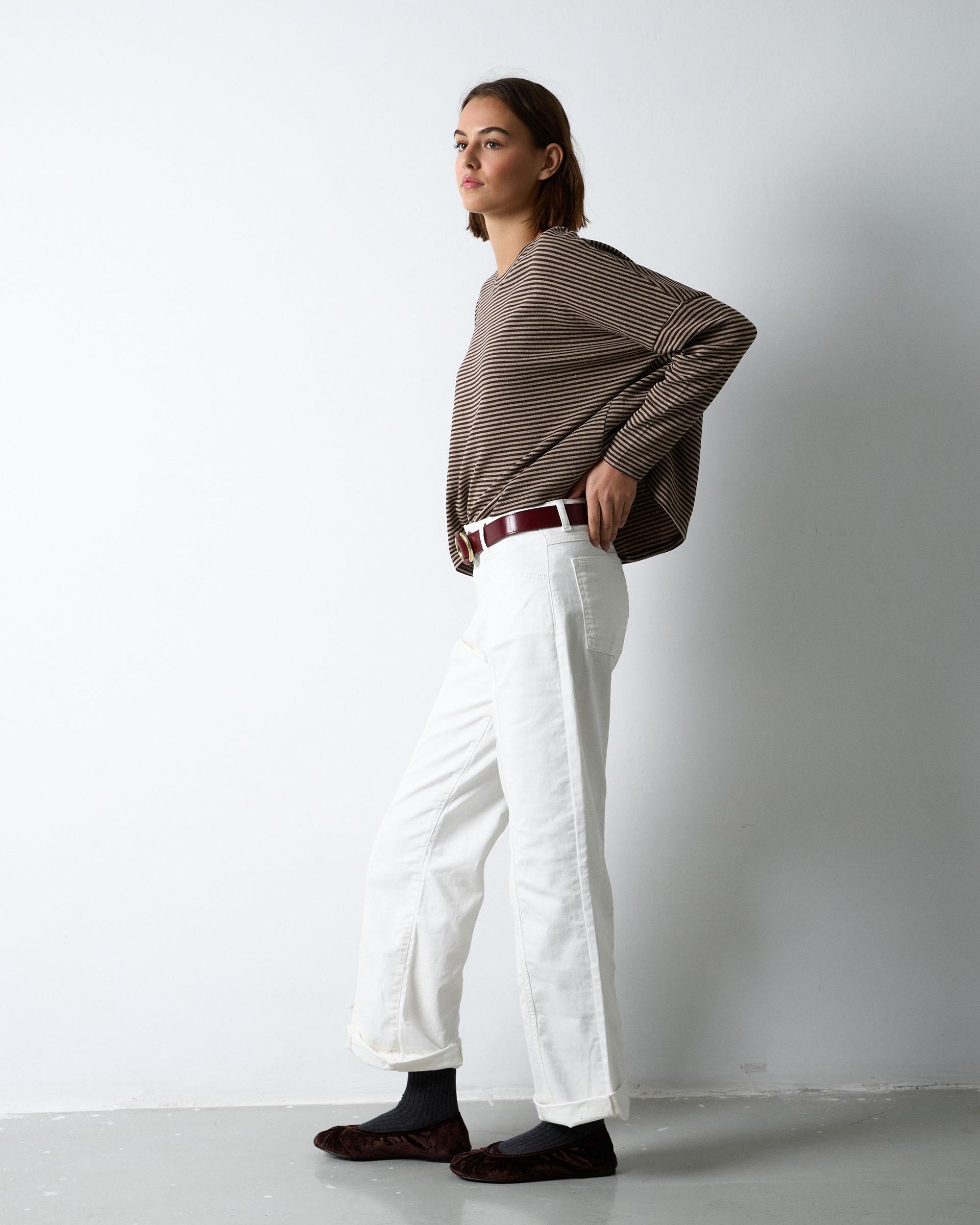 Pantalones con dobladillo, de color blanco, costuras en delantero y bolsillos en ambos lados.