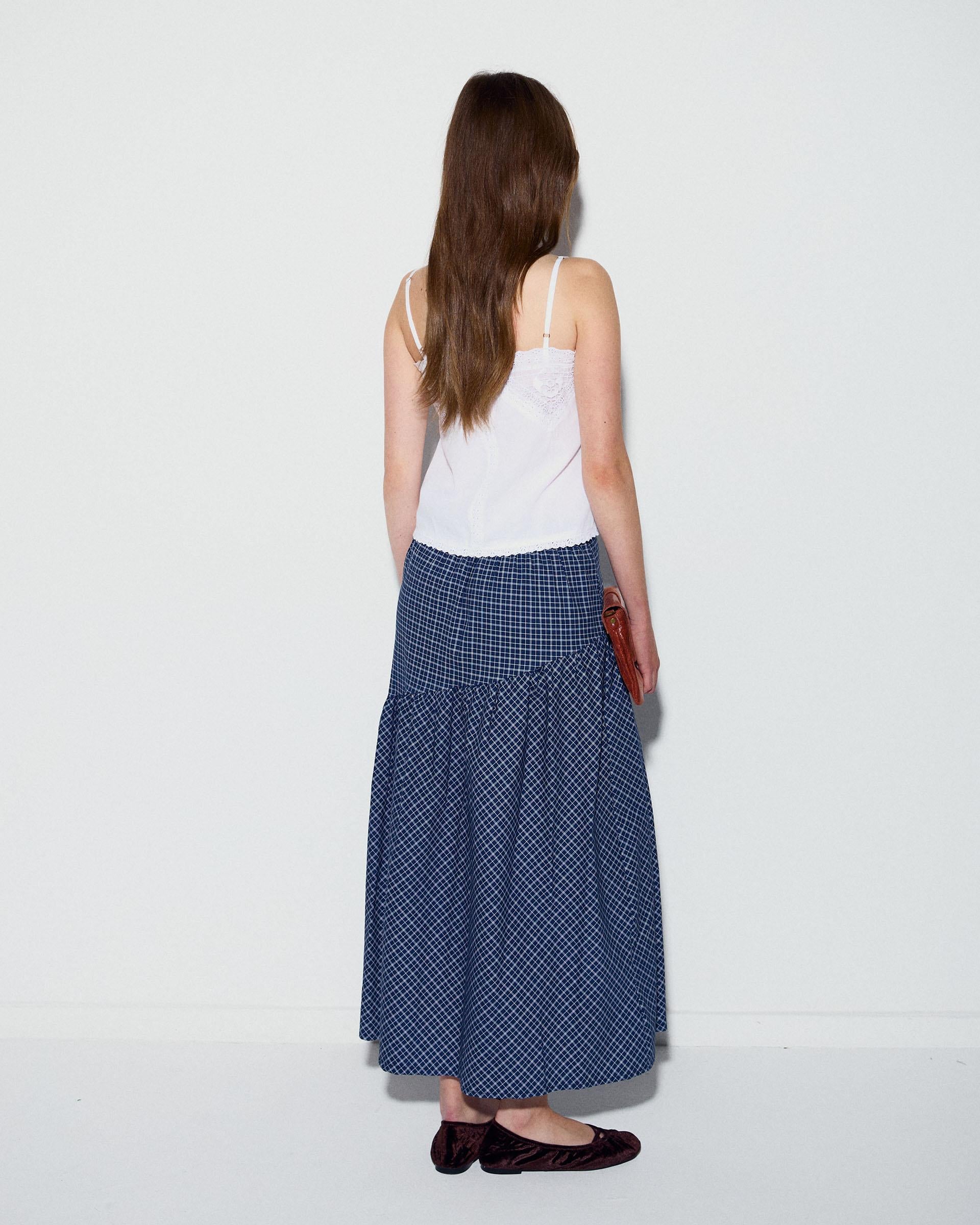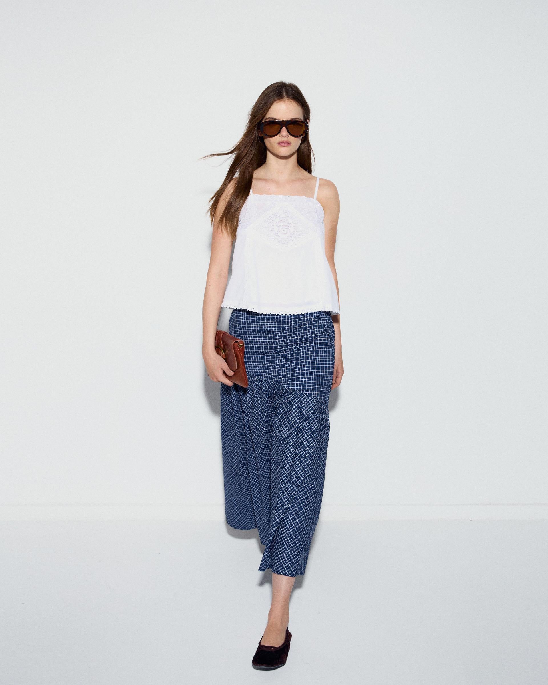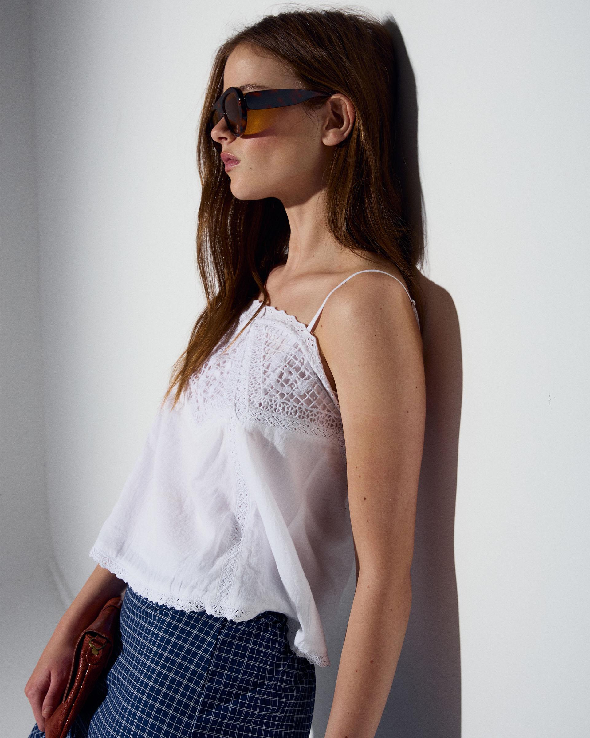 Top de color blanco estilo lencero, con tirantes finos y detalle de encaje a tono.
