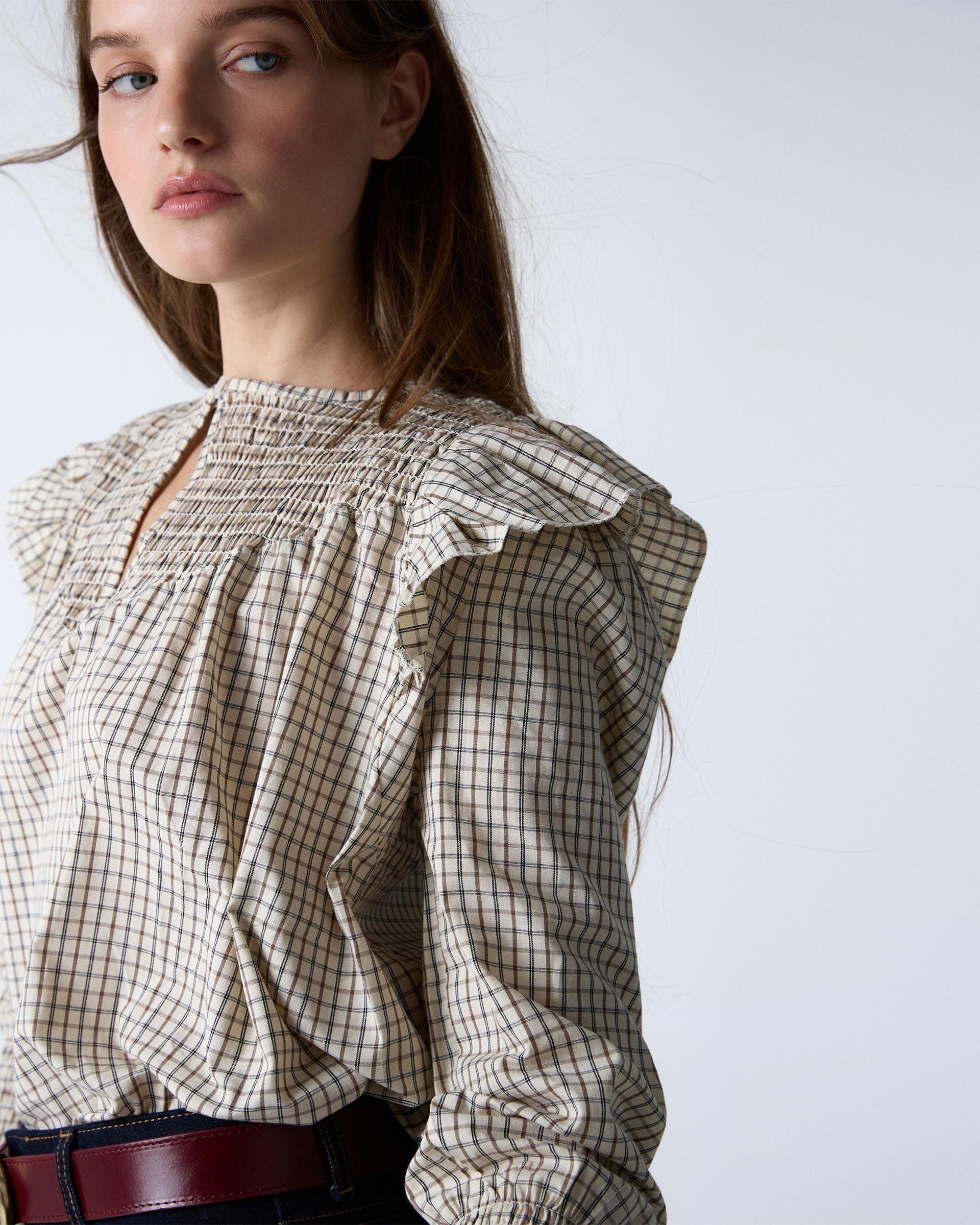 Blusa de cuadros de cuello redondo con lágrima y botón en delantero, nido de abeja en escote y volantes en hombros y puños.