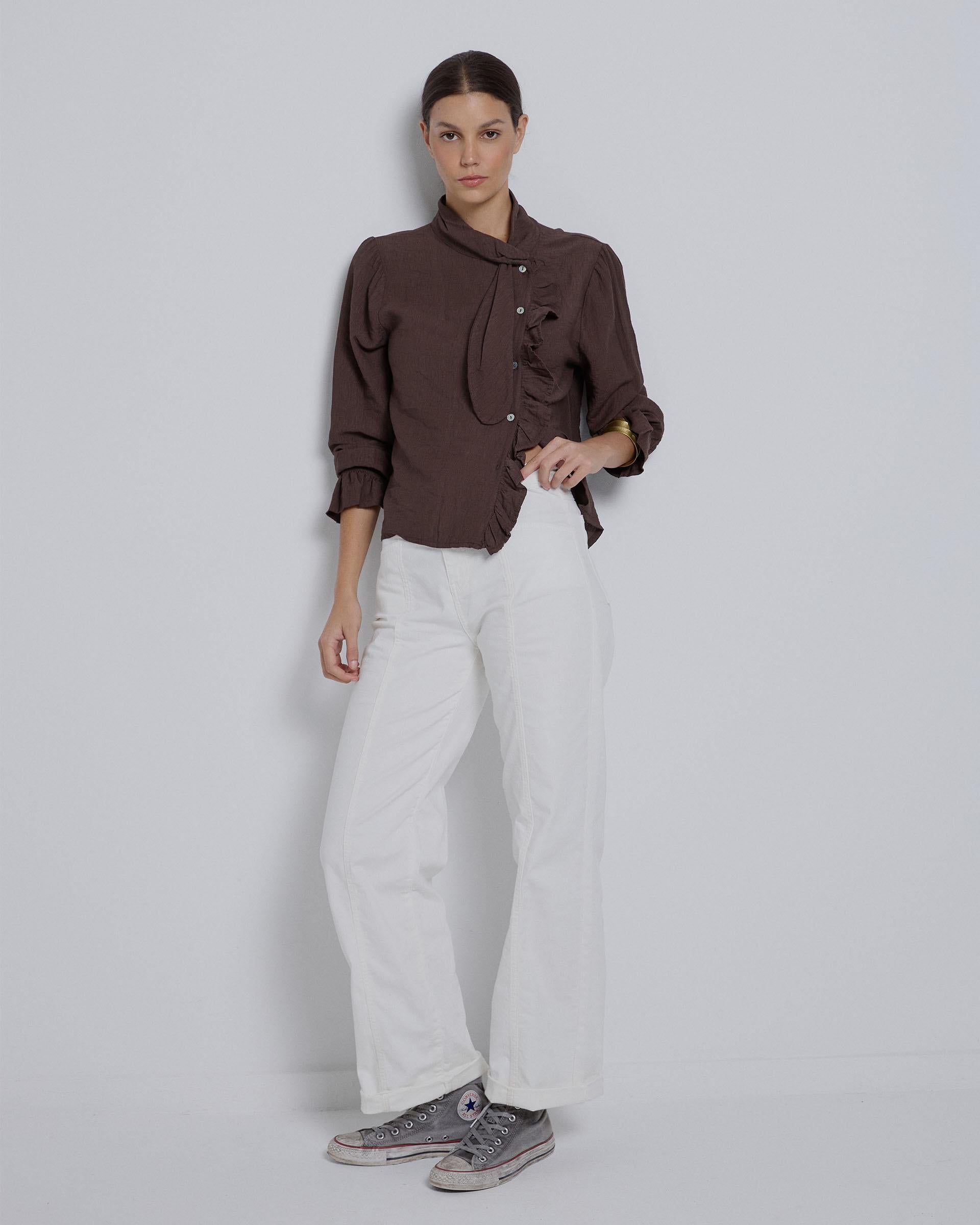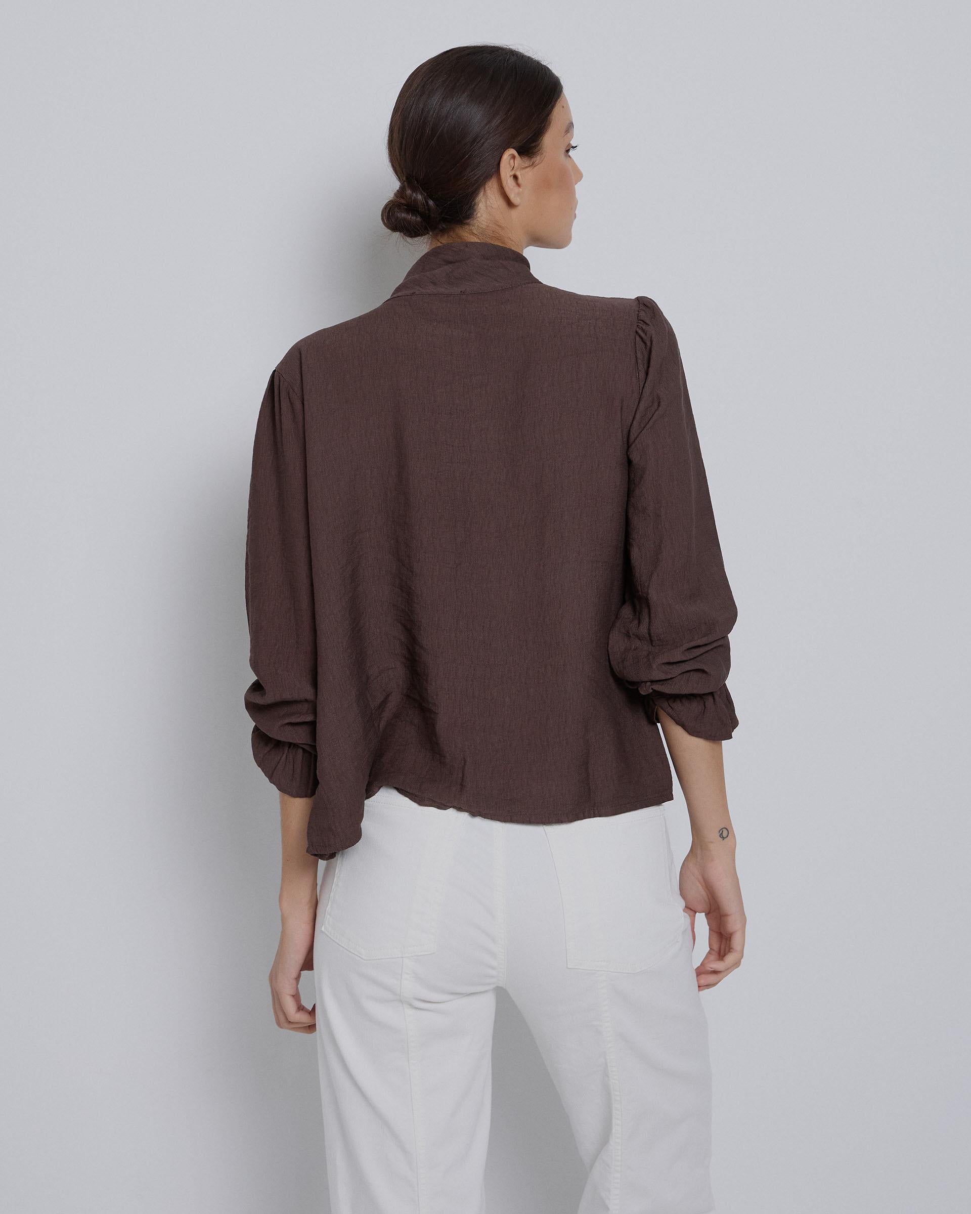 Blusa de manga larga con detalle de lazo al cuello y botones en lateral con volante, de color marrón.