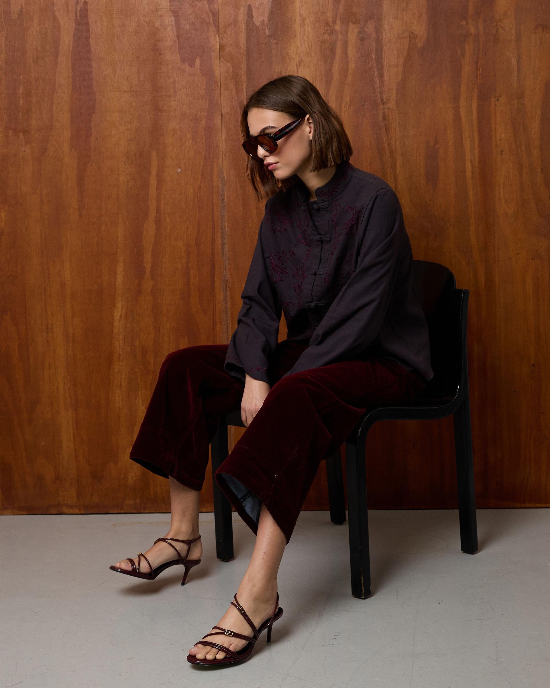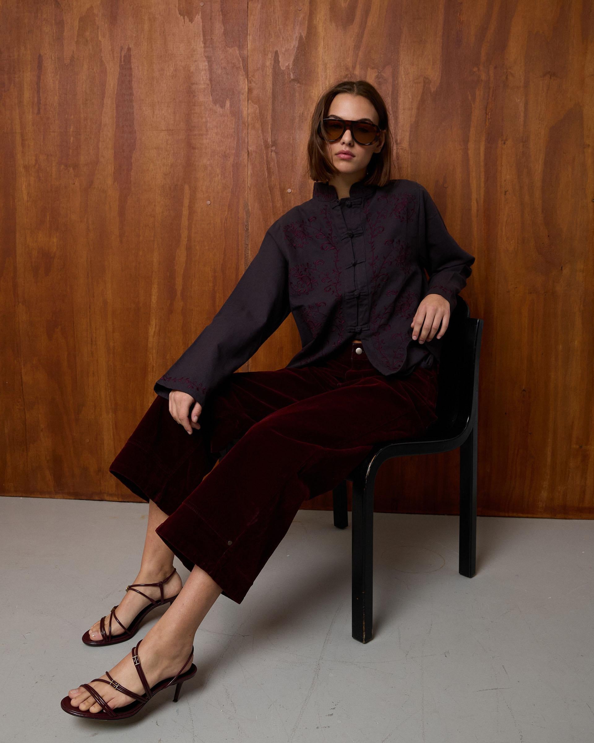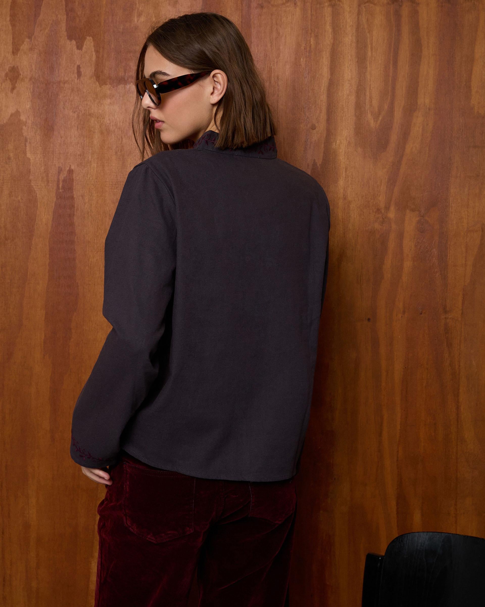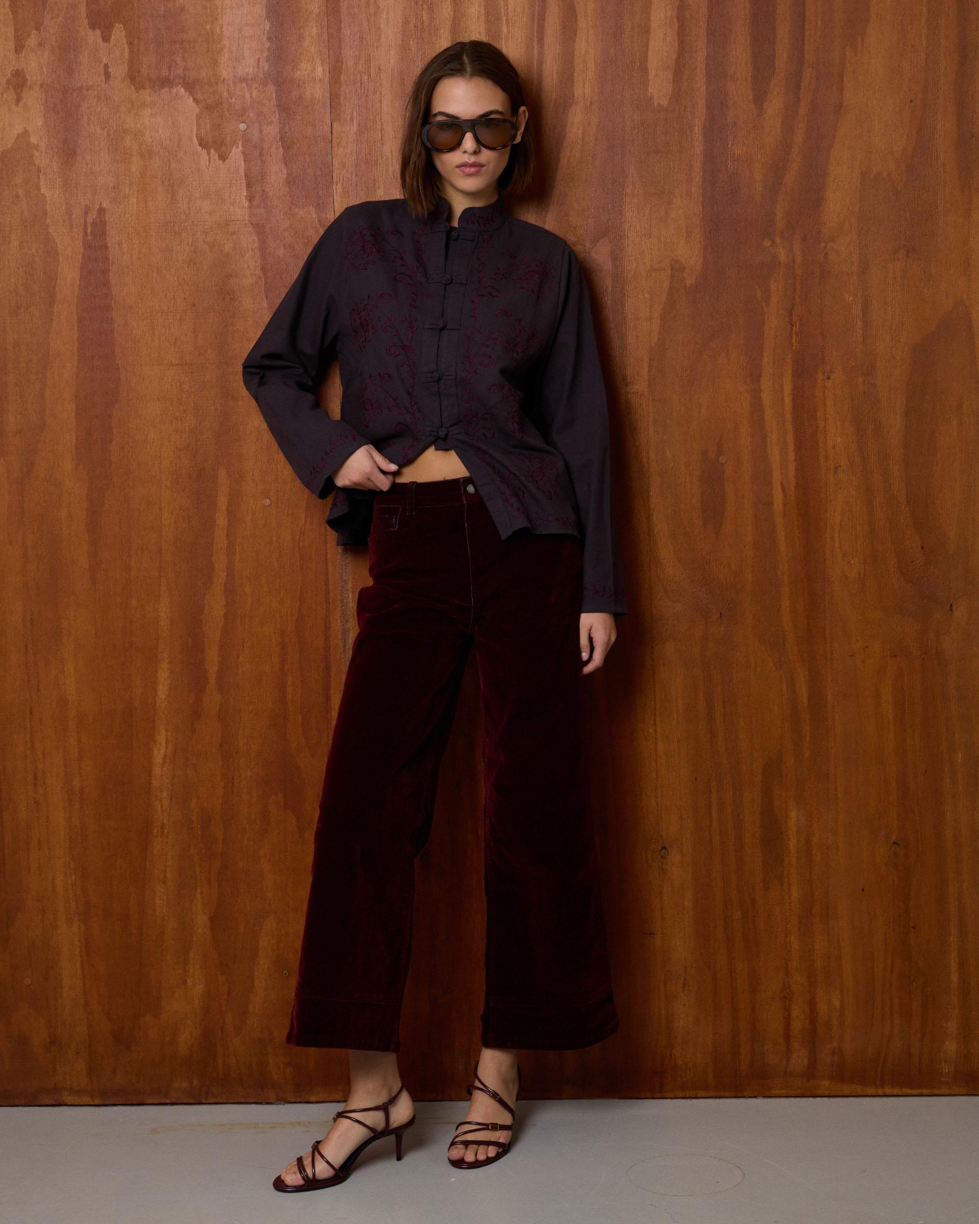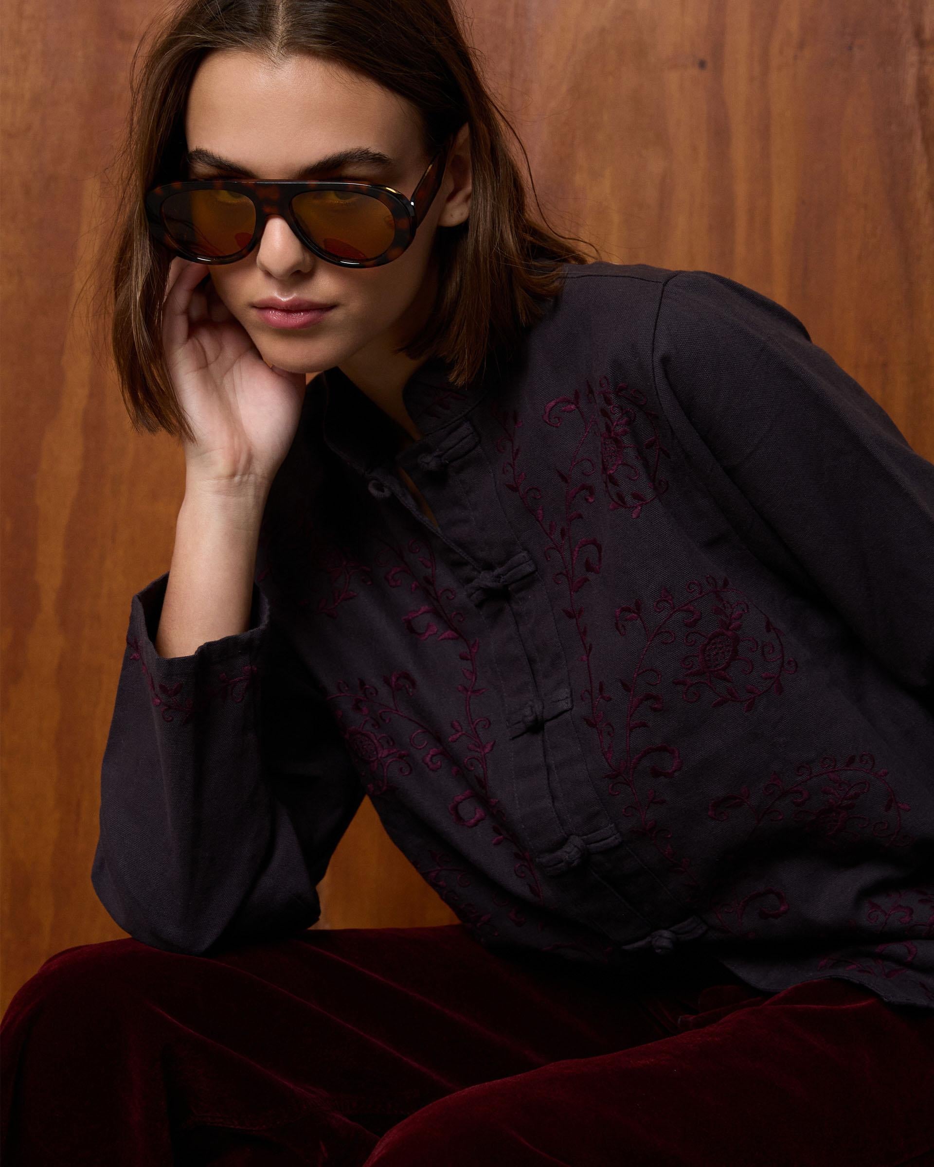 Chaqueta estilo japo con botones en delantero, bordados estilo floral y cuello mao.
