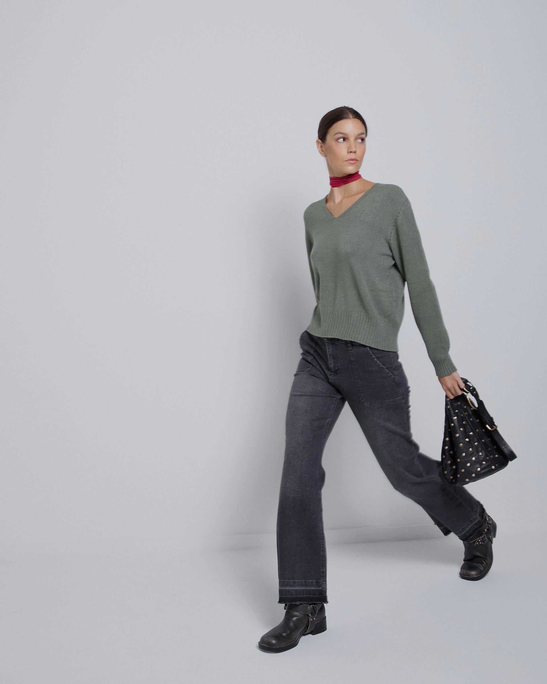 Jersey de punto de color verde oscuro con cuello pico, canalé ancho en bajo y detalle de aberturas en hombros.