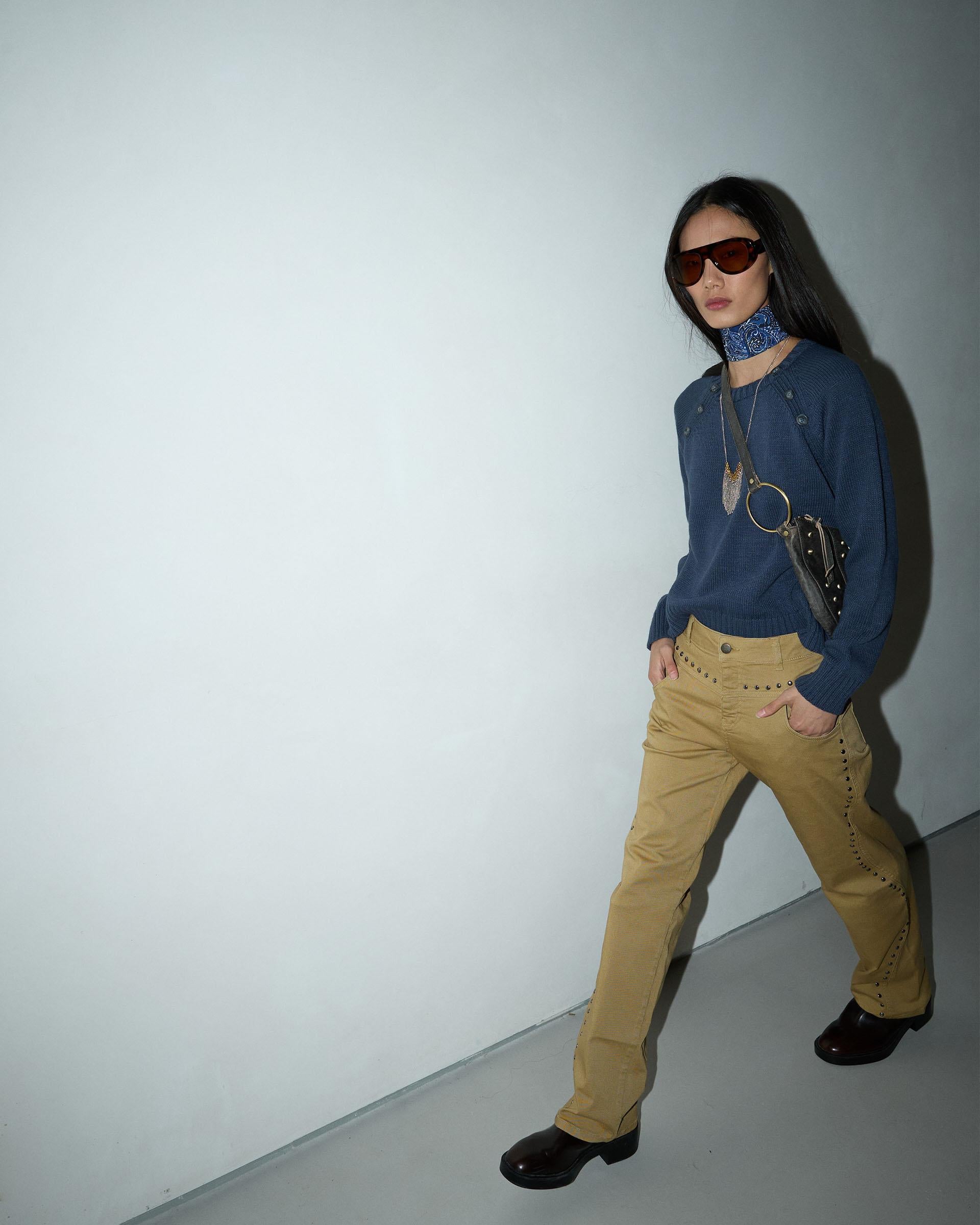 Jersey de punto con botones en diagonal en parte superior y cuello redondo.