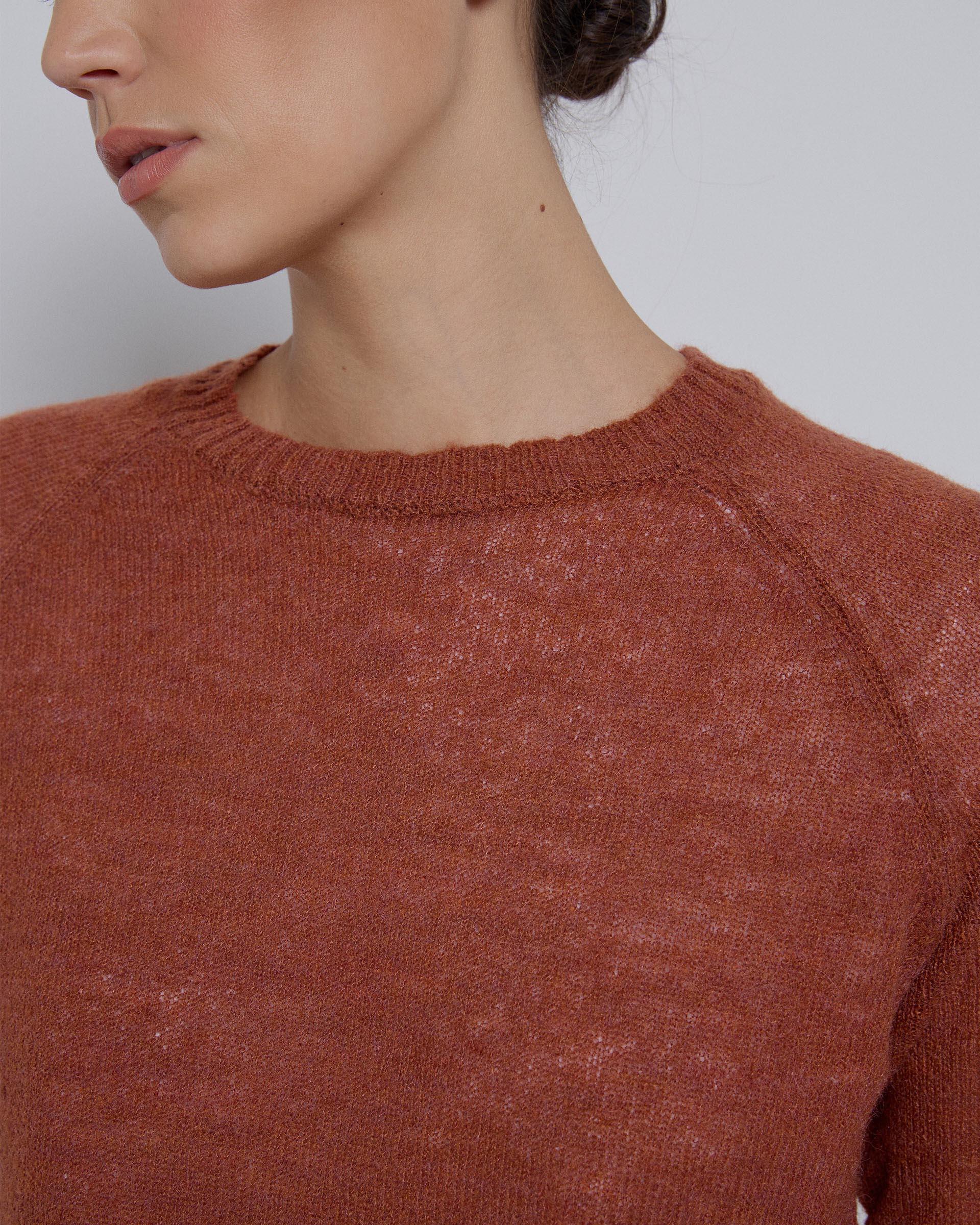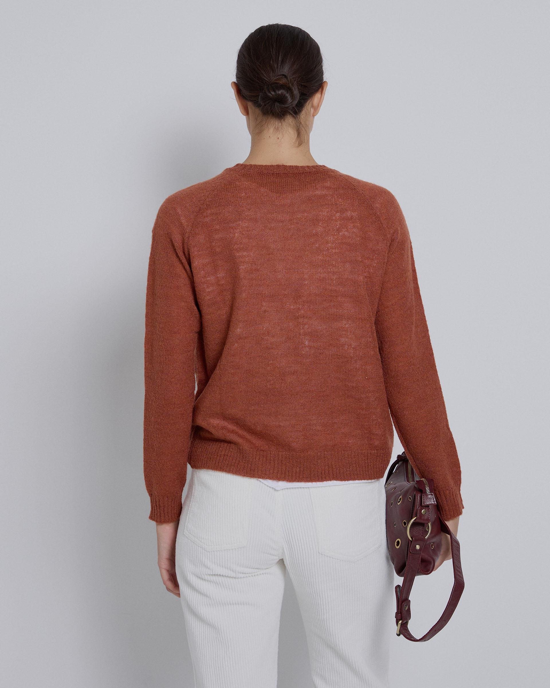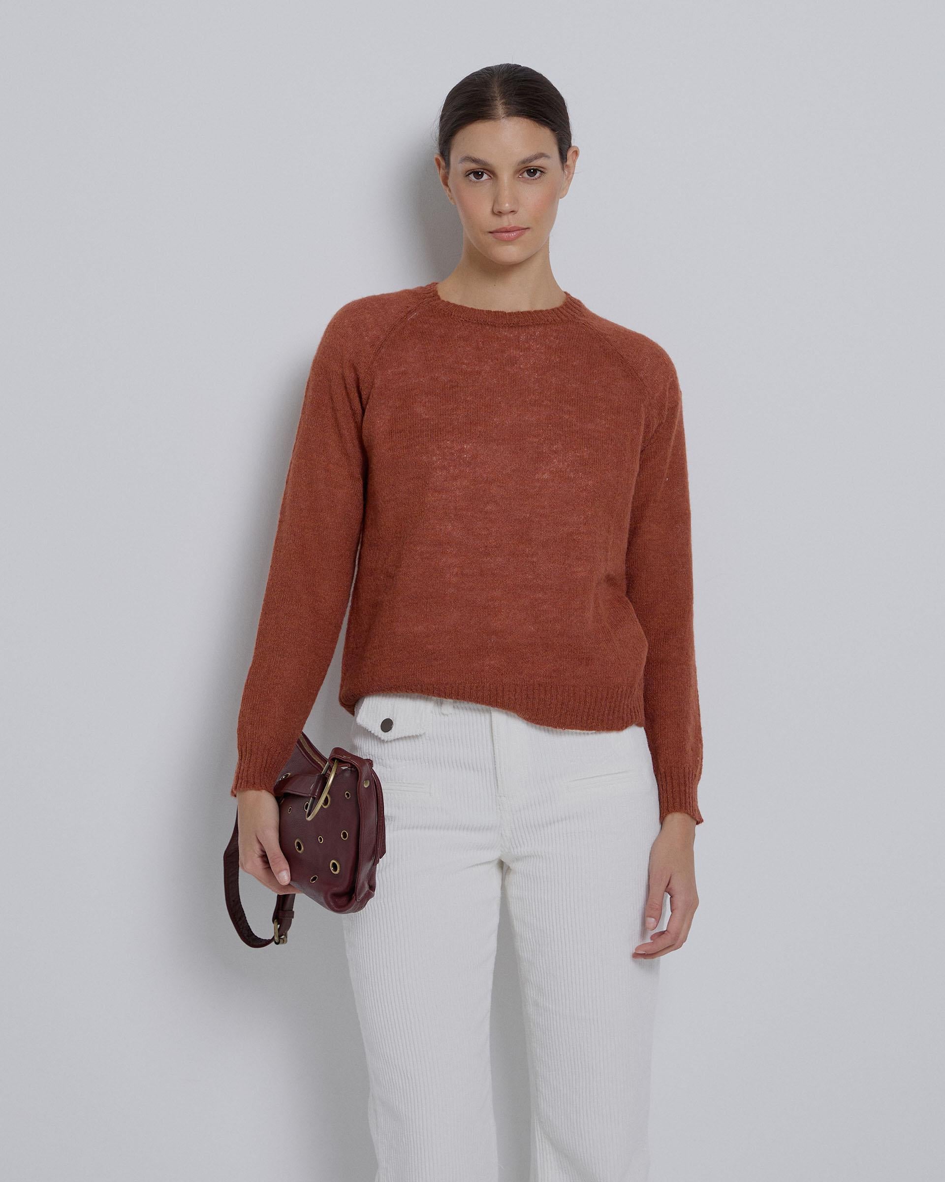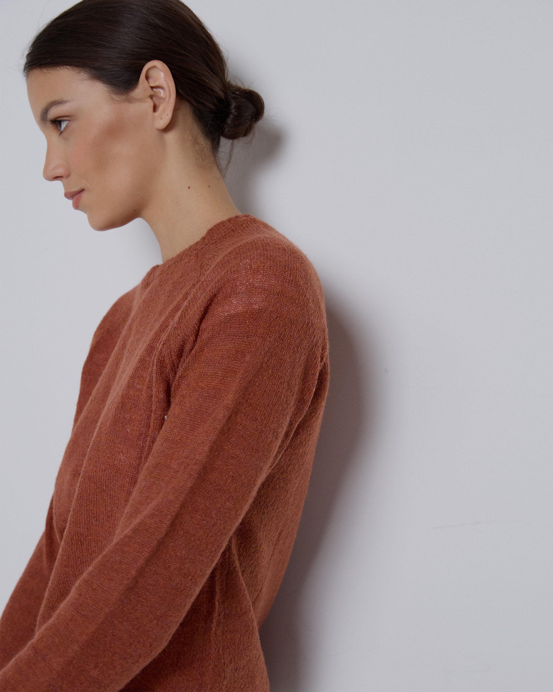 Jersey de punto de color teja con cuello redondo.