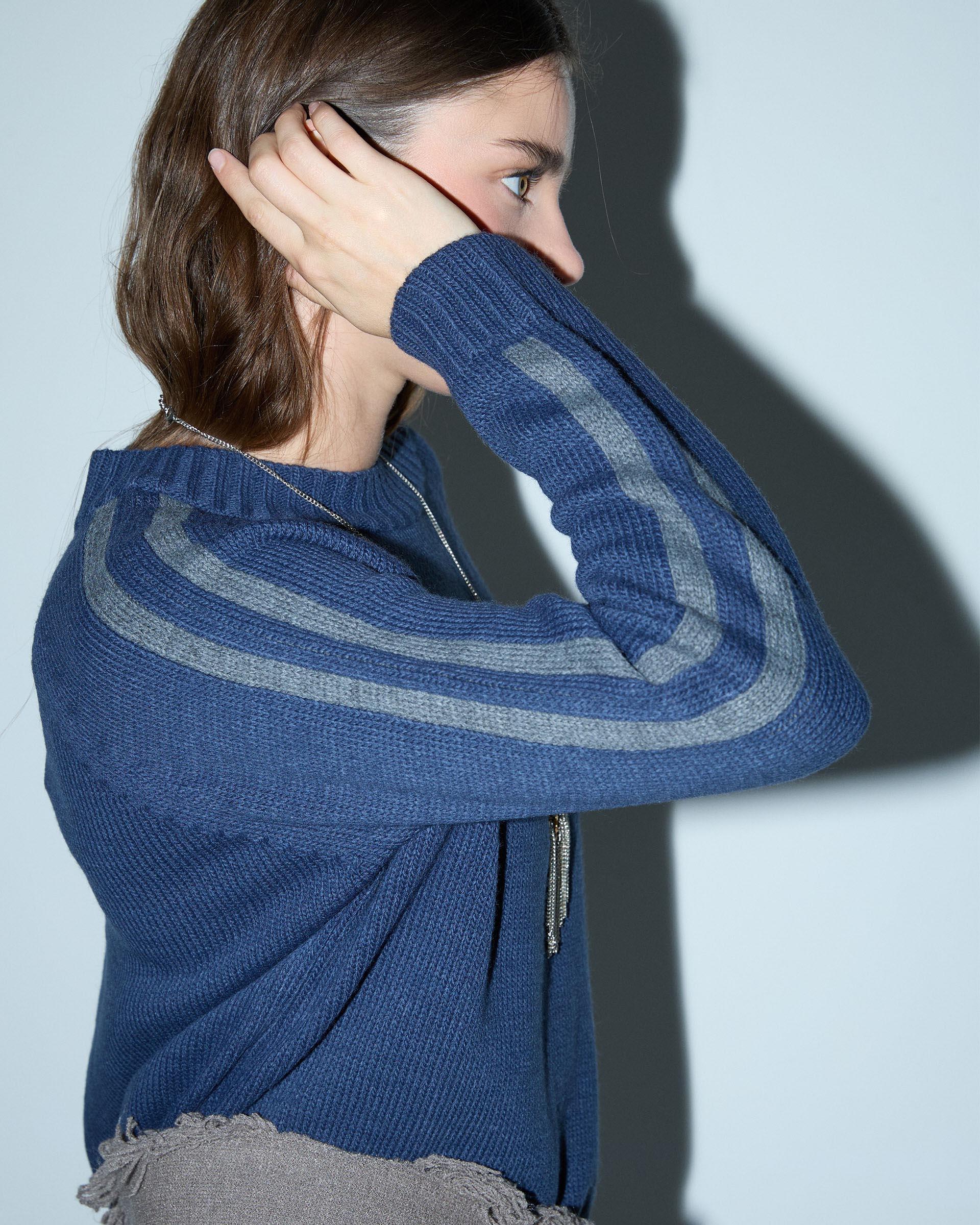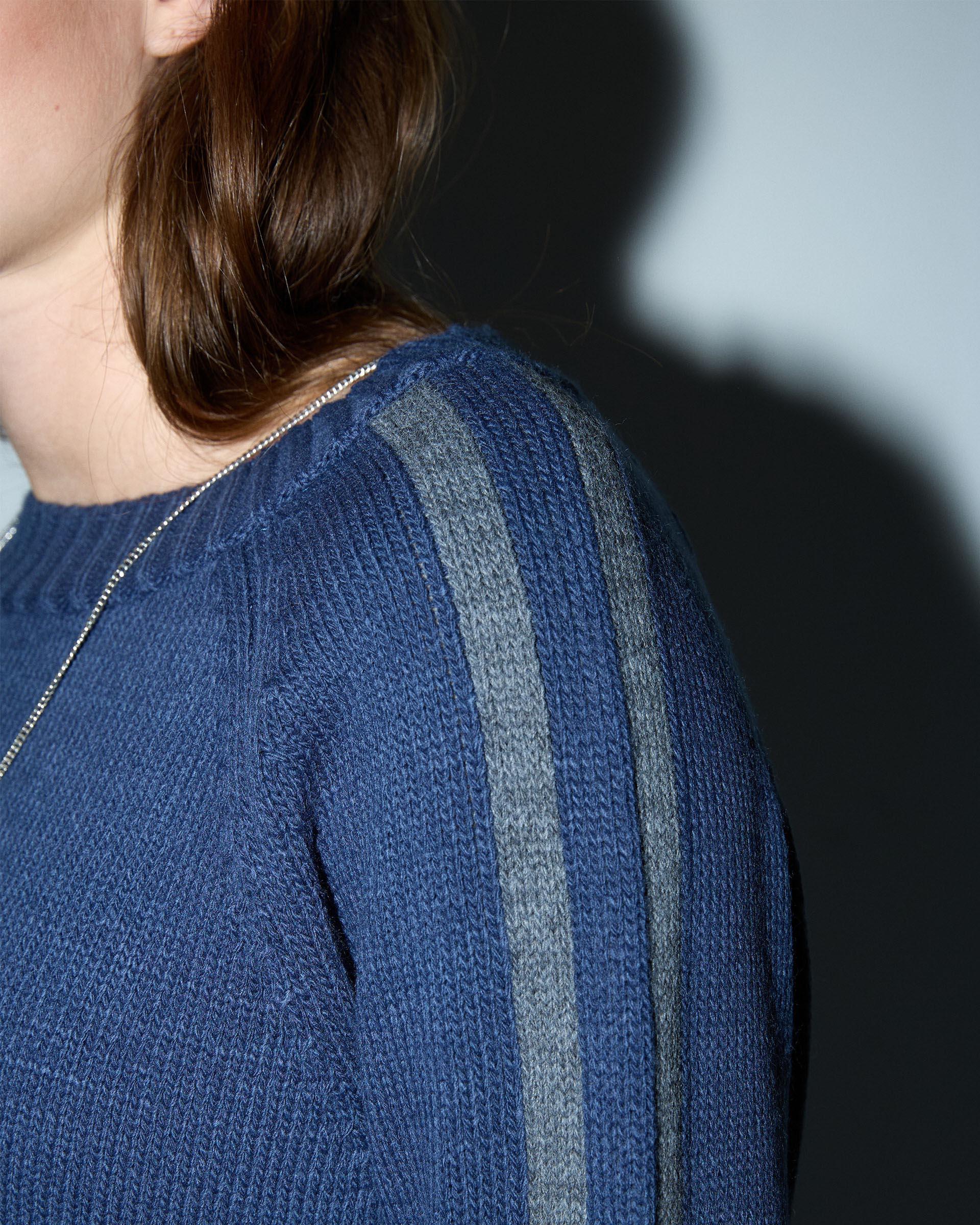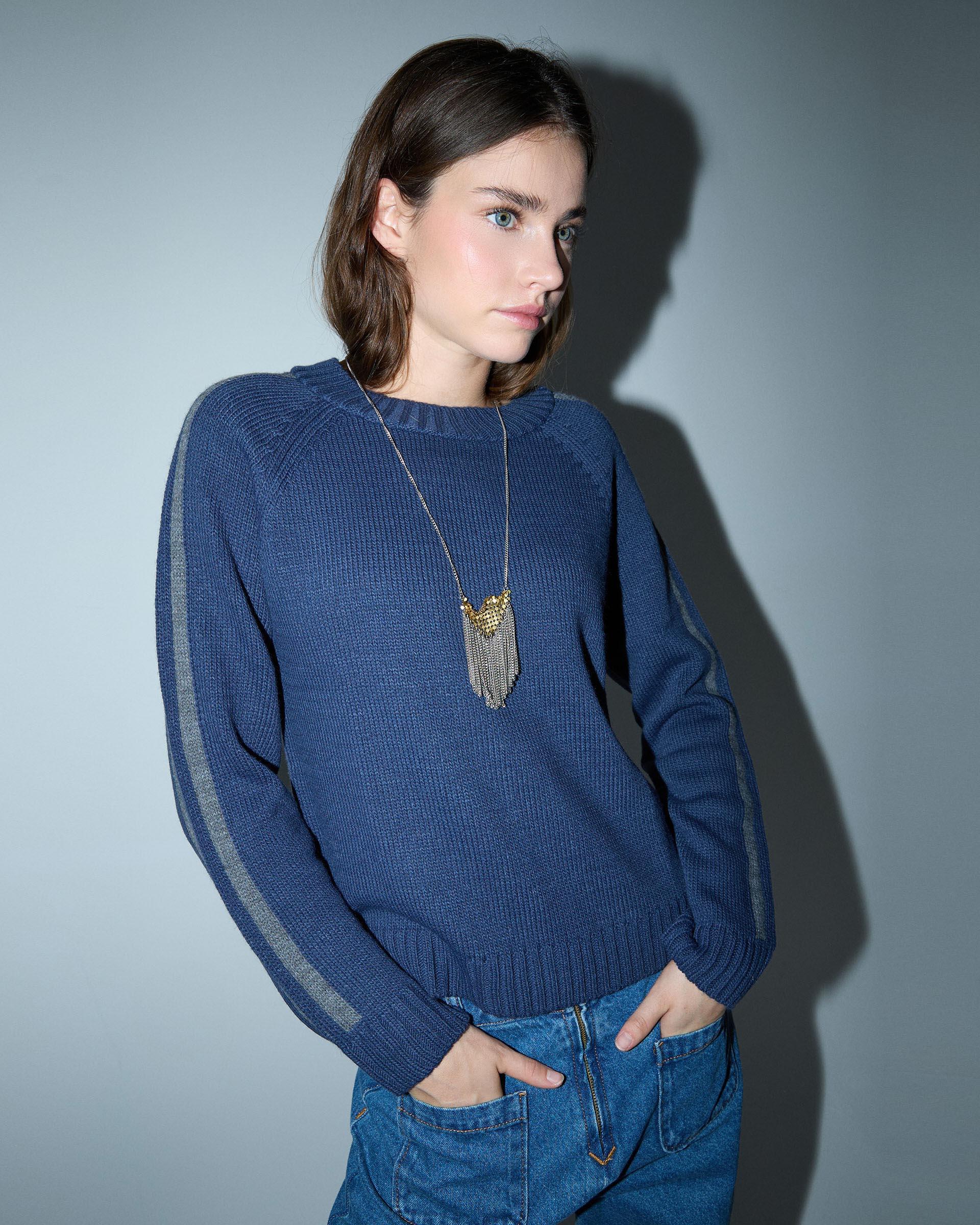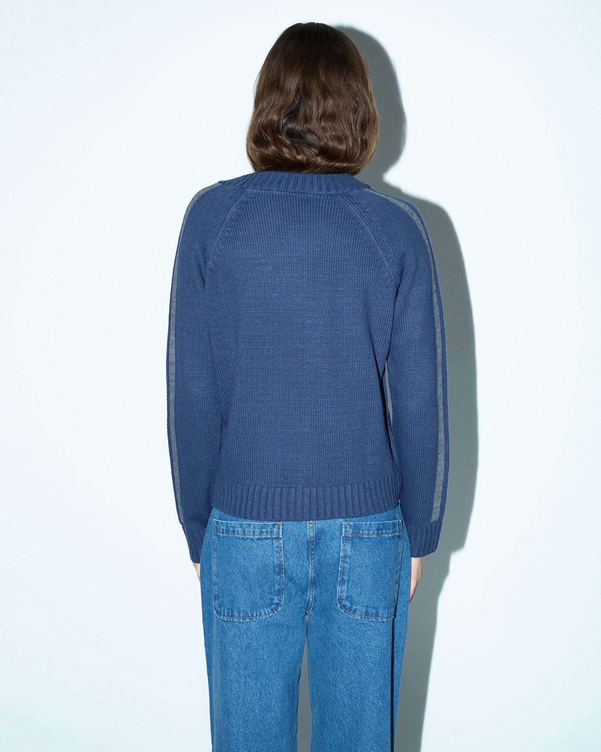 Jersey de punto de cuello redondo en color azul con detalle de rayas en color gris en las mangas.