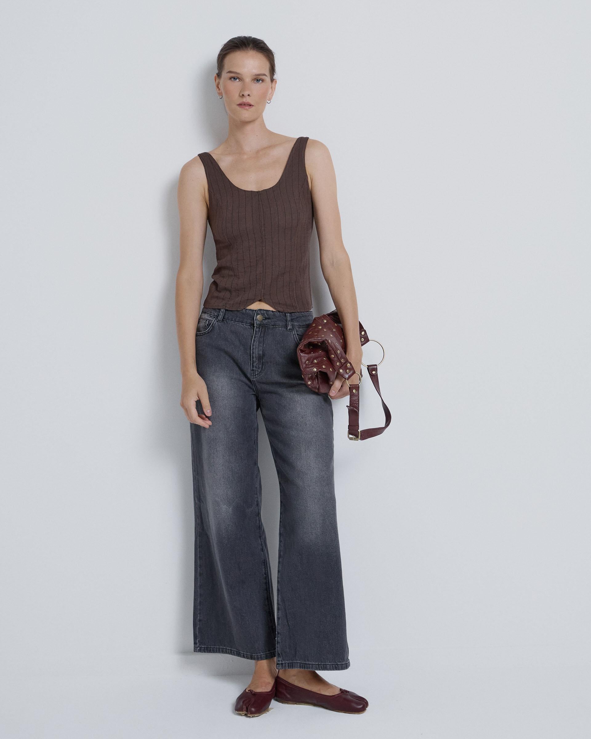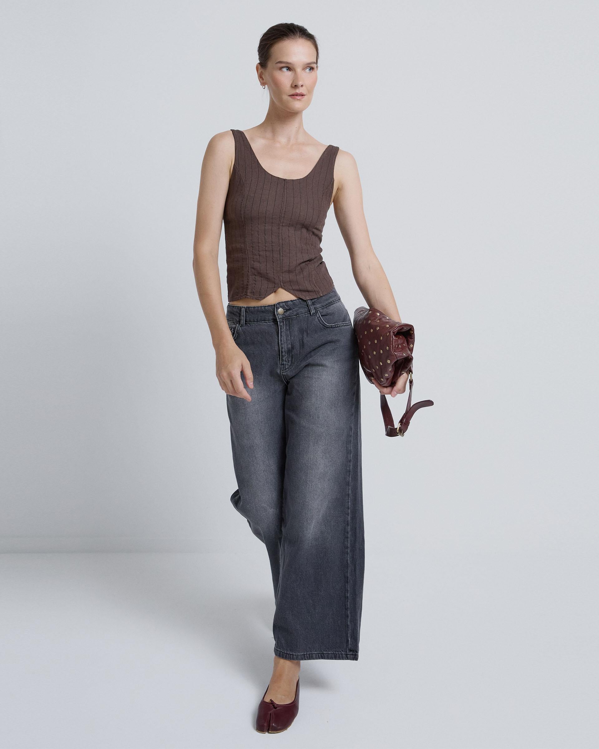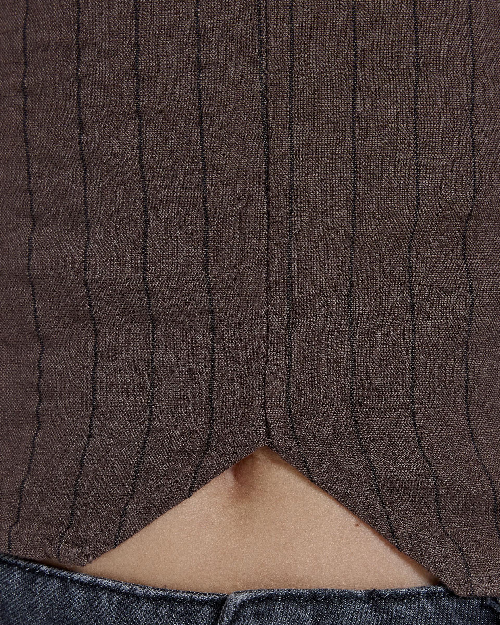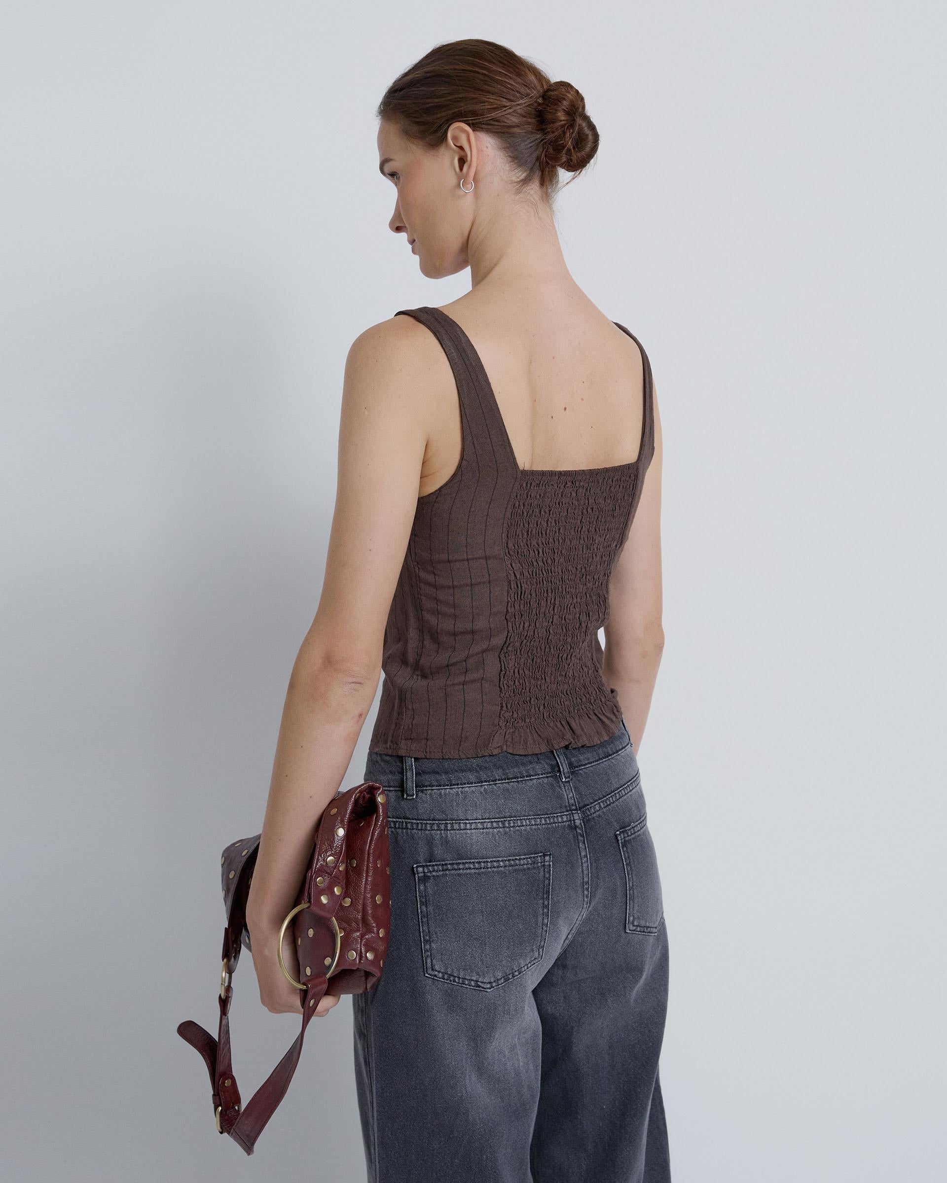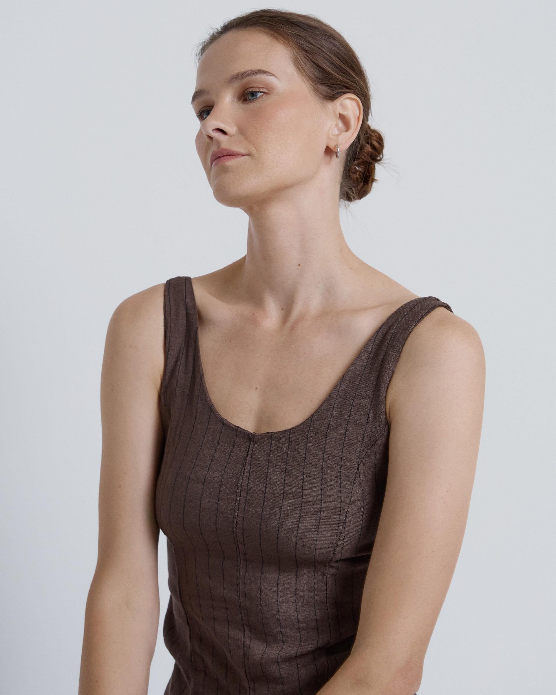 Top de tirantes de color marrón con rayas, cuello redondo, costuras laterales y detalle de pico en el bajo.